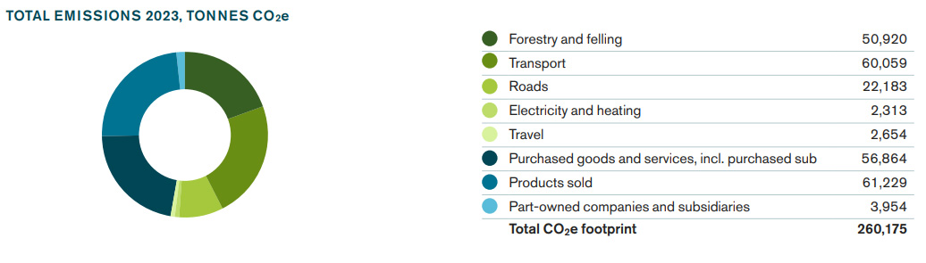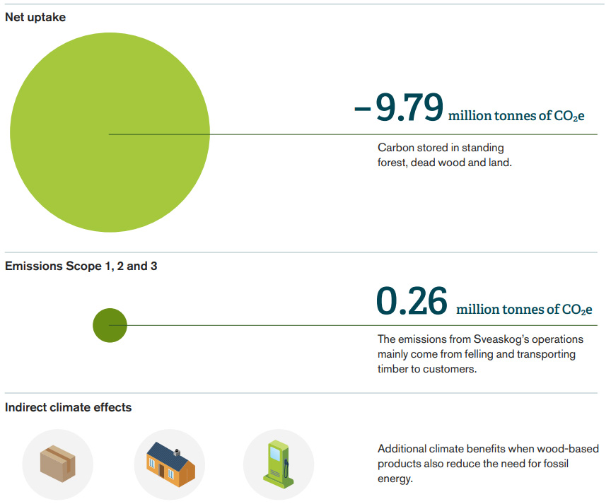 The climate benefits that arise when wood-based products are used instead of products that have a higher emission in connection with production, such as cement, are not included in Sveaskog’s operations and are therefore not reported. However, it is important to note that Sveaskog’s production of timber provides a major contribution on the way to a fossil-free society through the company’s customers’ operations and the use of wood-based products and bioenergy. The impact of the benefit depends on how effectively the wood raw material is used in the value chain through sawn timber, fibre products and bioenergy, all of which contribute to reducing the need for fossil energy and fossil-based materials.