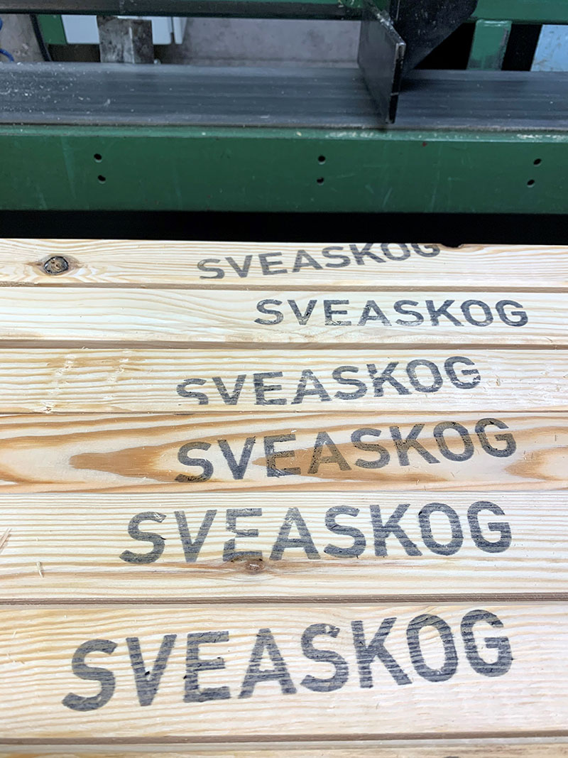 – Vi bollade lite olika alternativ och resultatet blev en enkel, hyvlad käpp med rundade hörn, gjord av furustav med råvara från Moelven, så det är inte osannolikt att det är Sveaskogs virke de har sågat. Utmaningen var att ta fram en stämpel med Sveaskogs företagsnamn att trycka på pinnarna, men två veckor efter att vi enats kunde vi leverera pinnarna.