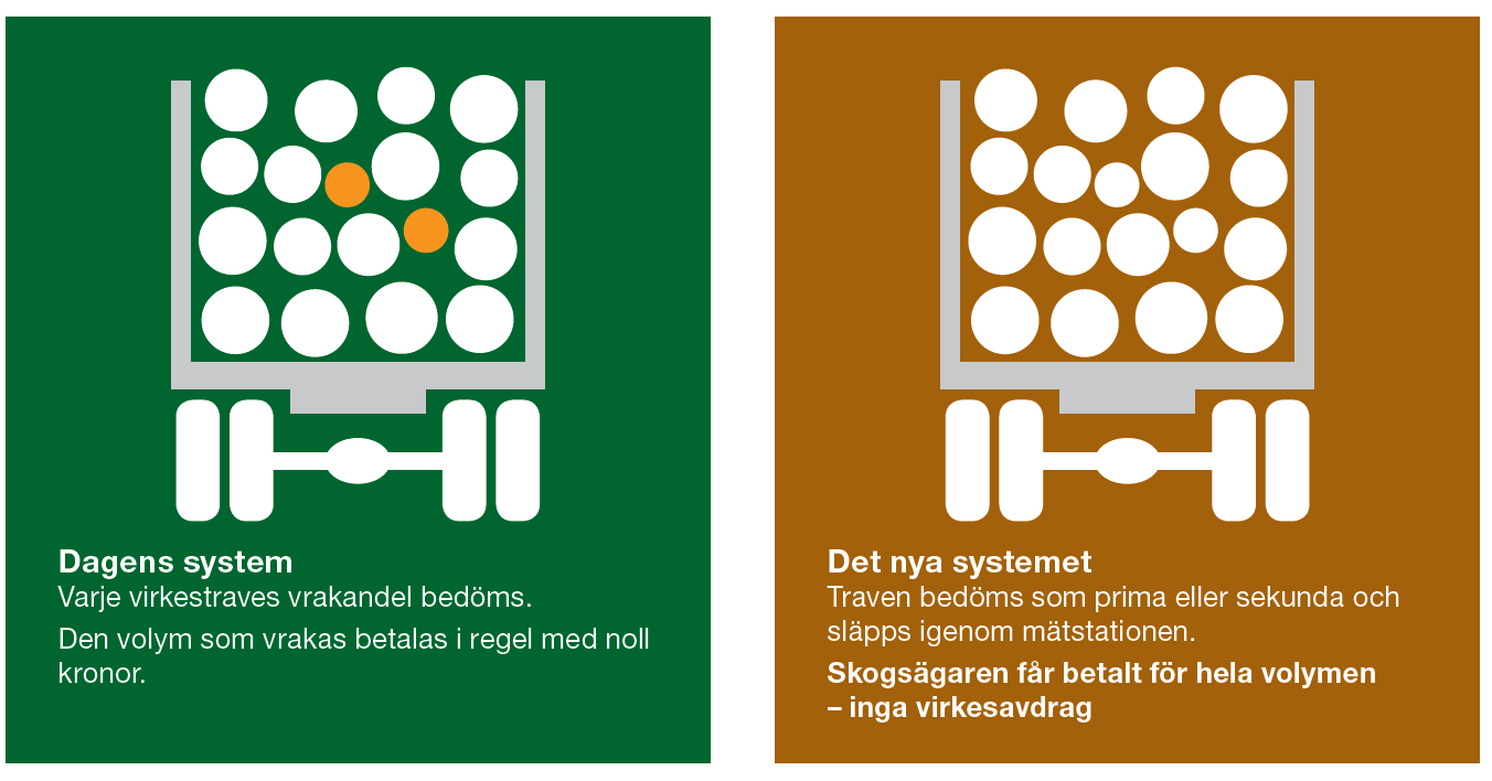 Den nya kvalitetsklassningen innebär att virkesmätaren bedömer kvaliteten för varje virkestrave på lastbilen. Traven klassas då som prima eller sekunda, eller i undantagsfall som utskott, och skogsägare får betalt för hela virkesvolymen. Det betyder att det nuvarande systemet med begreppet vrak och vrakandel – där en del av massaveden kunde klassas som vrak om den inte höll rätt kvalitet – försvinner.