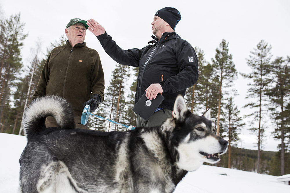 Jämthunden Arn välkomnar besökarna med ett skall. Husse Göran Fjellström kliver ut på förstubron och hyssjar honom.