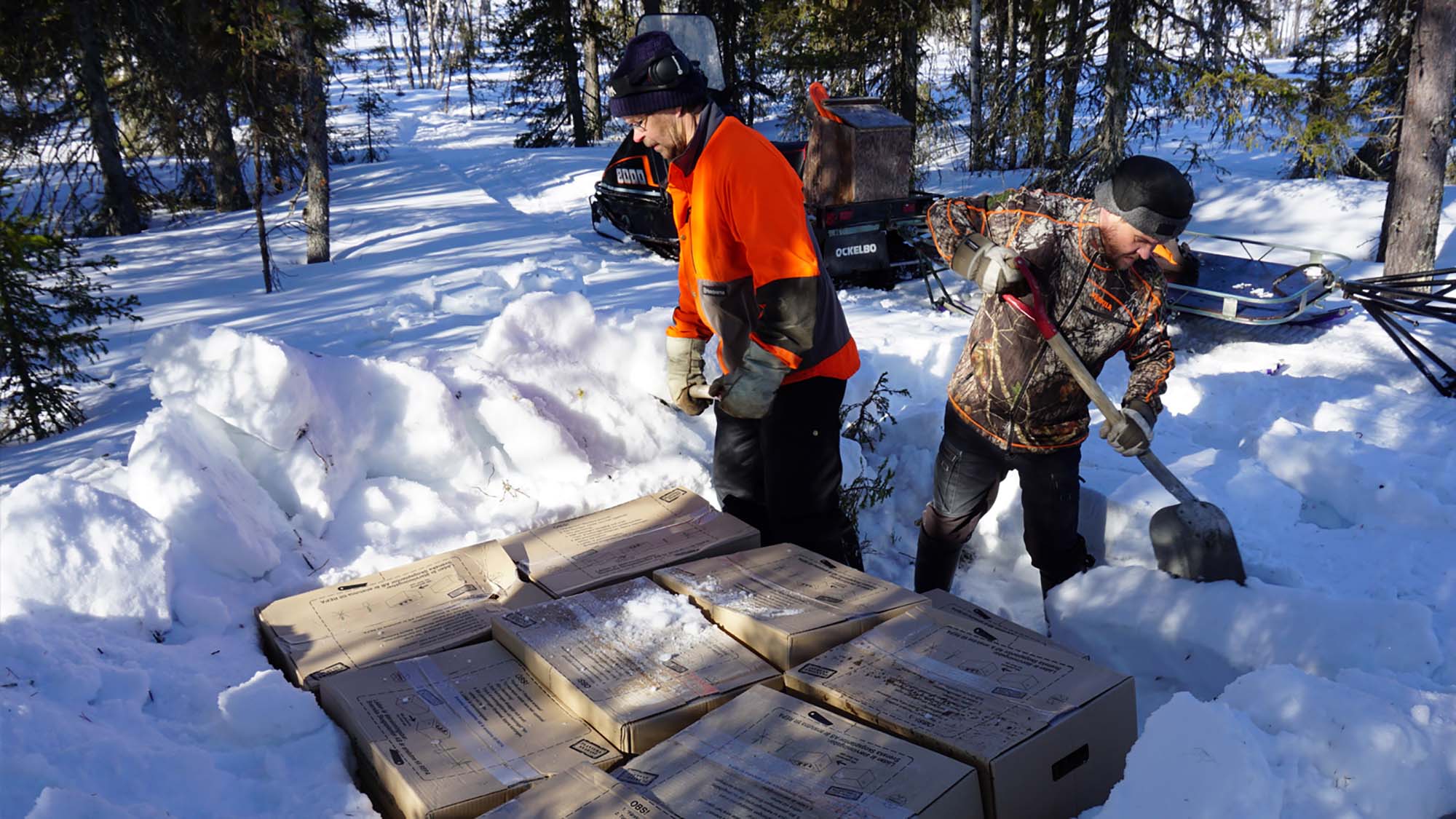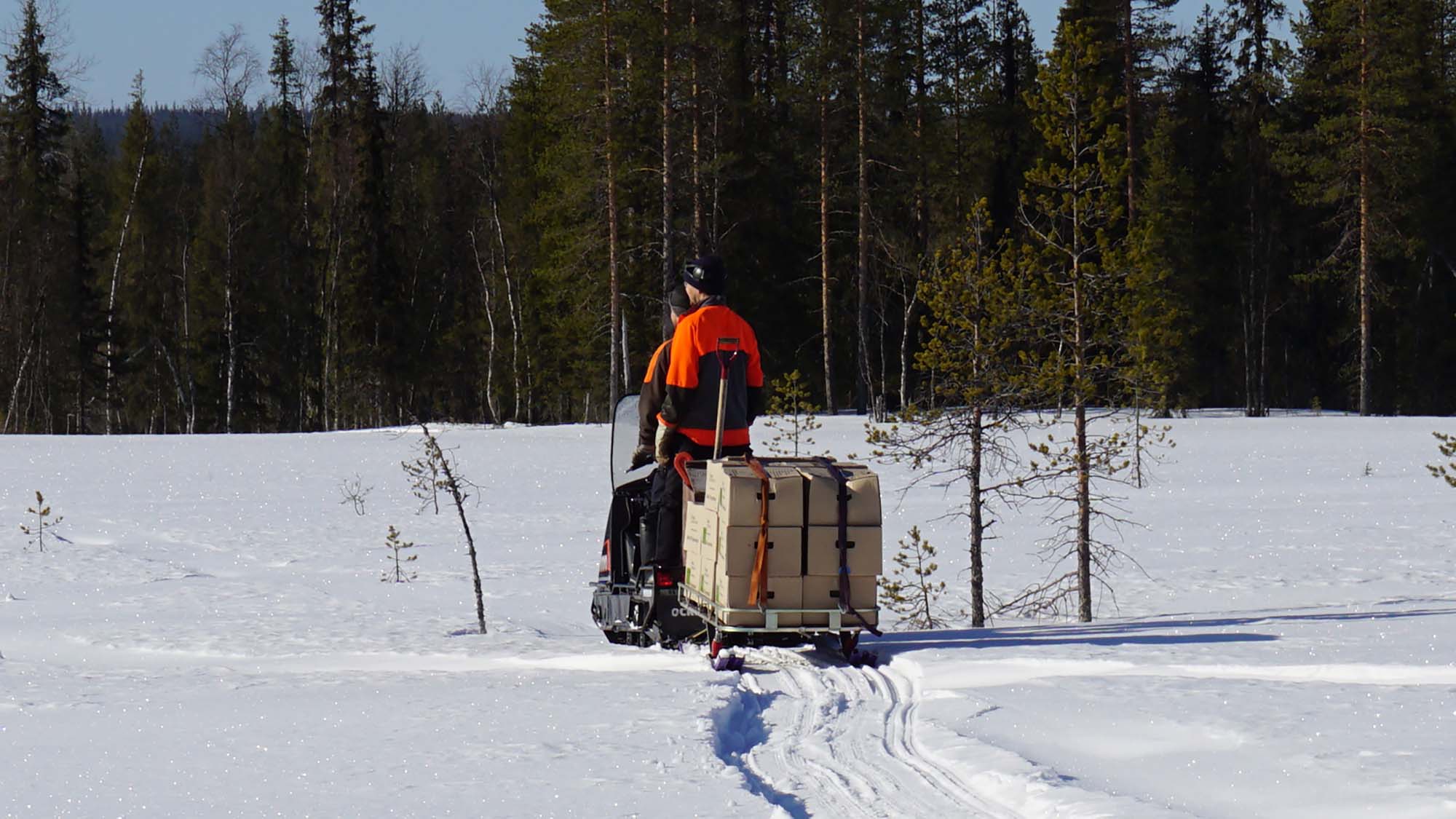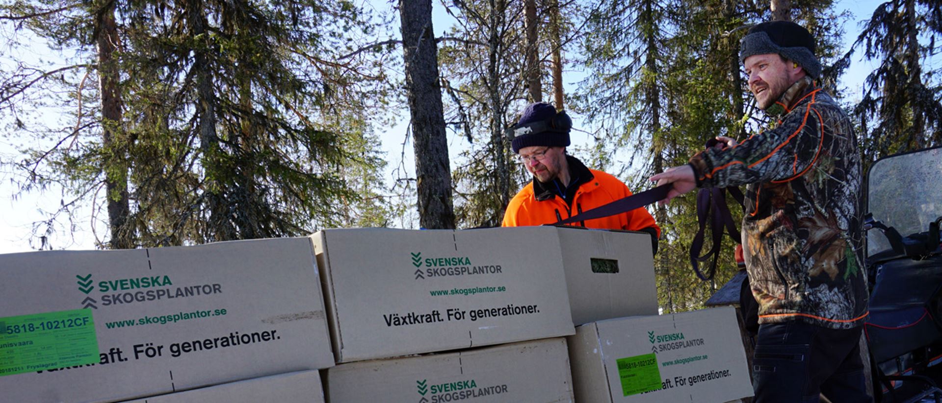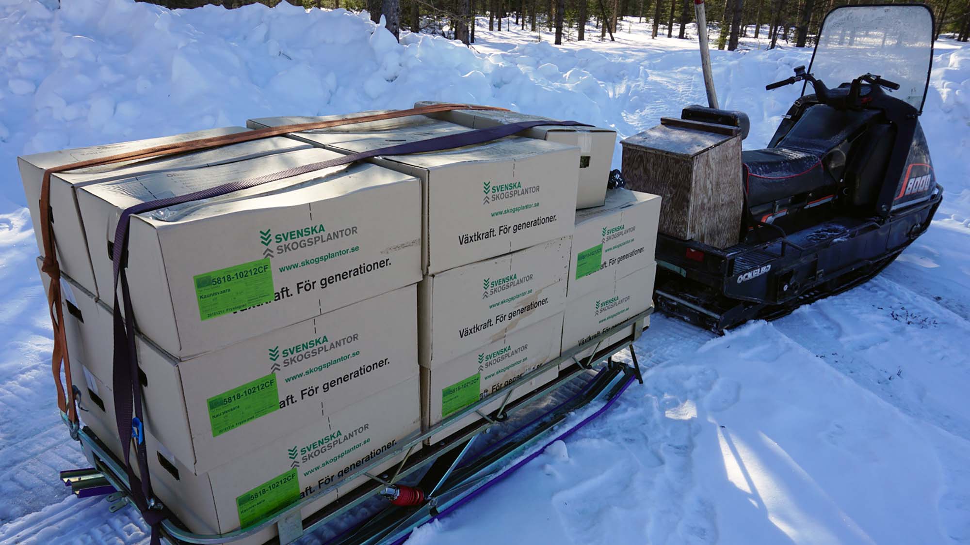 När det är långt till närmaste väg och en stor areal ska föryngras krävs det ofta manuell transport. Det ett oerhört tungt och tidskrävande arbete. Svenska Skogsplantor och Sveaskog distribuerar därför varje säsong "skoterplantor" som levereras med hjälp av skoter och släde till hygget på senvintern.
