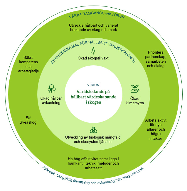 Vår vision är att vara världsledande på hållbart värdeskapande i skogen. För att nå dit strävar vi efter att på bästa sätt balansera ekologiska, ekonomiska och sociala värden. Det kan bli verklighet genom vår unika kompetens, storlek och kapacitet. För att försäkra oss om att vårt hållbara värdeskapande är världsledande jämför vi oss inte enbart med andra svenska skogsägare, utan blickar ut mot världen.