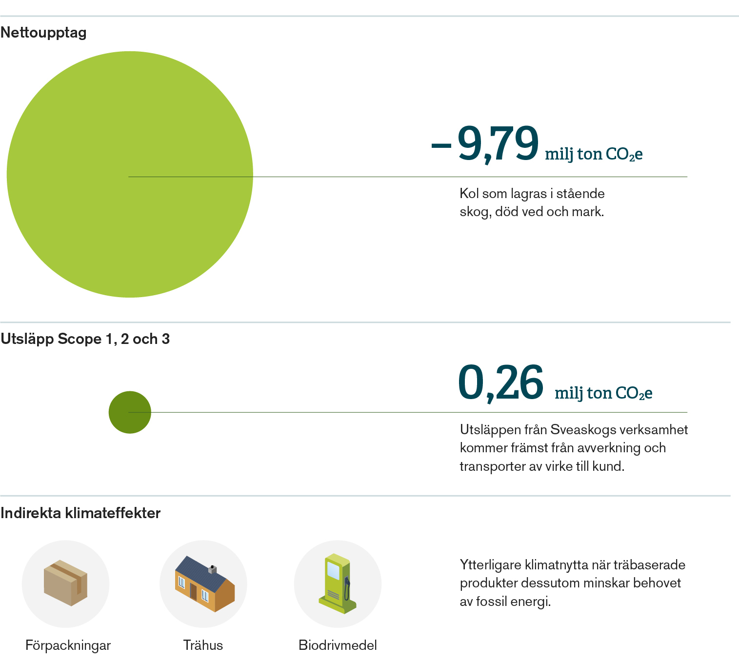 Den klimatnytta som uppstår när träbaserade produkter används i stället för produkter som har ett större utsläpp i samband med framtagandet, till exempel cement, ingår ej i Sveaskogs verksamhet och redovisas därför inte. Det är dock viktigt att uppmärksamma att Sveaskogs produktion av virke ger ett stort tillskott på vägen mot ett fossilfritt samhälle genom bolagets kunders verksamheter och användning av träbaserade produkter och bioenergi. Nyttans storlek beror på hur effektivt skogsråvaran används i värdekedjan genom trävaror, fiberprodukter och bioenergi vilka alla bidrar till att minska behovet av fossil energi och fossilt baserade material.