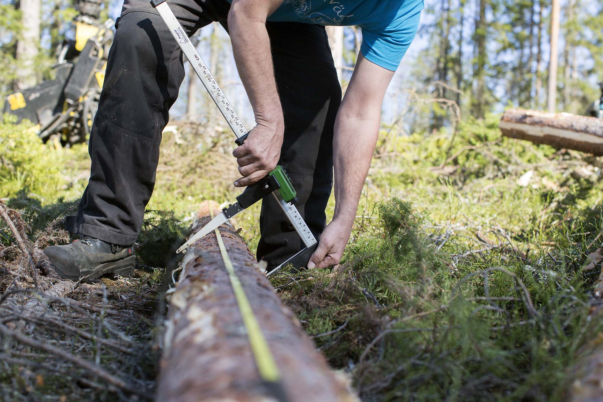 Olov greppar sin klave och sitt måttband och klättrar ner från skördarens styrhytt. Nu ska han upp till bevis: Hur väl stämmer den maskinella mätningen med verkligheten? Han mäter längden på den stock som maskinen valt ut slumpvis och tar fram ett medeltal på diametern med hjälp av klaven. Resultatet kommer upp automatiskt på klavens display.