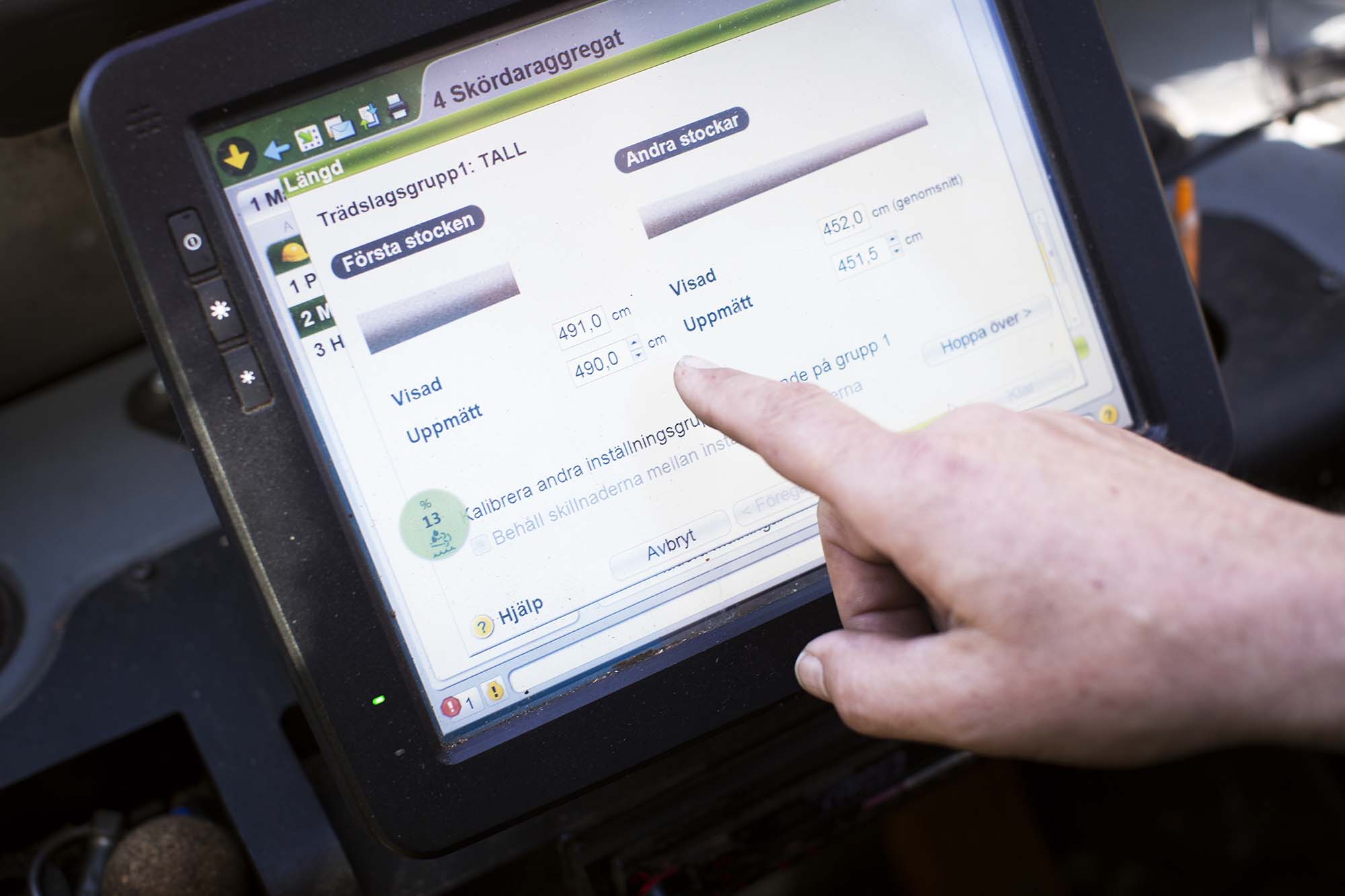 Tillbaka i skördarens styrhytt sätter Olov tillbaka klaven på sin plats och filen med manuella mätdata laddas upp. Resultatet används för kalibrering av maskinen, och på så vis förbättras precisionen när maskinen räknar ut rätt längder och volymer åt den aktuella kunden.