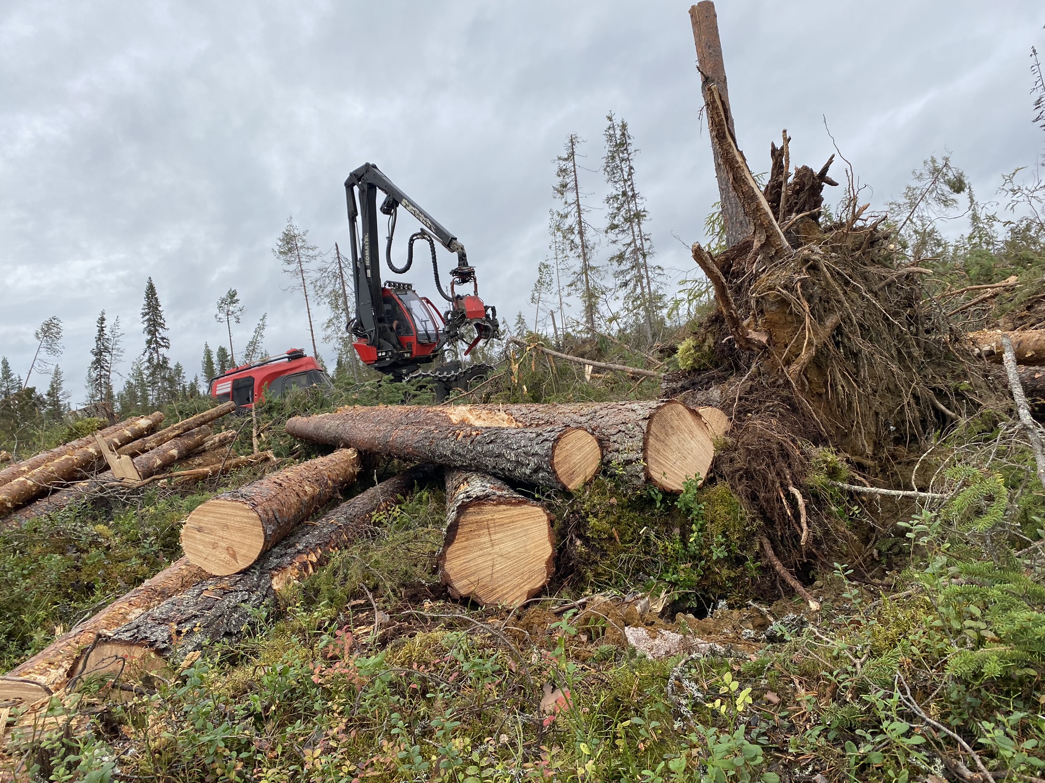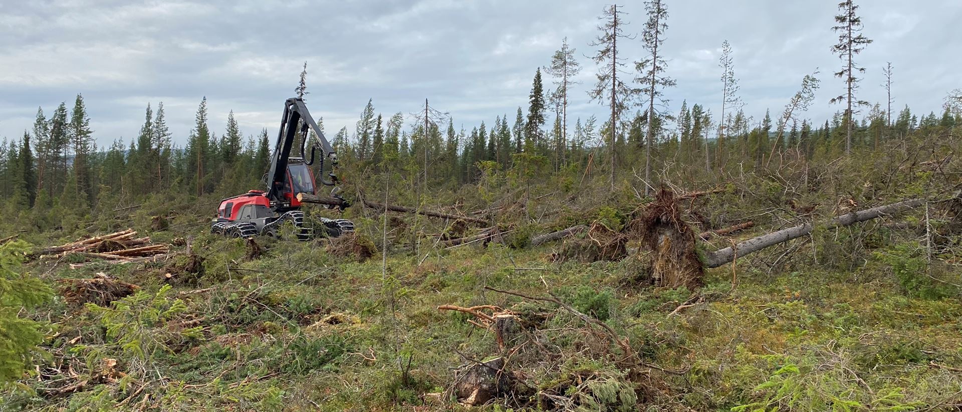 Men alla innovationer till trots, det är arbetet i maskinerna som gör att Sveaskog kan ta vara på virket och de stora värden som nu inte längre står upp utan mest ligger ner. En av maskinförarna är Johan Lundmark som kör skördare på området och tillhör ett av Sveaskogs egna lag med bas i Malå.
