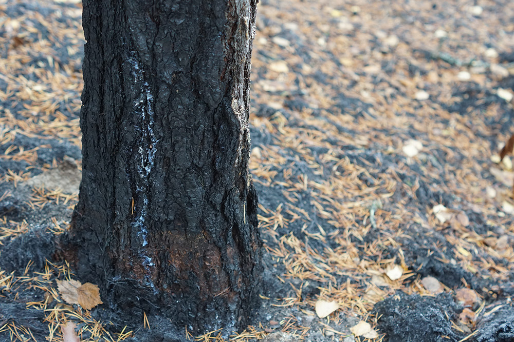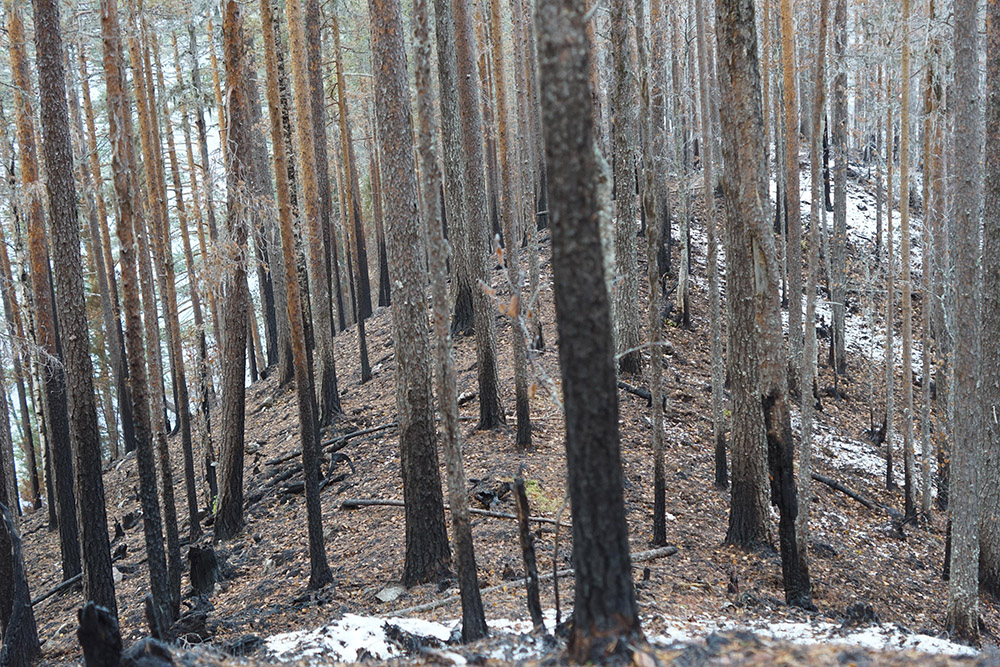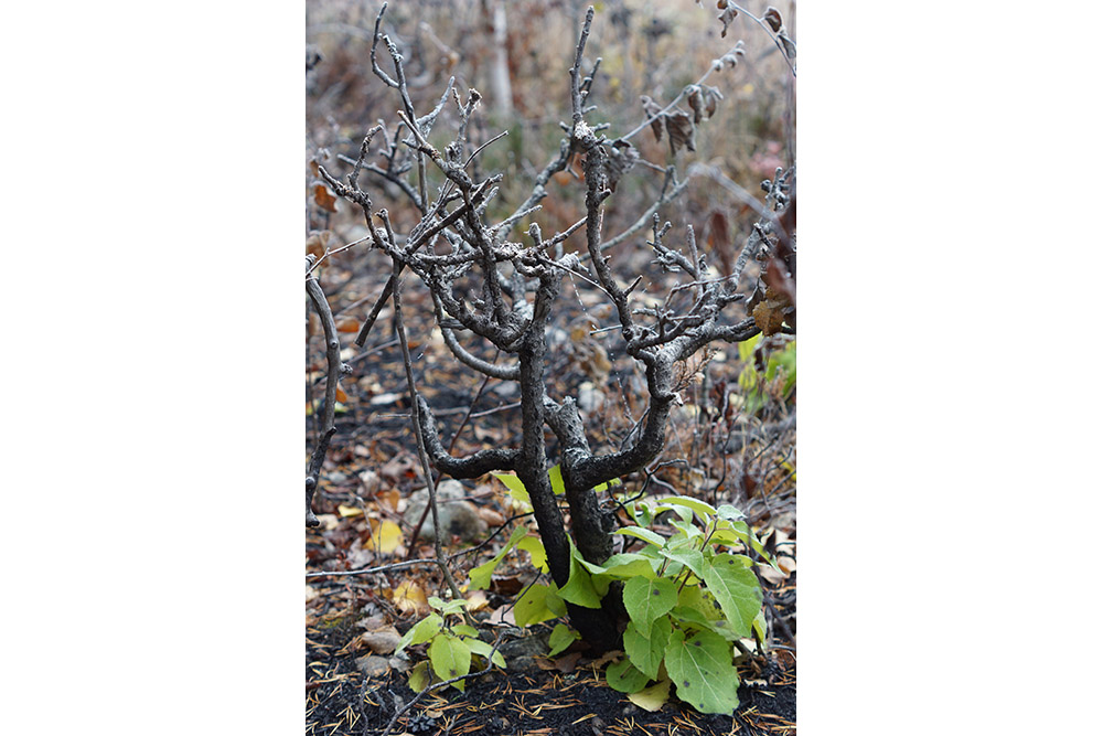 Från andra sidan sjön hörs gråspettens visslande. Den gäckande sången bildar en skön kontrast till de grenlösa svedda granarna och svarta envisa tallarna. Daniella stannar till bredvid en grupp med nerbrända stubbarna. För bland allt det svarta, finns viljestarka ivriga växter, som bildar färgrika klickar av grönt liv. Daniella Anderssons engagemang smittar av sig på oss.