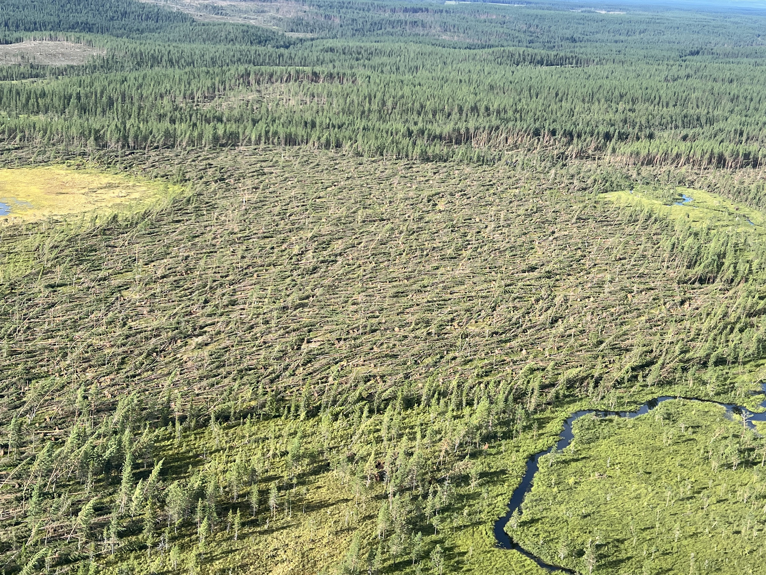 Omfattningen på det värst drabbade området är 4 x 70 km. Vi bekräftar den bild av skadorna som Skogsstyrelsen gett. Vi är den största markägaren i området, men givetvis har många andra markägare också drabbats hårt. Området sträcker sig från Bjurträsk i sydost och till Adak i nordväst.