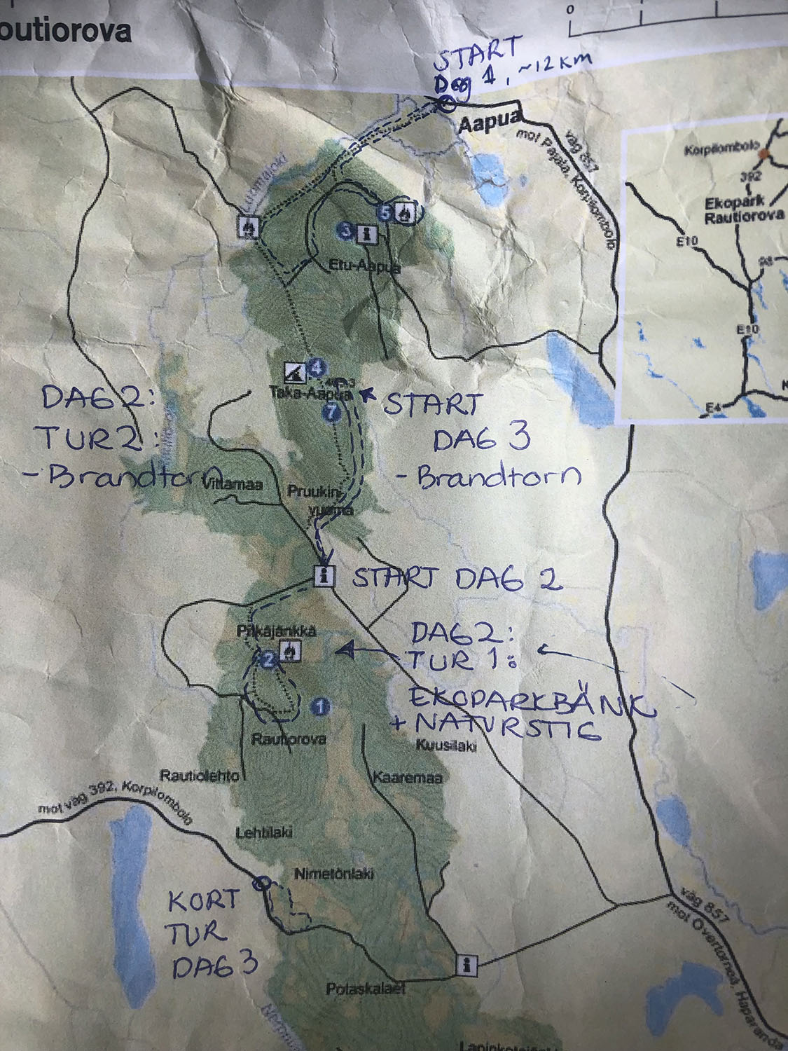 Något vi lärt oss på våra många vandringar tillsammans är att vi alltid vinner på att vara flexibla. Vårt motto är att det inte alltid blir som man tänkt sig men det blir ofta superbra ändå! Sagt och gjort; kartan studerades med nya ögon och efter att redan ha gått ca 12 km med tung packning beslöt vi oss för att ta bilen in i ekoparken dag 2. På så sätt skulle vi inte ha så långt att gå till toppen av Taka-Aapua där det enligt kartan skulle finnas ett fint vindskydd att sova i.
