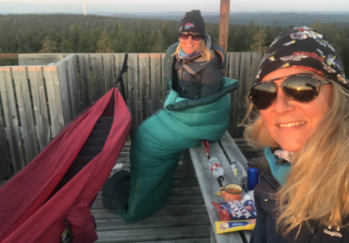Vi band fast våra hängmattor, med utsikt mot öster så vi skulle se Perseiderna som bäst, högst upp i brandtornet. Nedkrupna i våra dunsäckar och med en tarp virad runt oss för att hålla värmen vaggades vi till sömns av vinden. De gånger vi vaknade till under natten kändes det overkligt men härligt att ligga mitt i stjärnhimlen och inte under den… Vi såg båda ”stjärnfall” den natten. Magiskt!