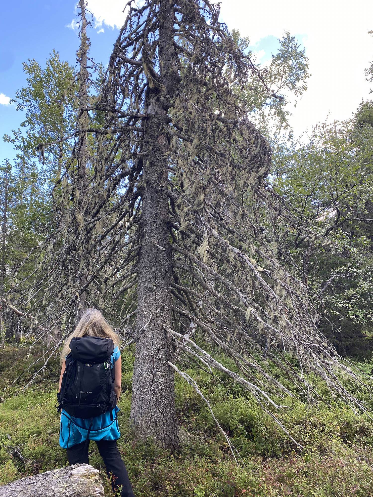 I den här delen av parken är det otroligt många lavar, både hänglavar och den fina lunglaven, som kännetecknar områden med bra luftkvalitet. Och till vår förtjusning blåbär, mer blåbär och ytterligare mer blåbär. Den grillplats som är utmärkt som ”grillplats med utsikt” på norra sidan av Etu-Aapua var mestadels igenväxt och erbjöd inte den häpnadsväckande utsikten vi hoppats på.