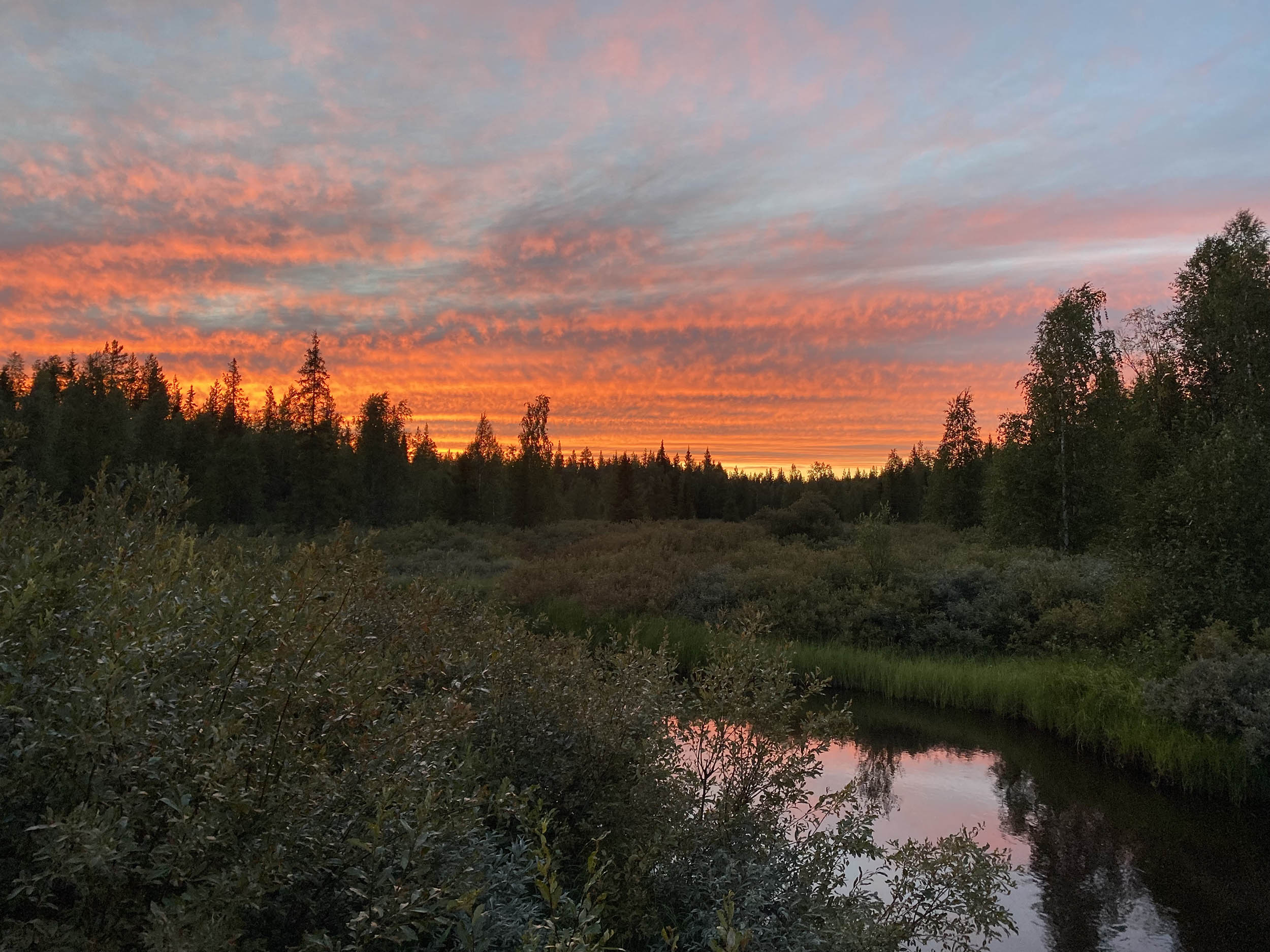 Vi vaknade tidigt och eftersom vi frös lite bestämde vi oss för att inta dagens frukostplanka på marken. Det var skönt att komma ner och värma upp sig innan vi gick tillbaka mot infotavlan. Nu tog vi bilen mot den södra delen i hopp om att hitta fina myrar. Vi hade dock svårt att hitta någon bra väg att gå här så efter att ha plockat både blåbär och hjortron bestämde vi oss i stället för att vi var värda ett dopp i sjön Syväjärvi på väg tillbaka till Norrskenskojan.