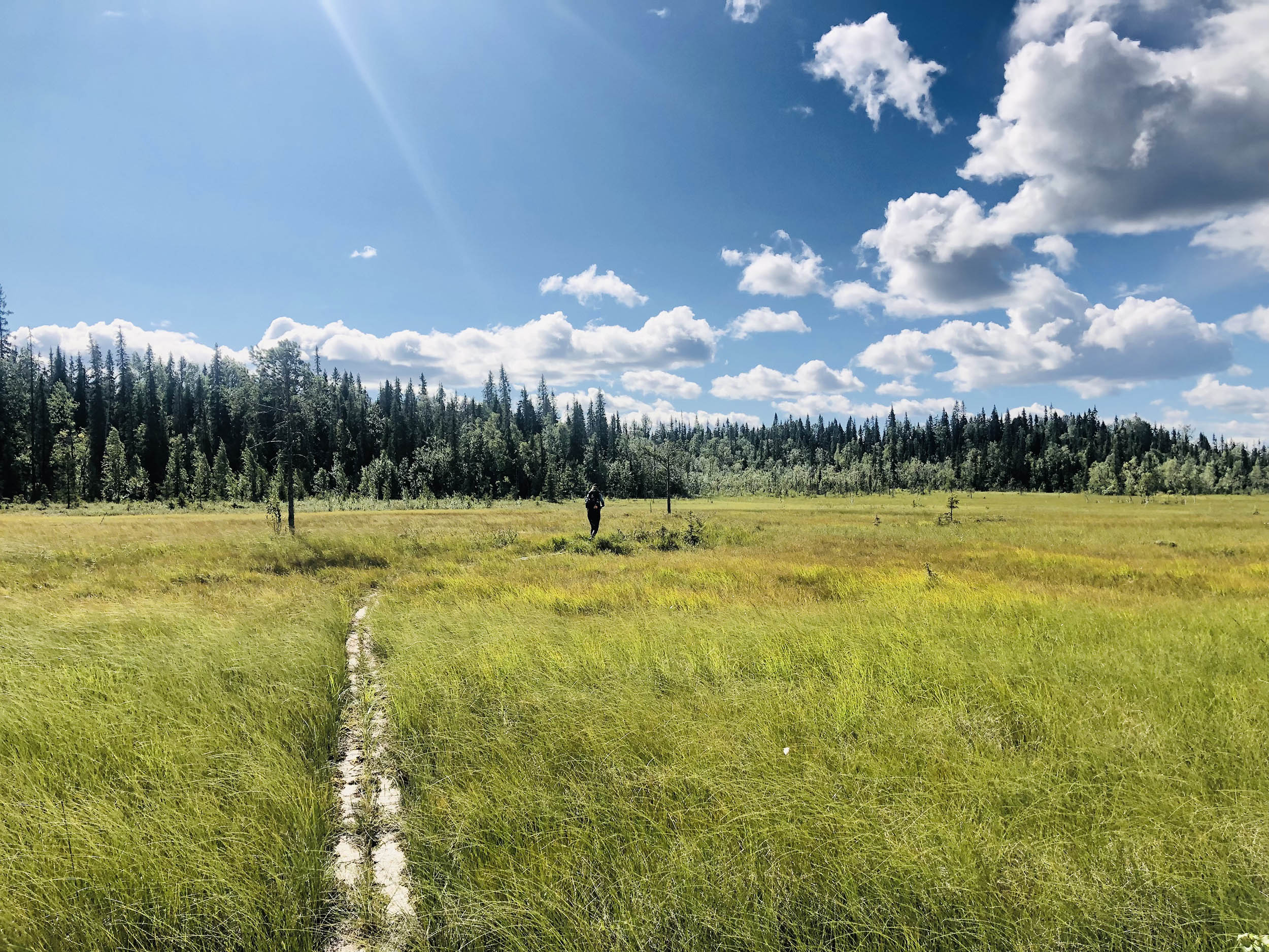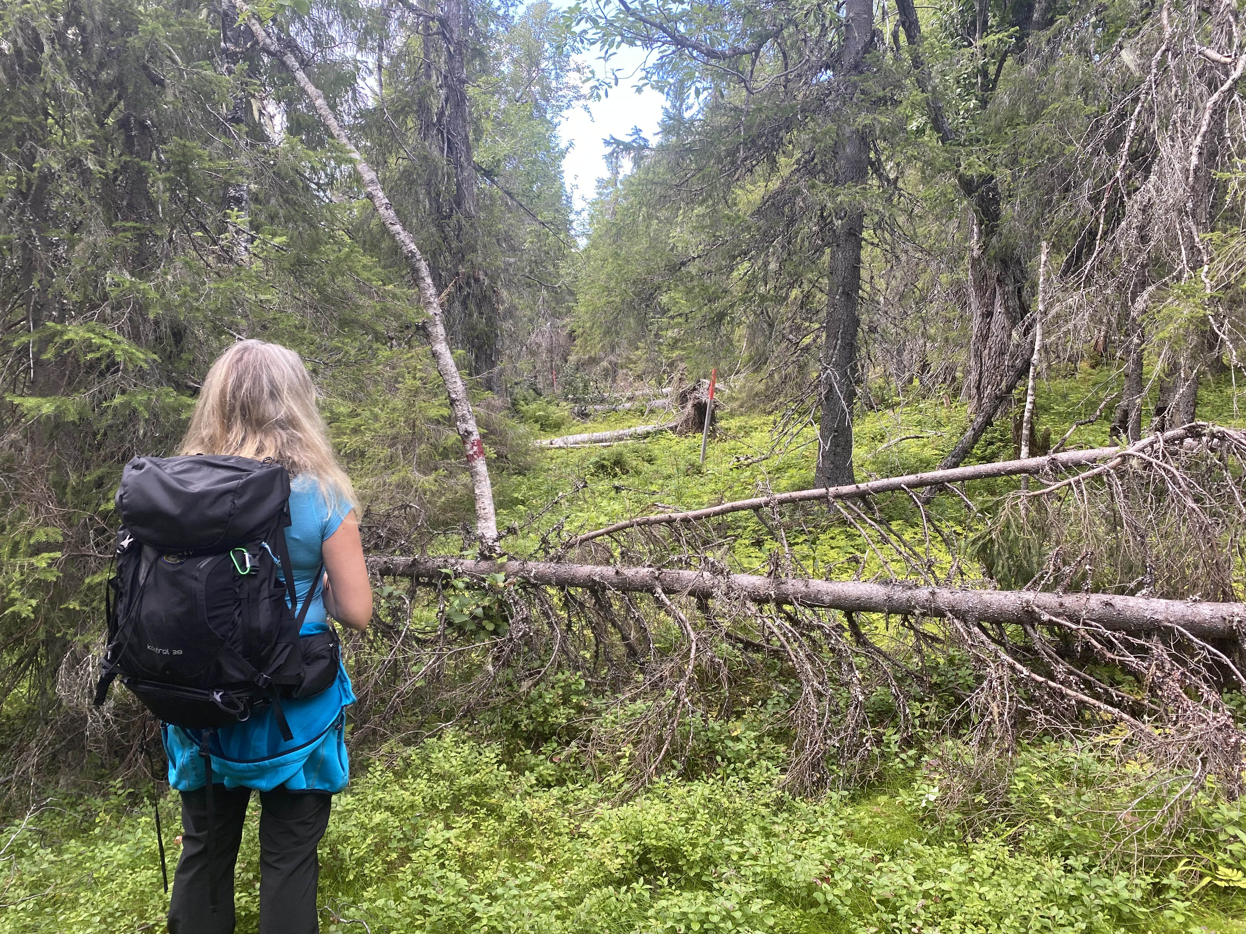 Efter bara någon kilometer kom vi till i princip otrampad mark. Svårgenomtränglig och vildvuxen. Om det inte var för att vi såg de röda markeringarna på träden hade vi aldrig kunnat tro att vi var på rätt väg. Det tar tid att gå i den här typen av terräng – något helt annat än vi är vana vid sedan tidigare. Med ryggsäckarna fulla av övernattningsgrejer och därtill en vattendunk och ved blev det tunga steg framåt efter ett tag – vilket myggen uppskattade.
