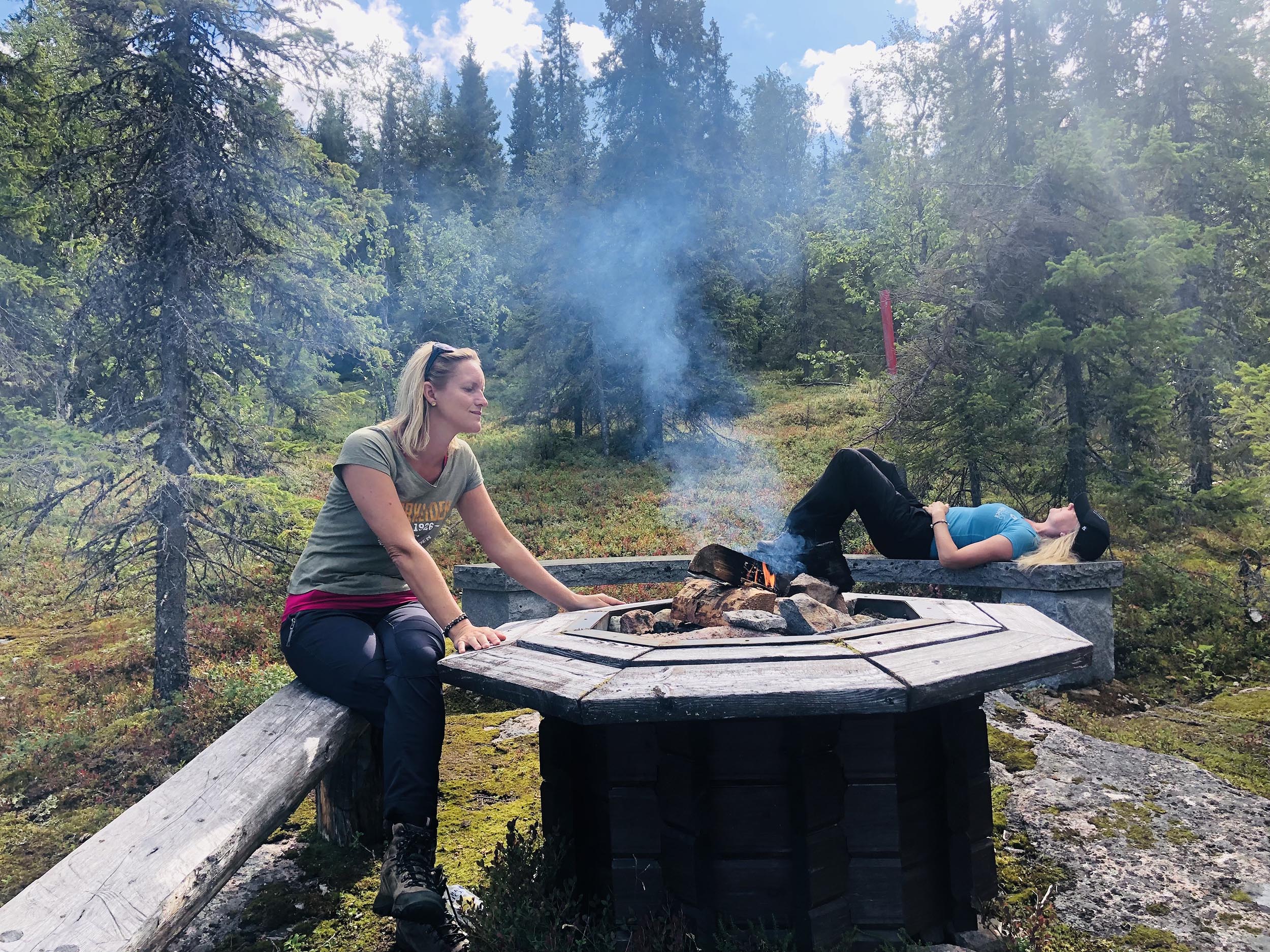 Vi beslöt att dela upp dagen i två delar. Först gick vi mot ekoparkbänken, där vi grillade oss en välförtjänt korvlunch och efterrätt i form av marshmallows. På vägen upp finns en kallkälla, som tur var är denna uppmärkt då det överlag är väldigt ont om vatten i parken. Efter lunch gick vi naturstigen runt Rautiorovas norra topp. Miljön i den här delen av parken upplevde vi som finare än kvällen innan, mer öppet och aningen mer lättgånget; skäggig urskog och miljarder blåbär.
