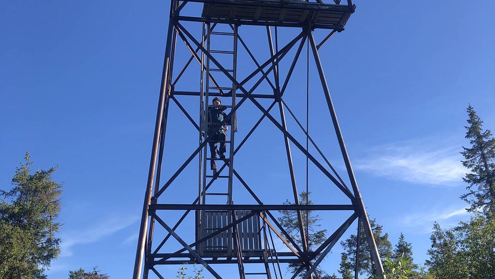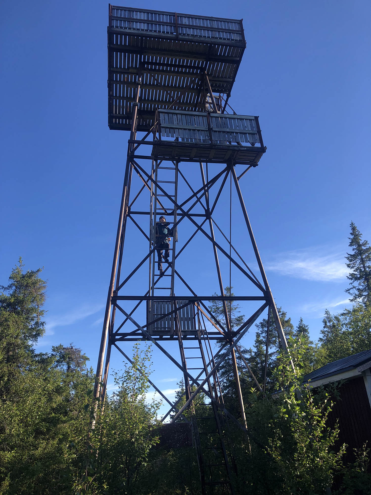 Så plötsligt öppnade sig skogen och brandtornet uppenbarade sig. Högst upp hade vi milsvid utsikt åt alla håll; urskog och vindkraftverk så långt man kunde se! Det här var verkligen resans höjdpunkt i dubbel bemärkelse!