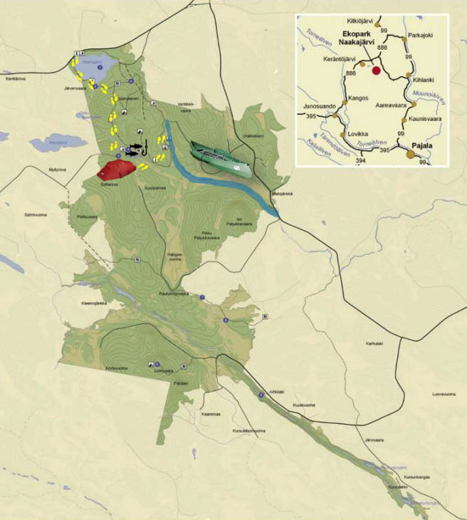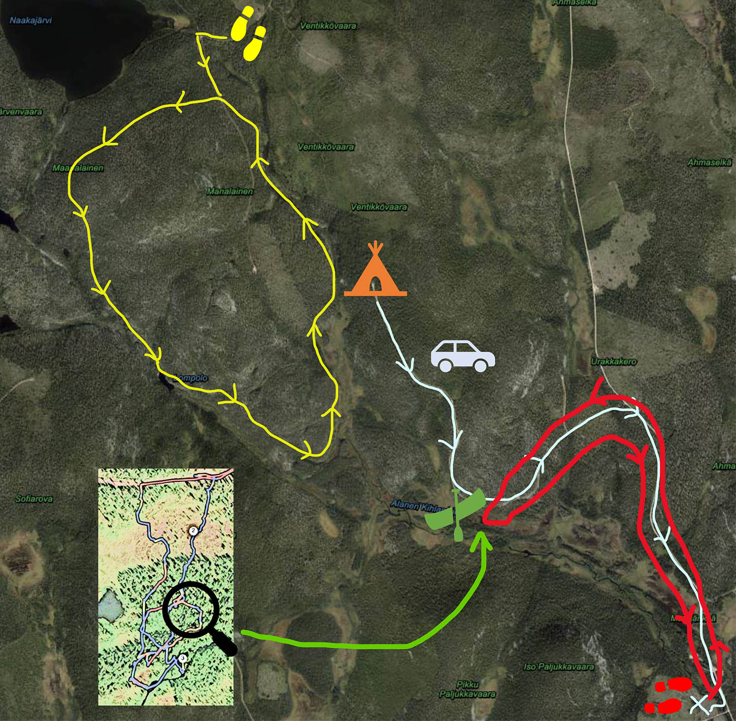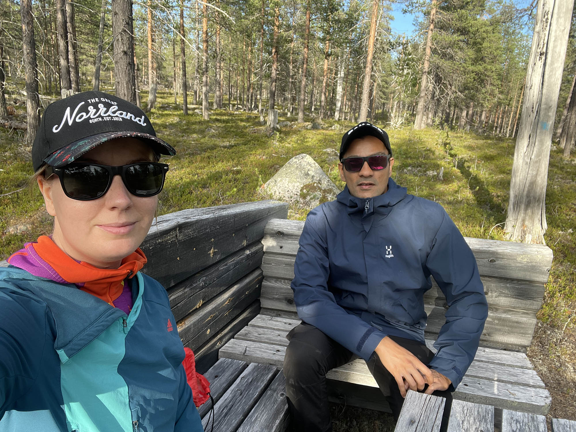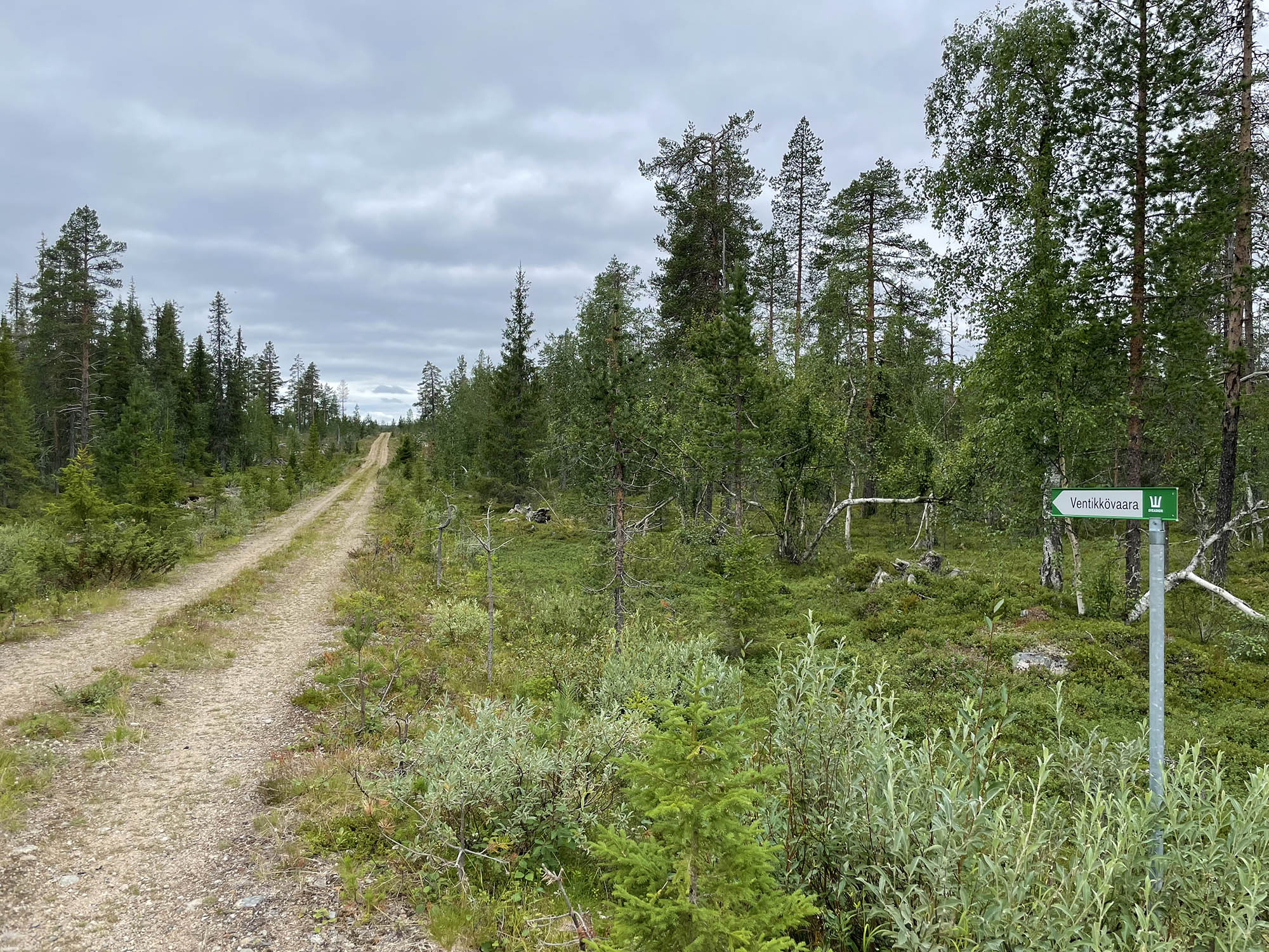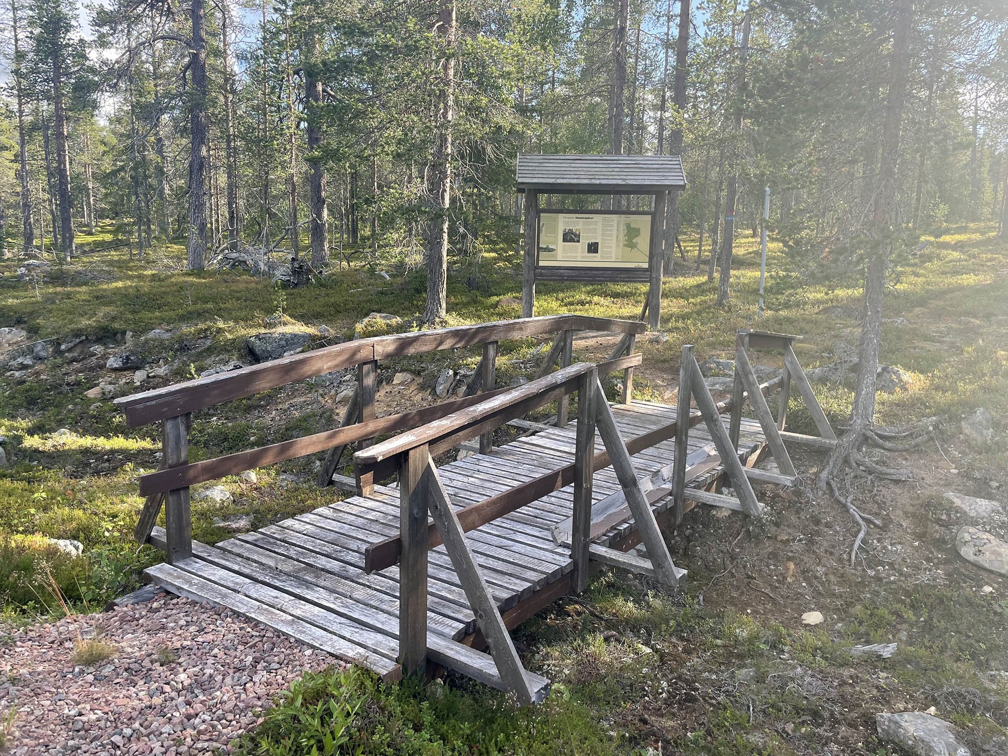 På förmiddagen packade vi bilen och begav oss mot Naakajärvi. Vi körde längs gränsälven Muonio och närmade oss parken från Kihlangi-hållet, på en grusväg som går mellan Kihlangi och Naakajärvi, där vår resa till fots skulle börja. Här hade vi aldrig varit tidigare, och efter att ha studerat ekoparkskartan såg vi verkligen fram emot att se alla sevärdheter. Vi valde att börja mot ekoparksbänken och ta den längsta leden därifrån. Stigen var väl utmärkt så det gick lätt att hitta hela vägen.