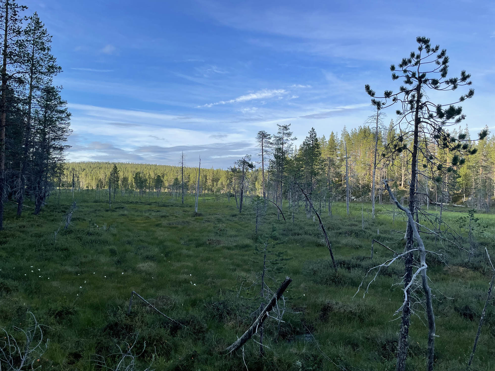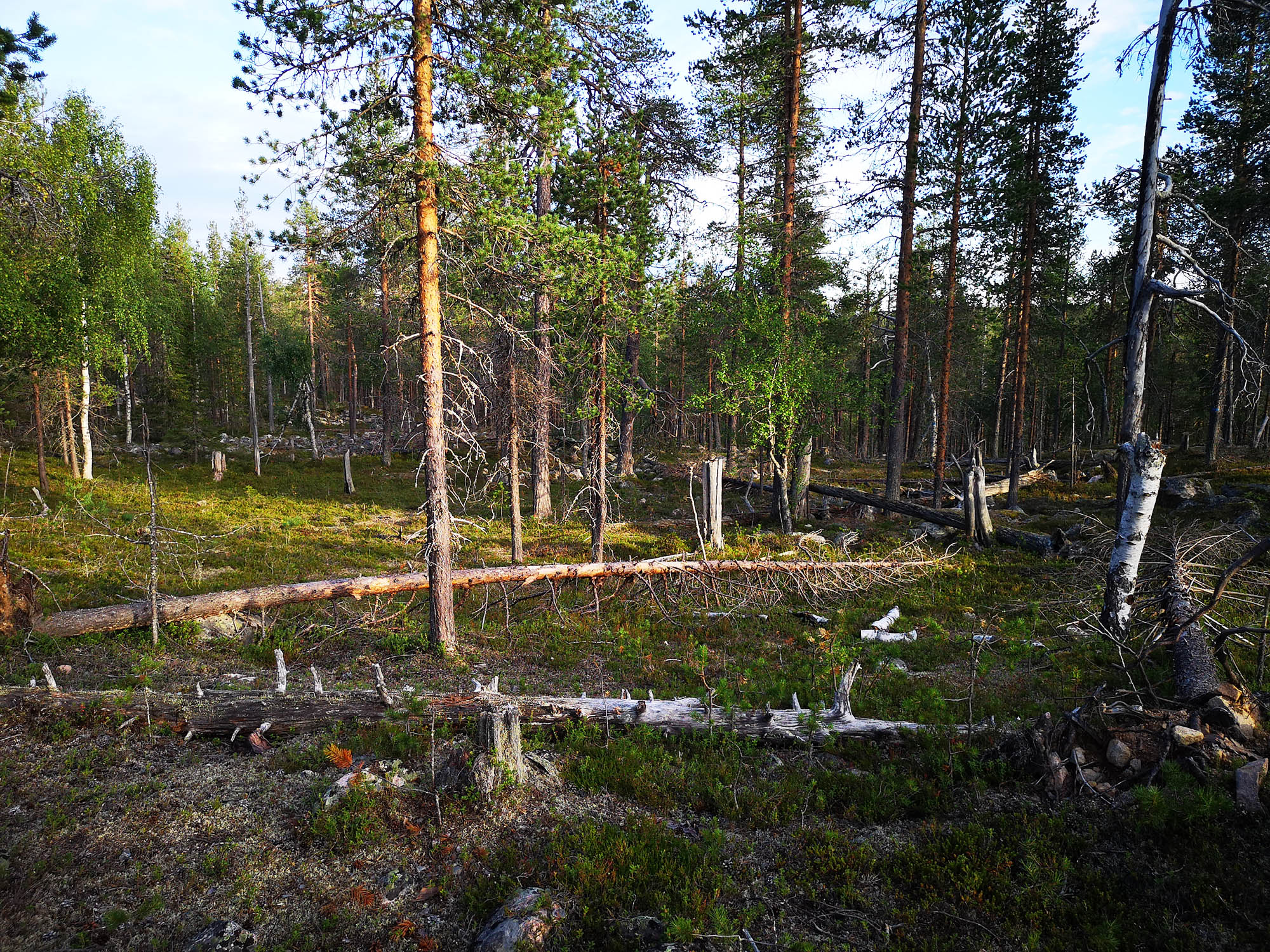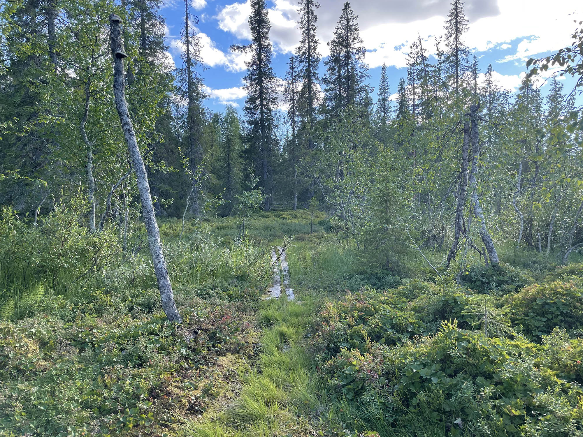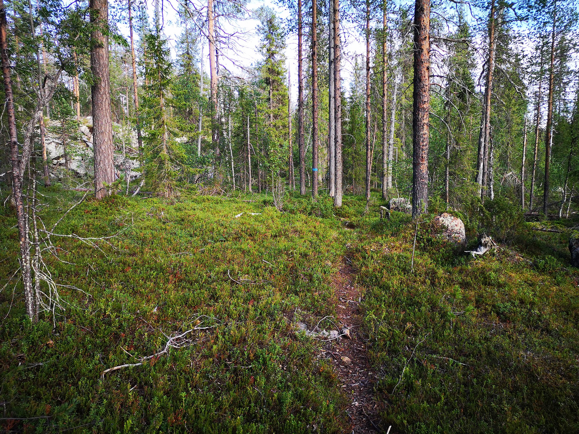 Sträckan mellan Maanalainen och Ventikkövaara var nog dagens jobbigaste passage, stigen blockerades av hundratals fallna träd. Ibland fick vi gå ut på myrkanten och ibland var det svårt att följa stigen då träden med markeringen har också fallit omkull. Men det växte hjortron längs myrkanten, så lyxigt och gott! Härifrån kunde vi även se vår valda tältplats på andra sidan myren, en skön känsla att veta att snart får vi vila då vandringen tog på kraften.