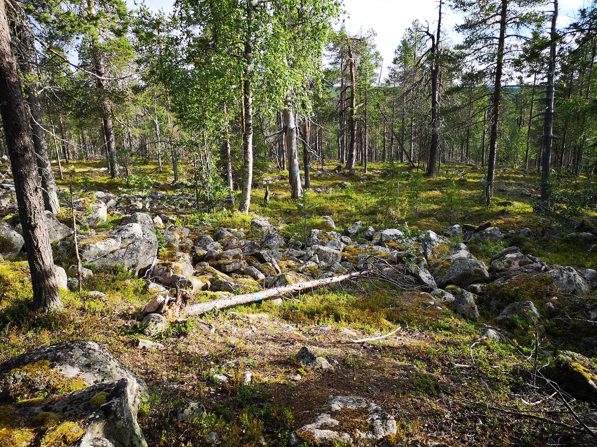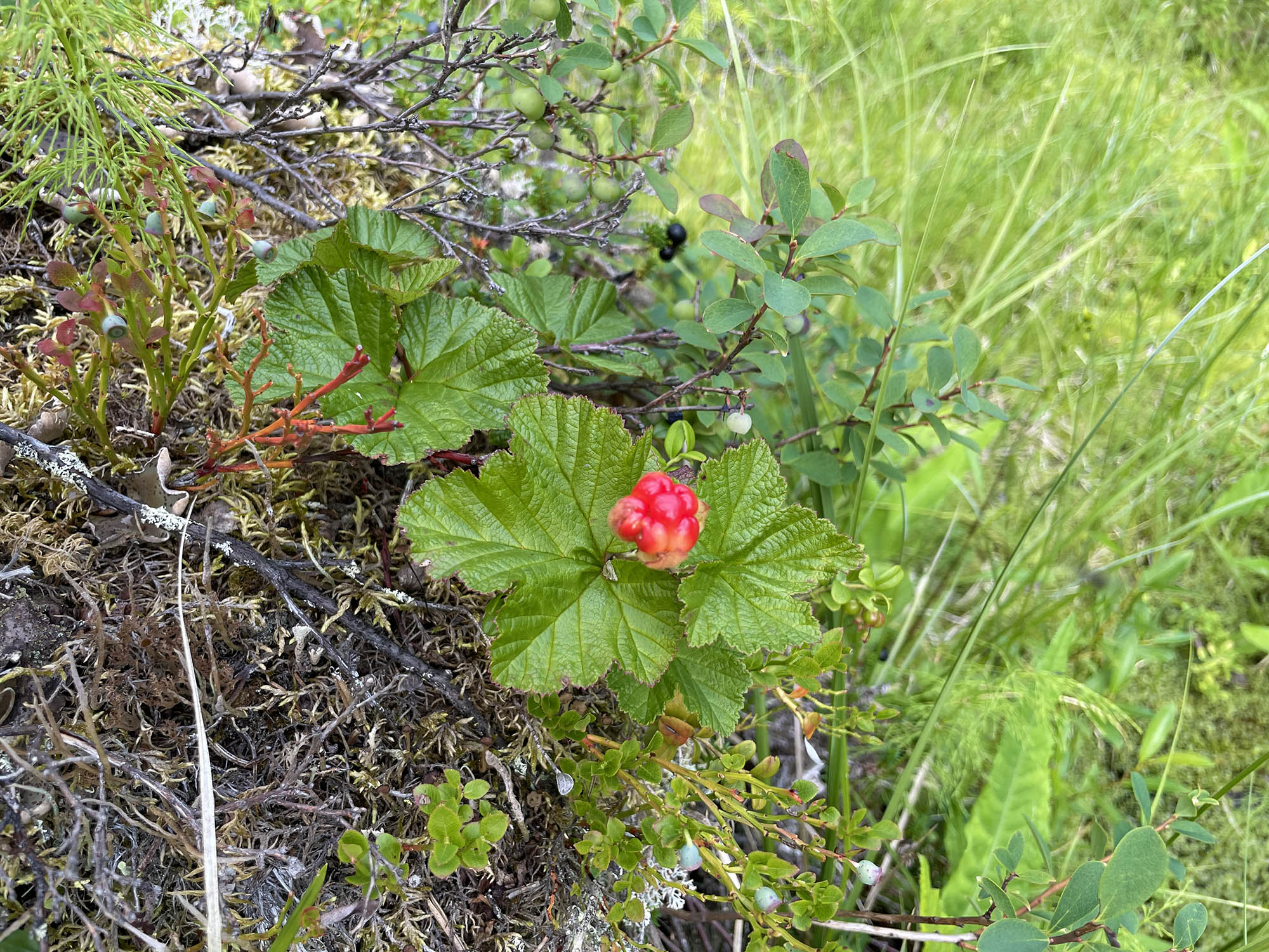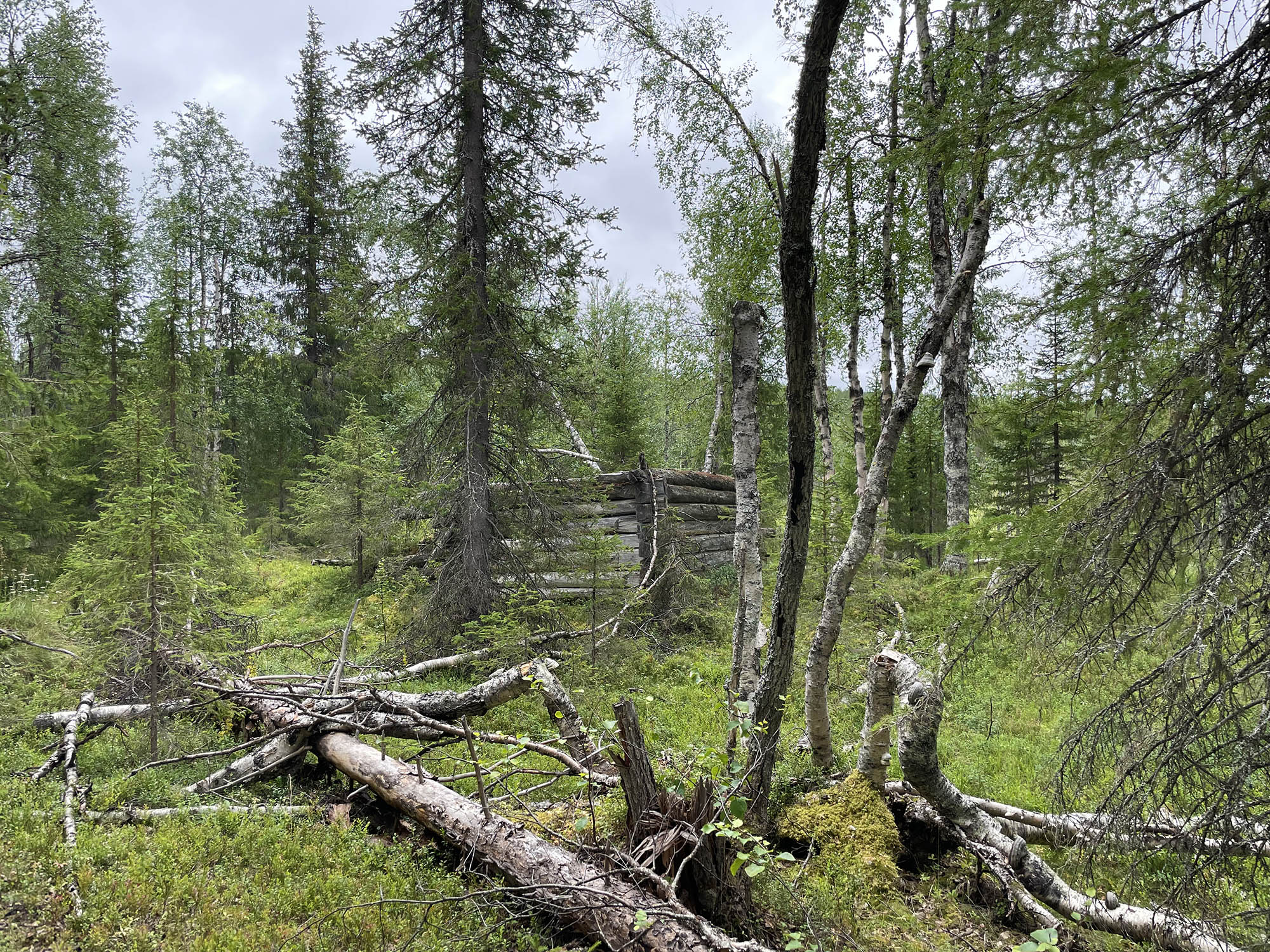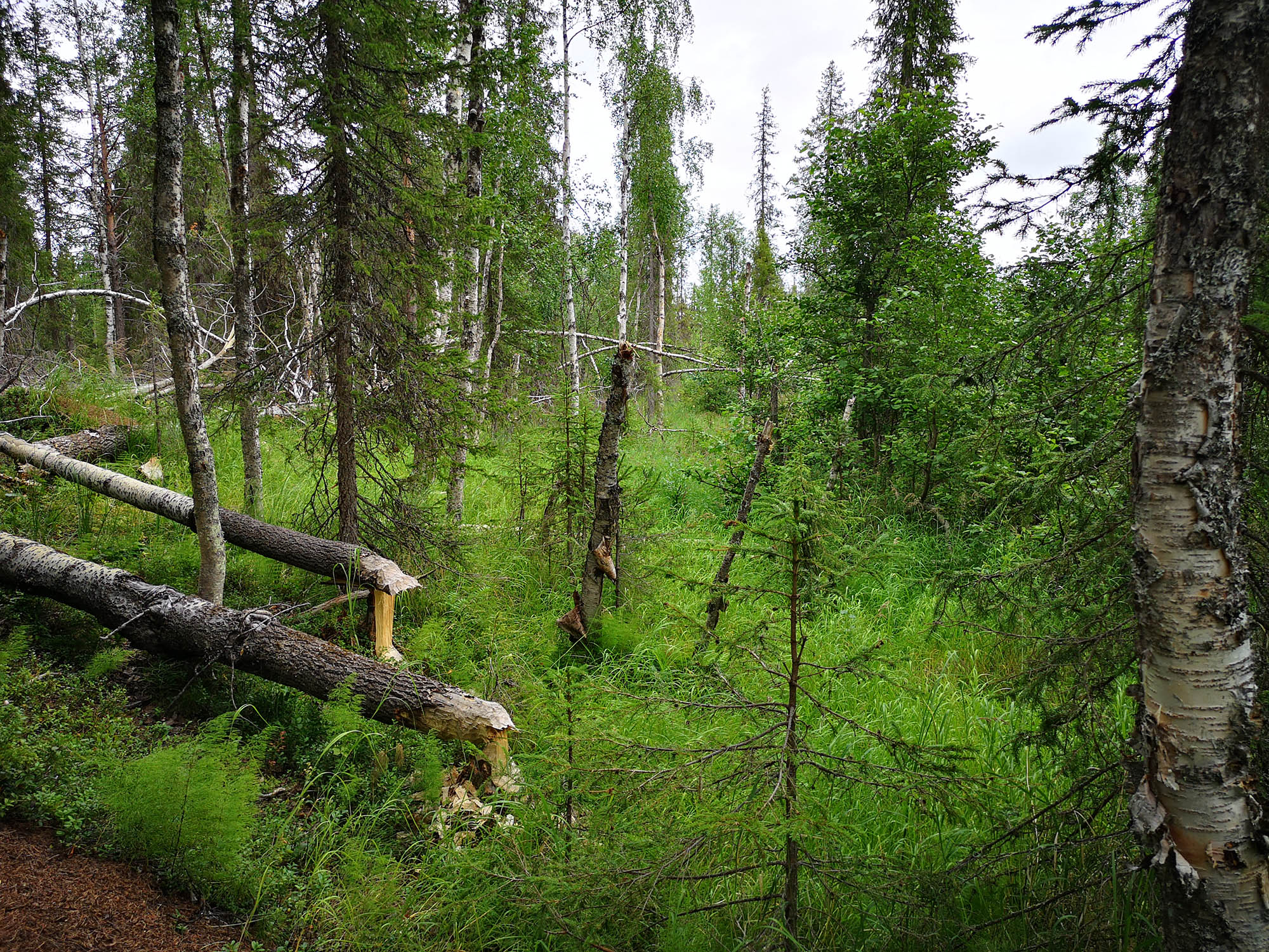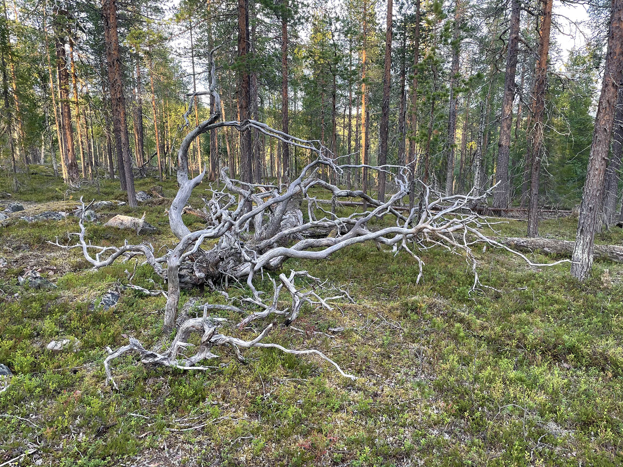 Sträckan mellan Maanalainen och Ventikkövaara var nog dagens jobbigaste passage, stigen blockerades av hundratals fallna träd. Ibland fick vi gå ut på myrkanten och ibland var det svårt att följa stigen då träden med markeringen har också fallit omkull. Men det växte hjortron längs myrkanten, så lyxigt och gott! Härifrån kunde vi även se vår valda tältplats på andra sidan myren, en skön känsla att veta att snart får vi vila då vandringen tog på kraften.