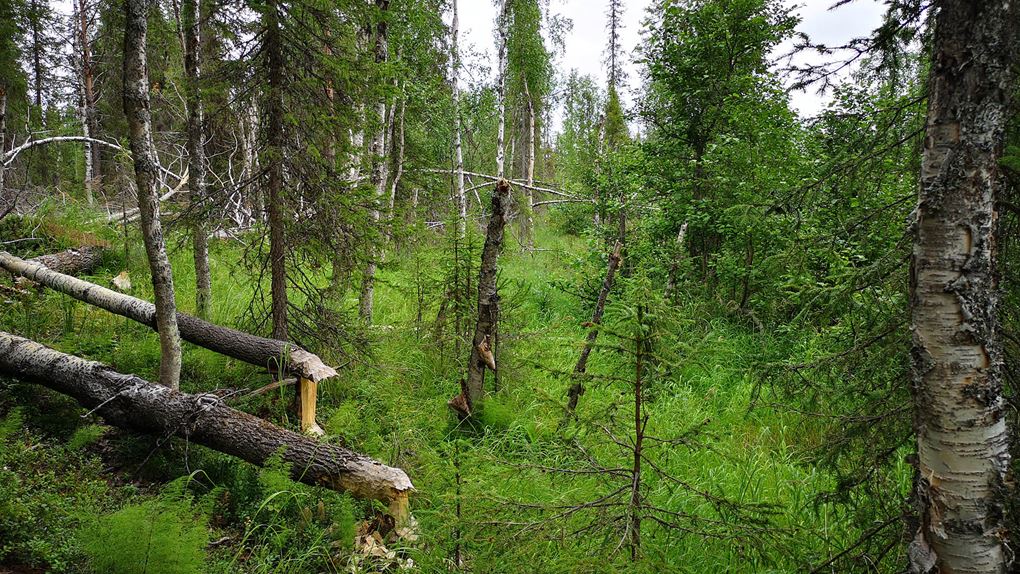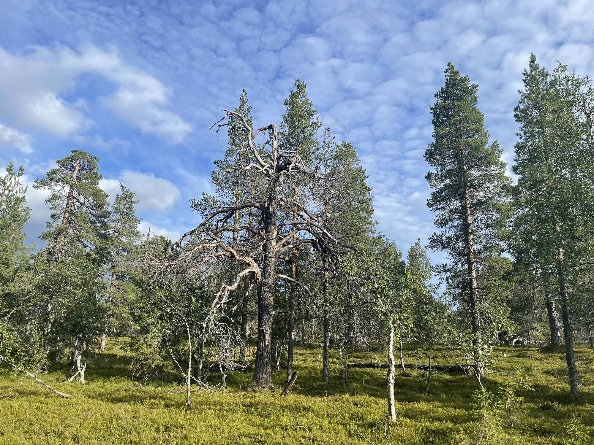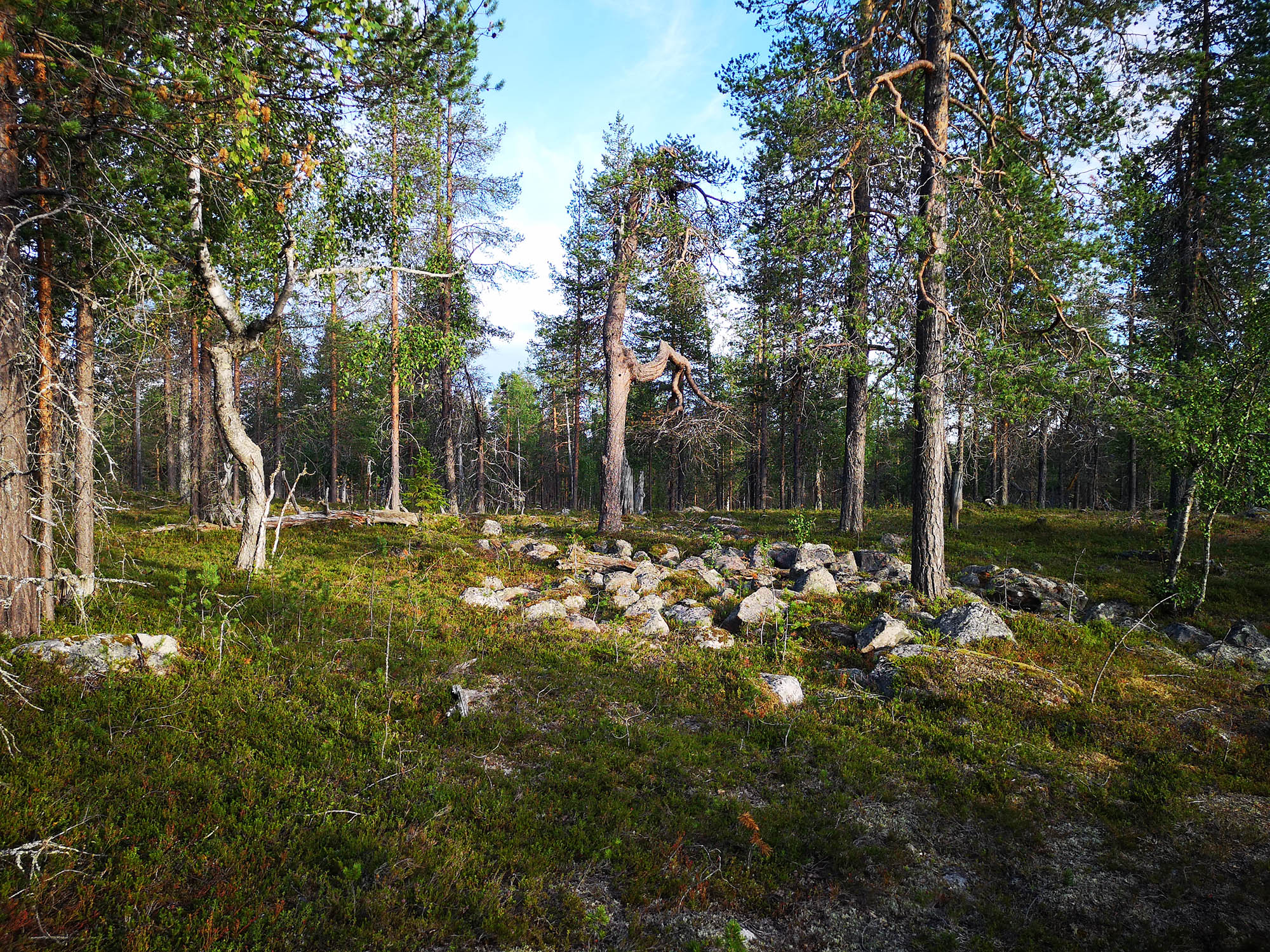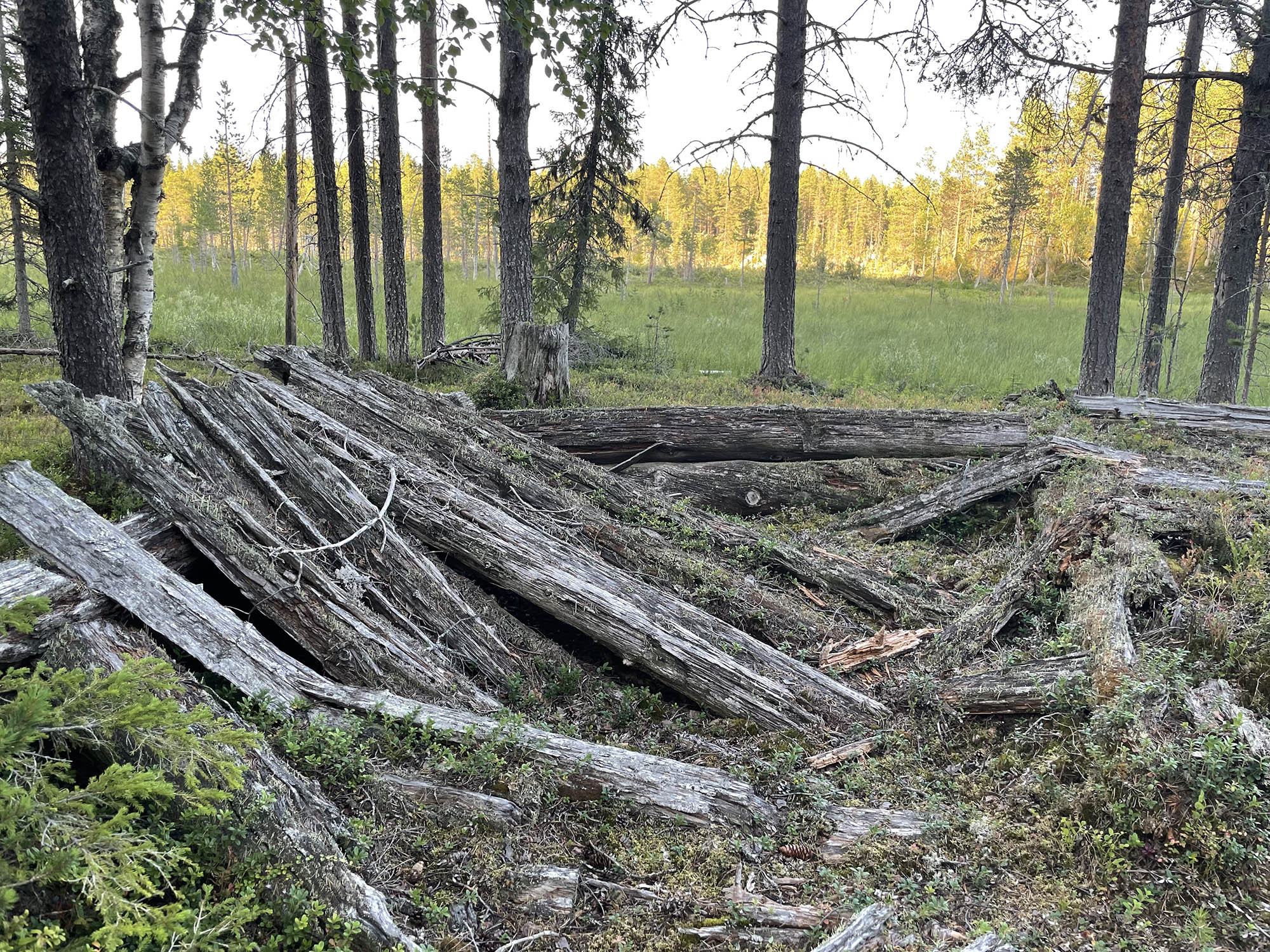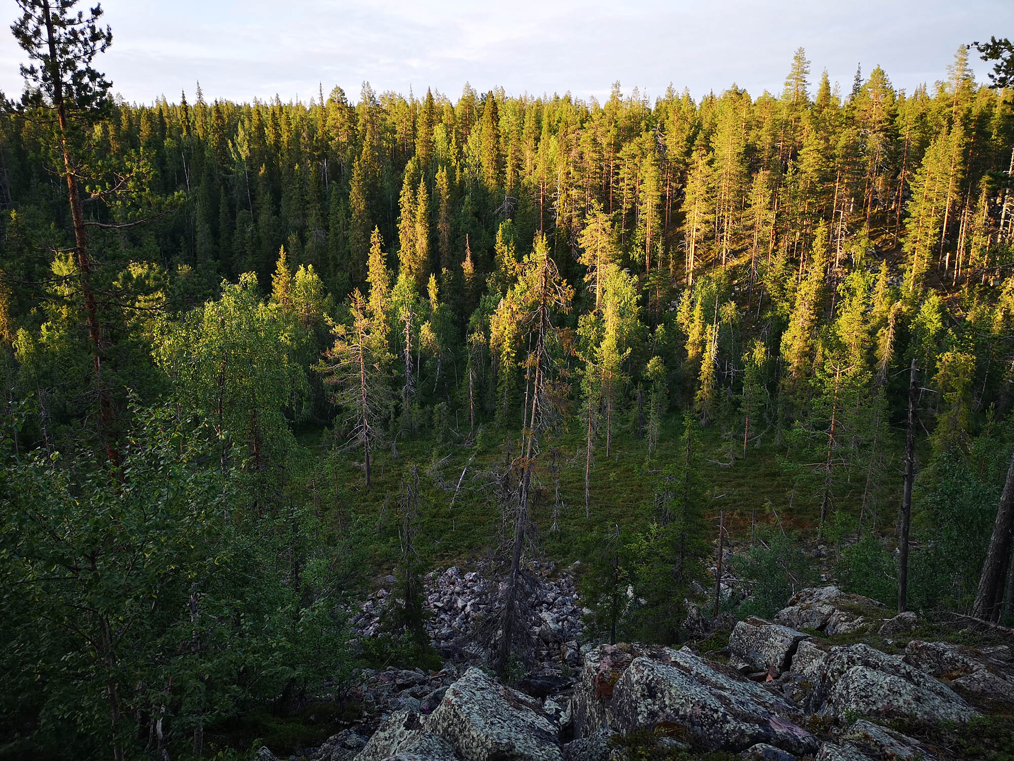 Sträckan mellan Maanalainen och Ventikkövaara var nog dagens jobbigaste passage, stigen blockerades av hundratals fallna träd. Ibland fick vi gå ut på myrkanten och ibland var det svårt att följa stigen då träden med markeringen har också fallit omkull. Men det växte hjortron längs myrkanten, så lyxigt och gott! Härifrån kunde vi även se vår valda tältplats på andra sidan myren, en skön känsla att veta att snart får vi vila då vandringen tog på kraften.