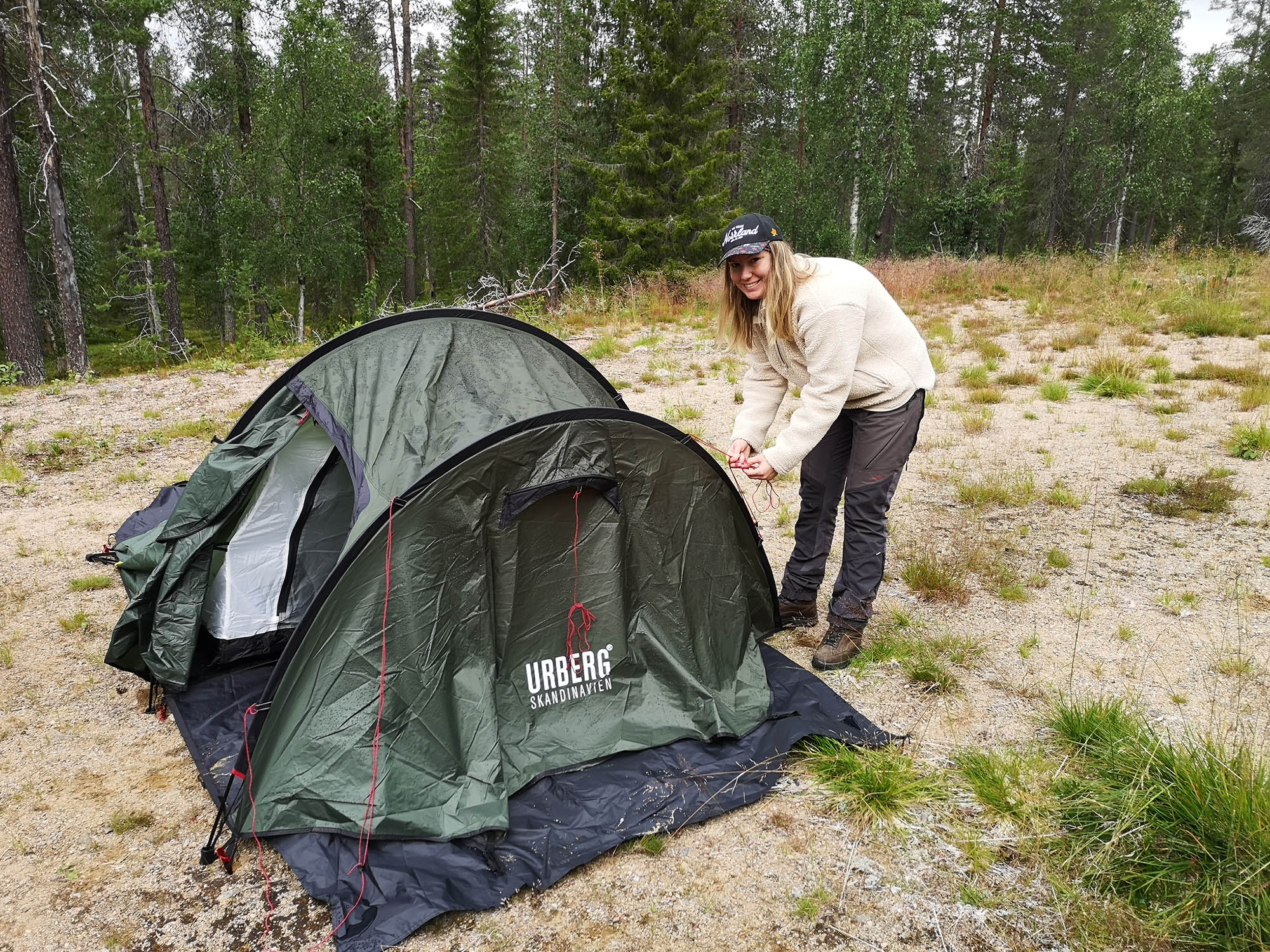 Att slå upp tältet gick smidigare än vi trodde med tanke på att det var första gången. Vi avnjöt kvällsmaten under nattsolen innan vi kröp ner i våra sovsäckar. Natten var tyst och ljus och vi båda sov gott och ganska länge. Det regnade lite på morgonen, men i tältet var det mysigt. När vi vaknat och öppnade tältet såg vi till vår förvåning en liten ren som säkert undrade vad vi gjorde där ute.
