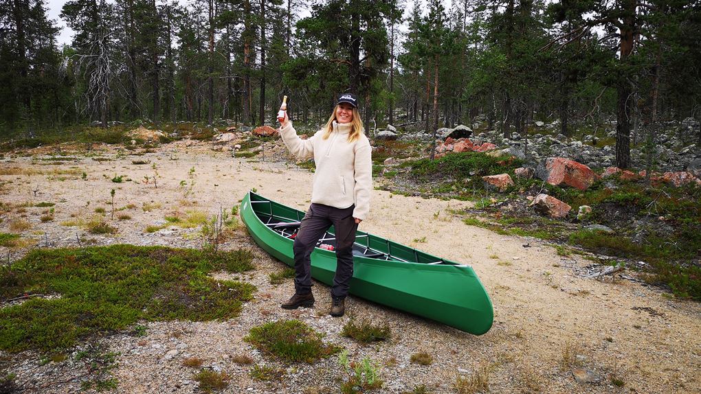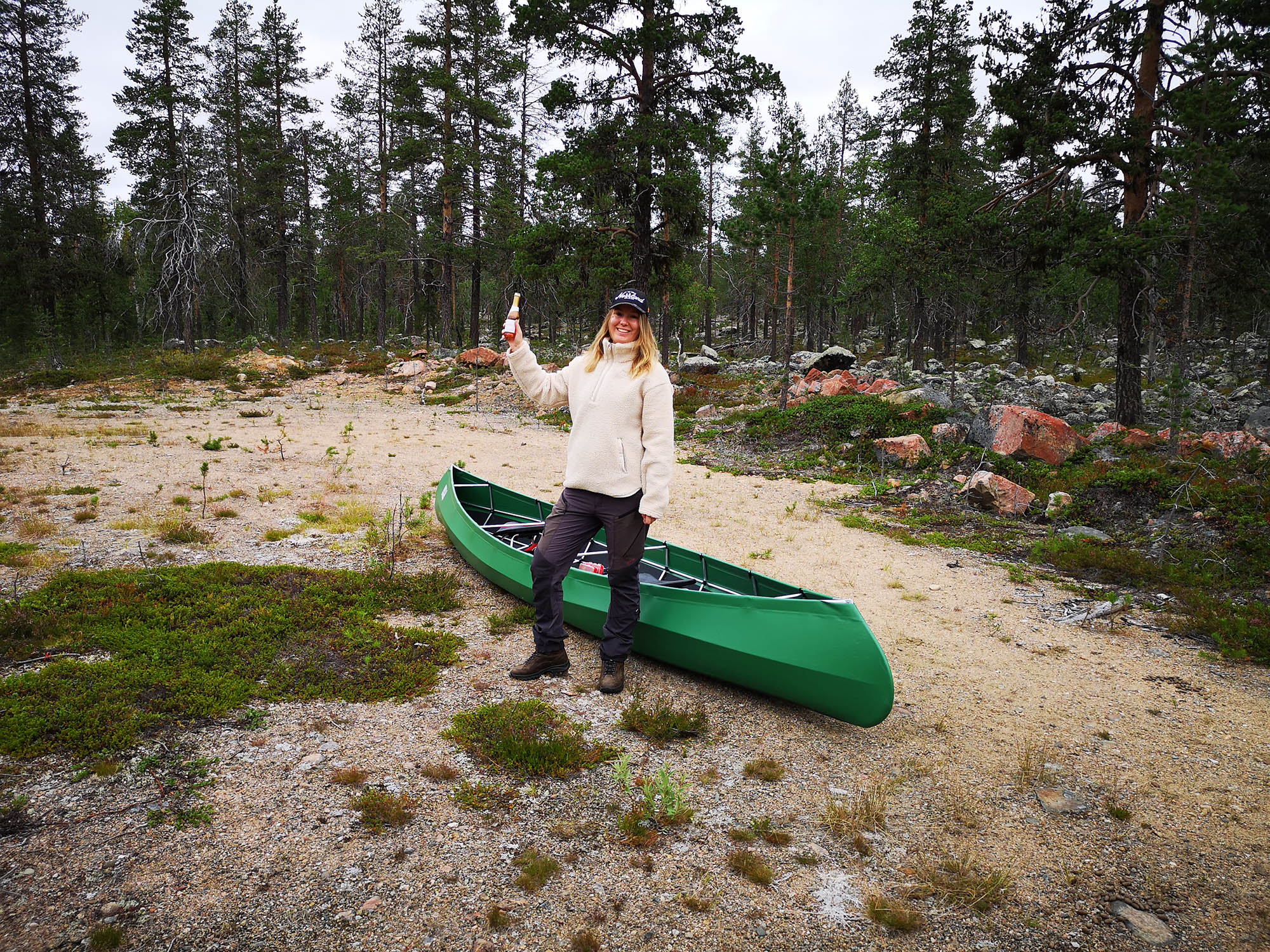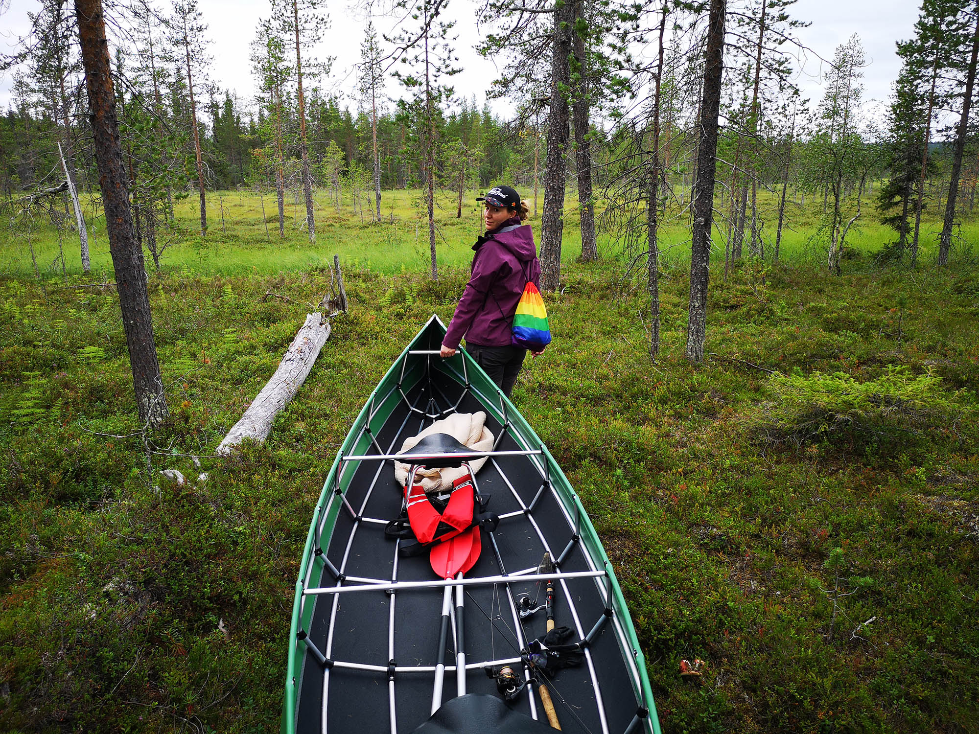Med glatt humör började vi bära kanoten över myr och skog. Båten heter Ally och är med sina 20 kg relativt lätt. Efter att vi har sett Lars Monsen på tv släpa den tvärs över Kanada tänkte vi att de här cirka 400 m till bäcken skulle gå hur lätt som helst. I början gick det bra, vi bar kanoten till myrkanten och sedan halvt bar, halvt knuffade den över myren. Sedan kom vi till skogskanten, där vi fick inse att förflytta en 5 meter lång kanot i en tät urskog kan vara minst sagt ansträngande. Pulsen steg, svetten rann och tiden gick, medan vi fick gå fram och tillbaka med och utan båt för att hitta en möjlig passage.