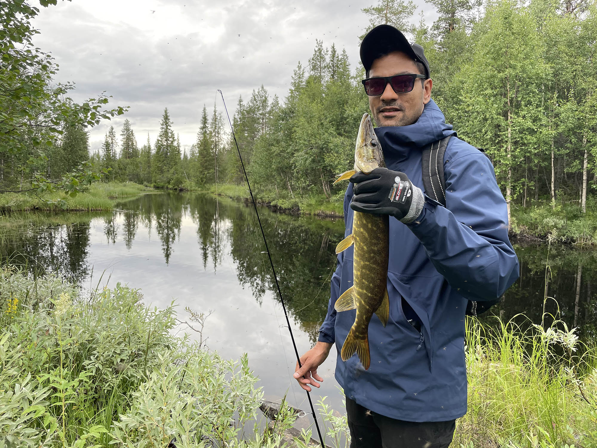 Nu när det blev som det blev återstod bara en grej: vi tänkte inte gå hem utan att vi prövade vår fiskelycka. Det tog inte många kast innan en gädda nappade för Erik, och det fick bli slutet för det här äventyret.