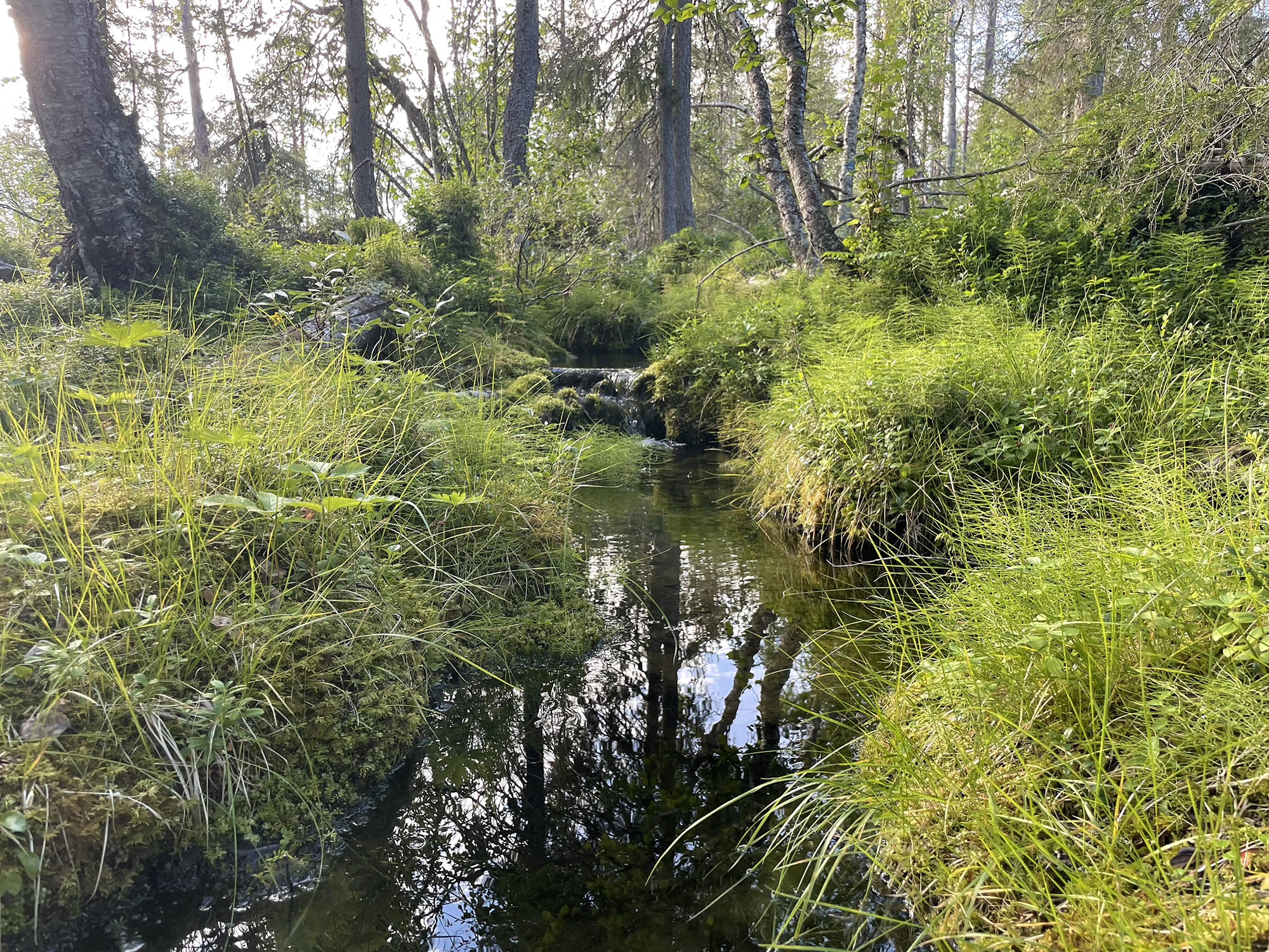När vi äntligen tagit oss genom skogspartiet kom nästa myr, där gräset var så högt att vi inte ens såg våra fötter, men vi är inte sådana som ger oss så vi lyfte kanoten över huvudet och snubblade oss fram genom myren. Sedan kom nästa skogsparti, men till slut nådde vi bäcken. Det där cirka 400 metrarna tog 1,5 timmar, men nu var vi framme och skulle påbörja nästa etapp.
