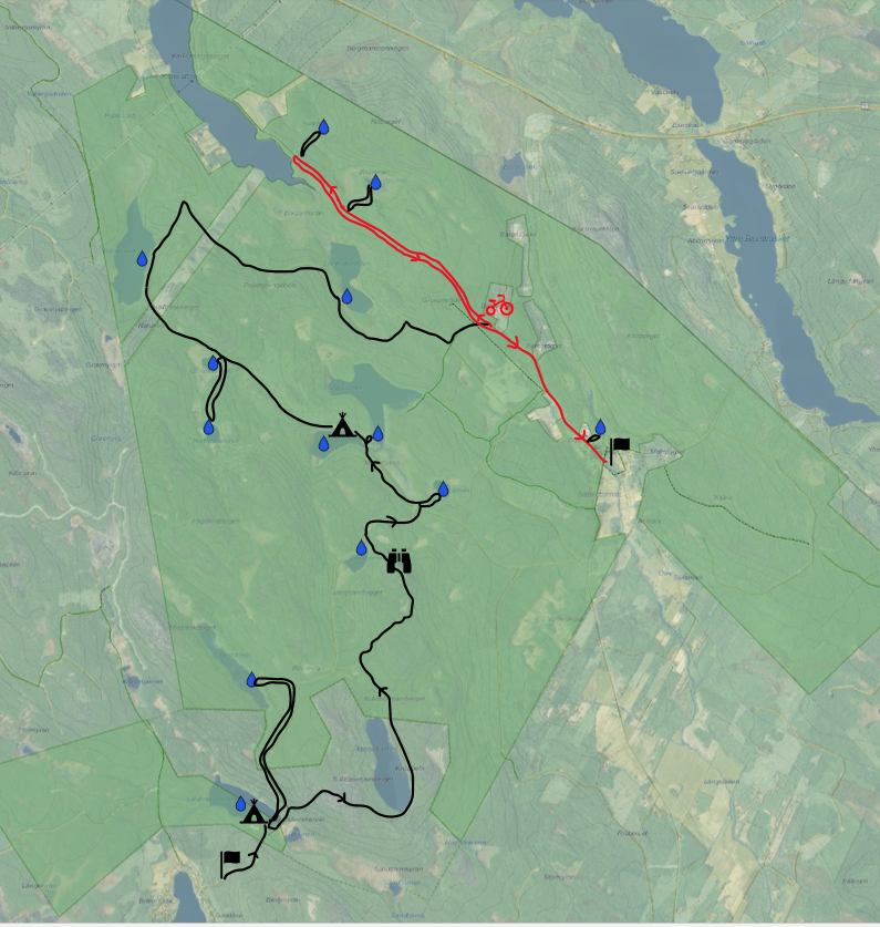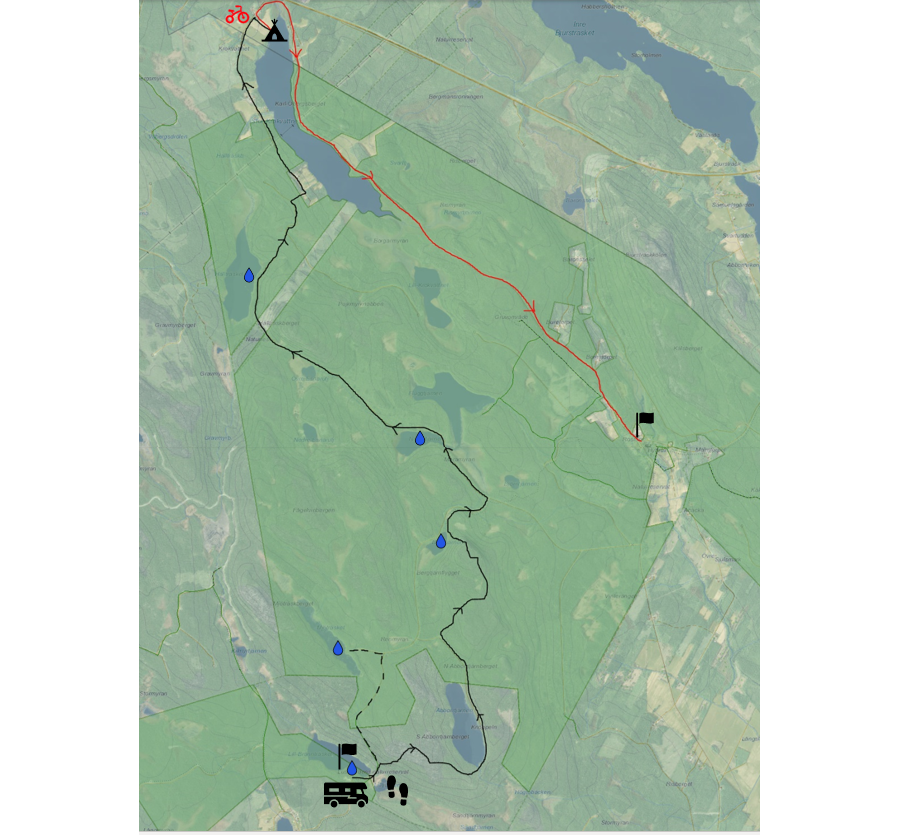 Vi lämnar våra cyklar och sovpackning vid etappmål Krokvattnet och åker sedan till vår start vid Lill-Brännträsket. Det visar sig vara en fin och välordnad plats med stuga, vindskydd och bryggor.