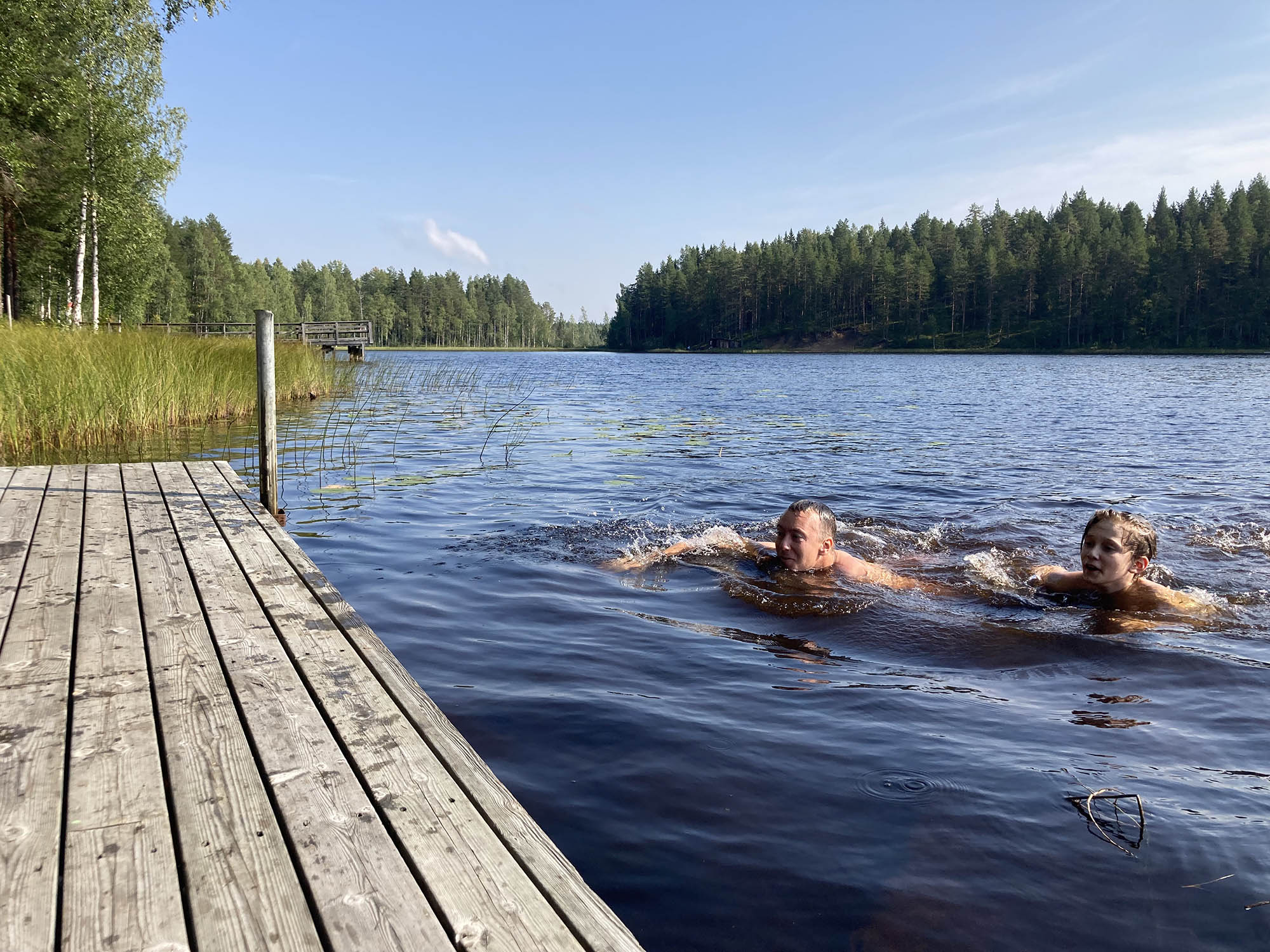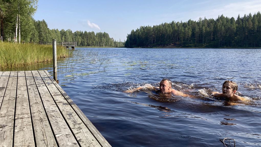 Därefter viker vi av från Solanderleden och tar grusvägen mot Nävertjärn, nu till vackert väder eftersom det till slut spruckit upp. Vid tjärnen möter vi flera campare och fiskare och även här var det välordnat med stuga, vindskydd och bryggor. Här badar pappa Jonas och Holger och de andra besökarna tyckte nog vi var lite galna!