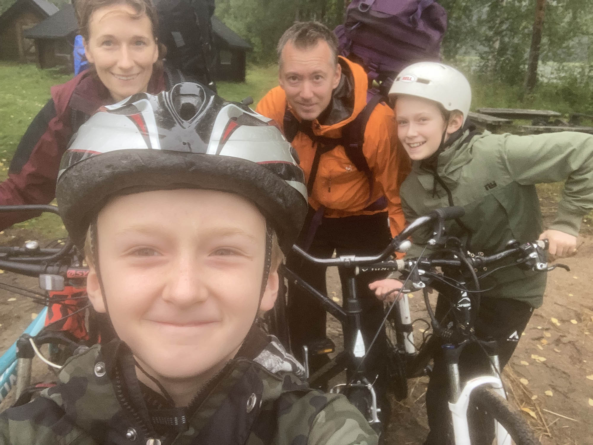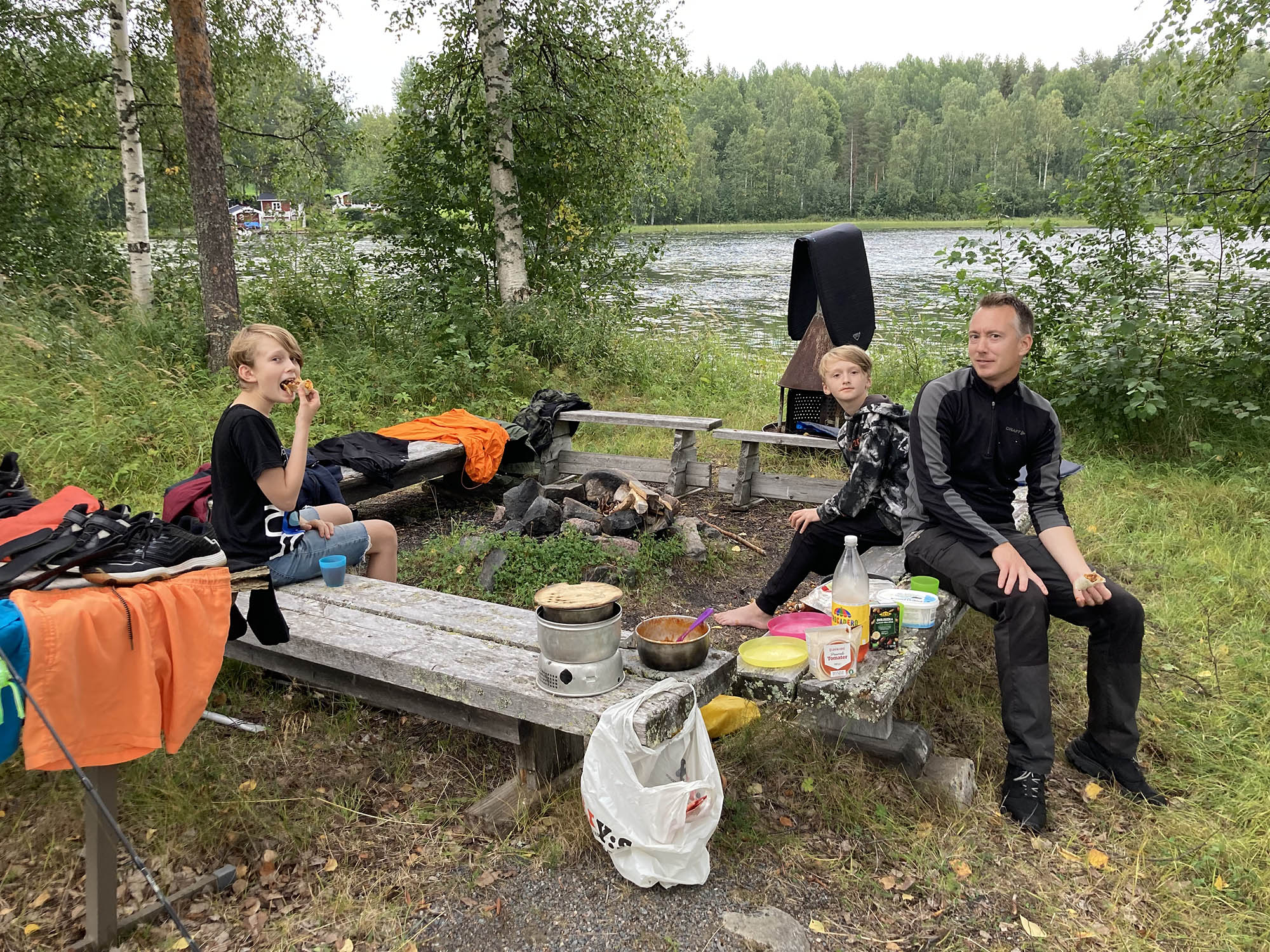 Natten i tältet blir regnig och blåsig. Halva gänget kröp faktiskt in i grillkåtan vid 3-snåret för att fånga några timmars god sömn. Morgonen bjuder på grötfrukost, ihoppackning och sedan sätter vi av på cyklarna.