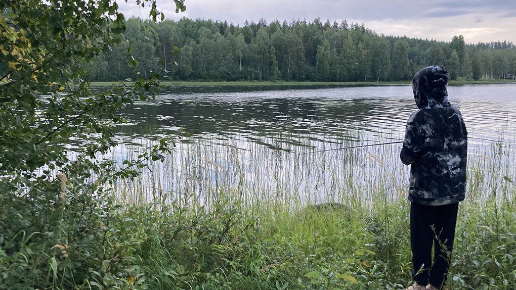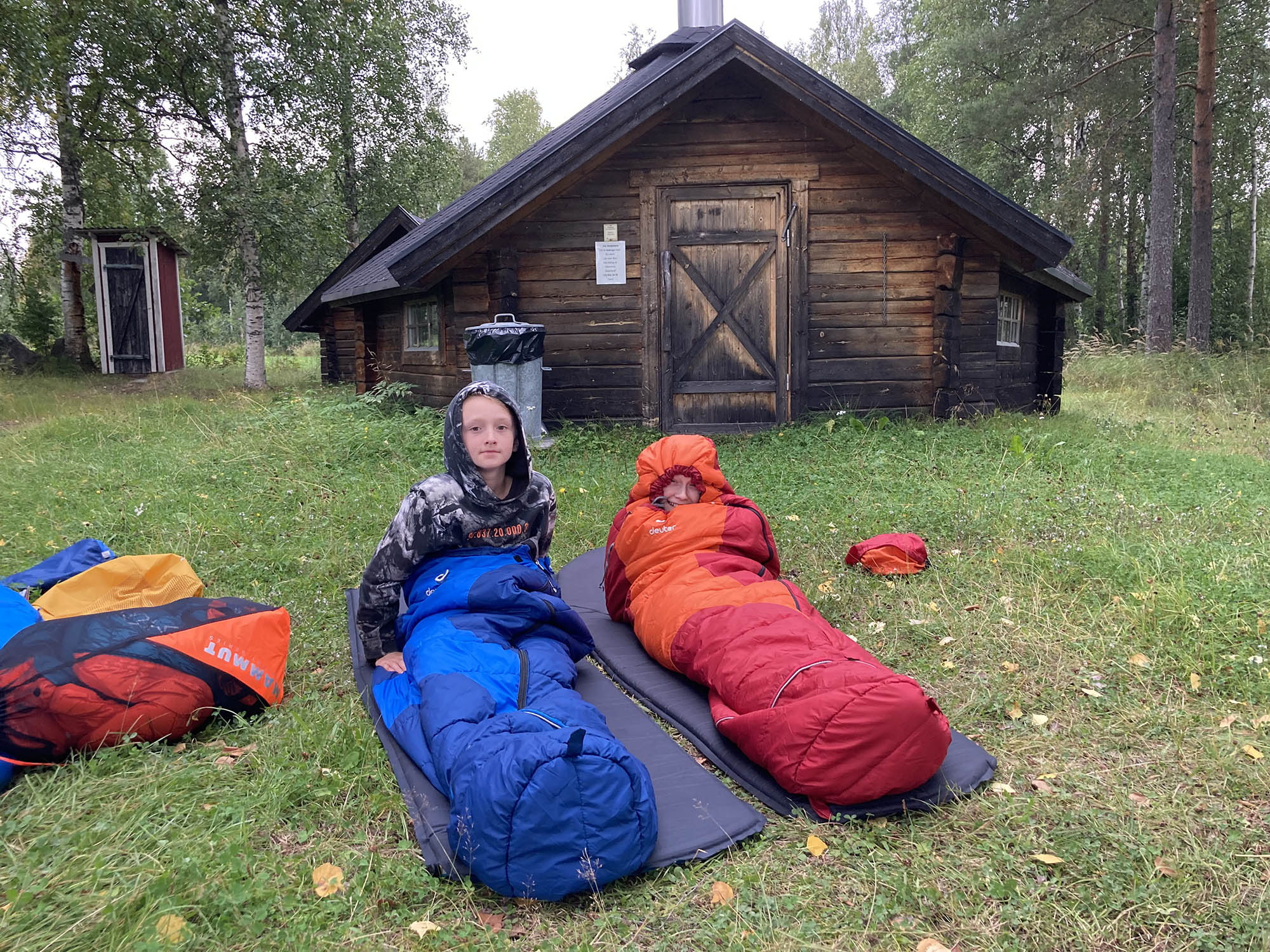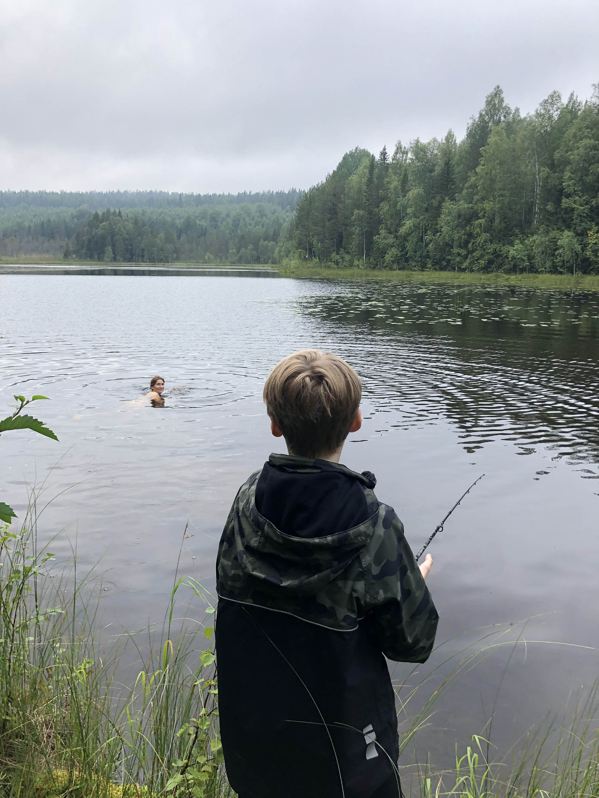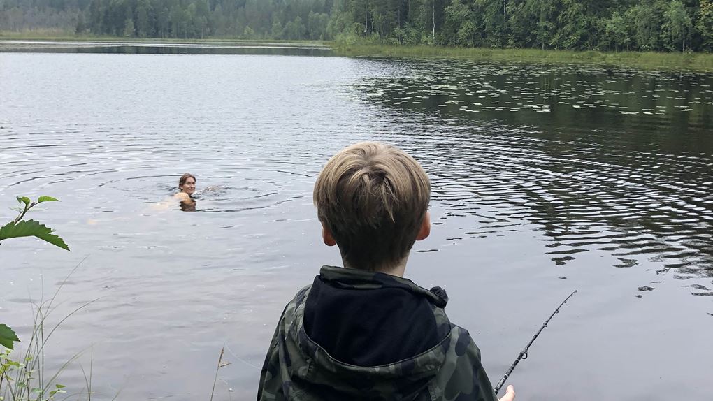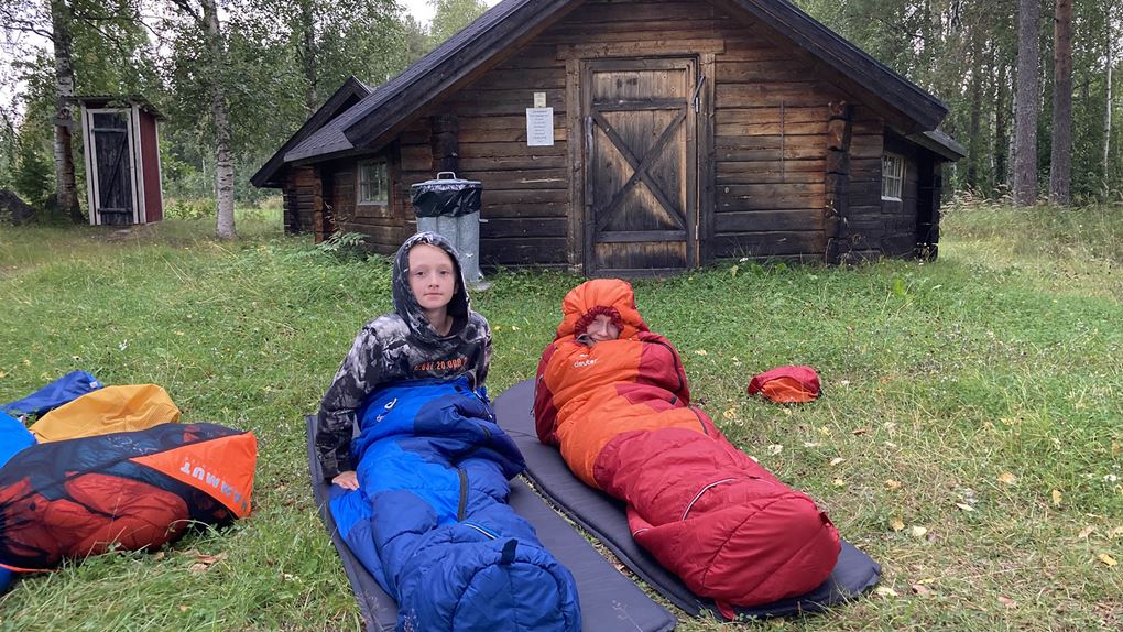 Grabbarna löser fiskekort och testar fiskelyckan, dessvärre utan framgång. Mamma Emma ger sig iväg på kvällspromenad med äventyrets första bad i Mjöträsket som visar sig bli ett gyttjebad! Natten tillbringas i husbil – vi vet att det är lite fusk, men det säkerställer god nattsömn och bra uppladdning inför morgondagen för alla.