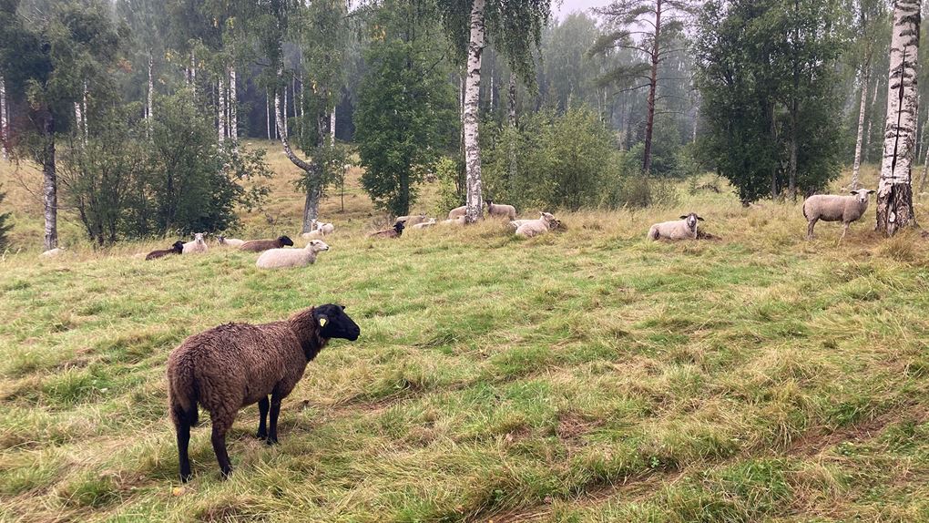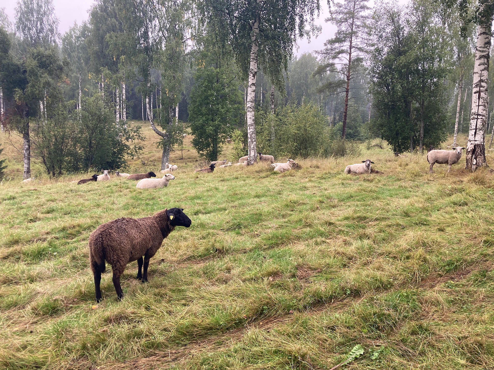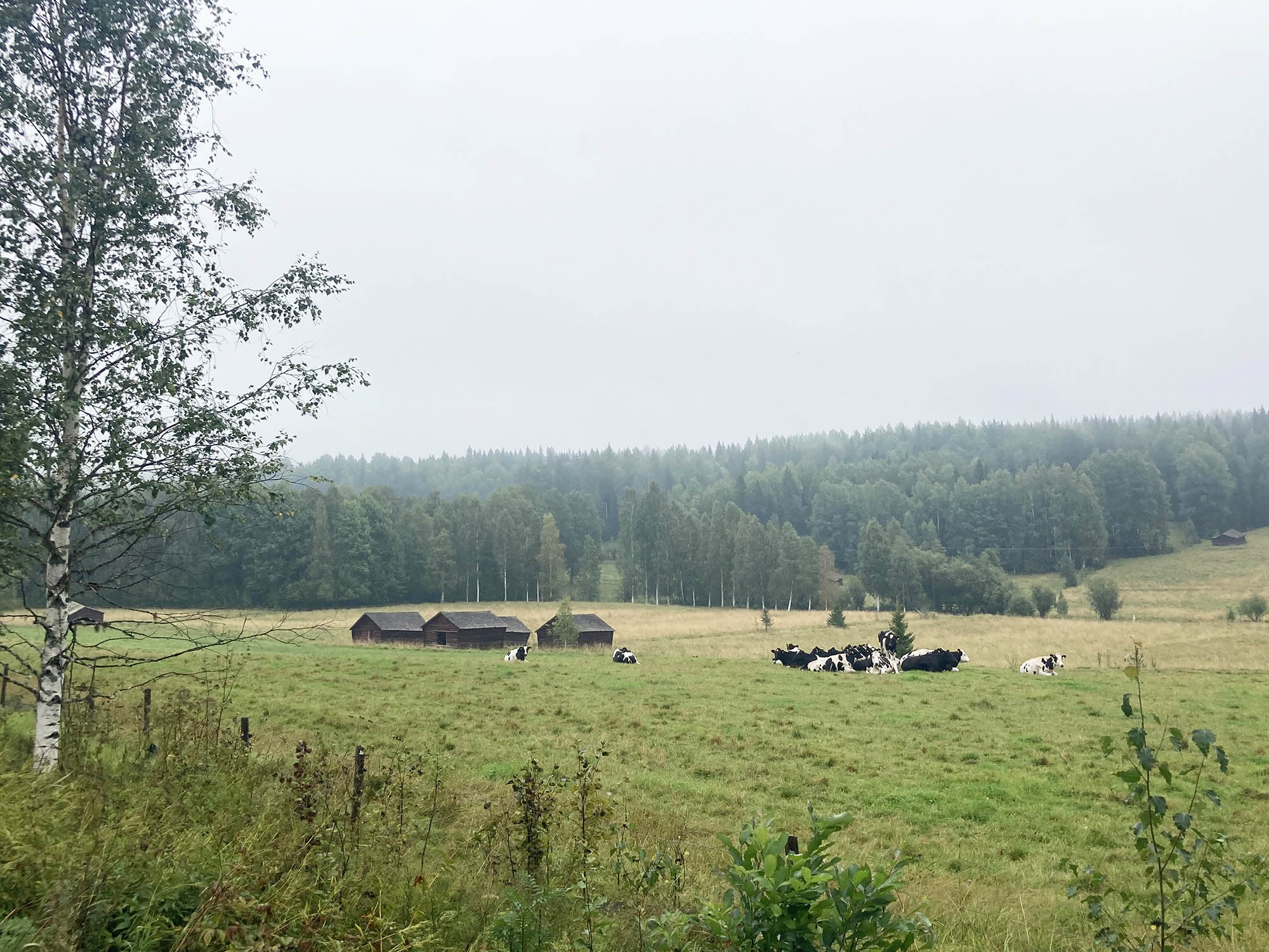 Mamma Emma cyklar och hämtar husbilen medan resten av familjen fixar lunch, tittar på de gulliga fåren och de betande korna. Precis när vi packar in packningen i husbilen och lastar cyklarna kommer regnet – perfekt tajming!