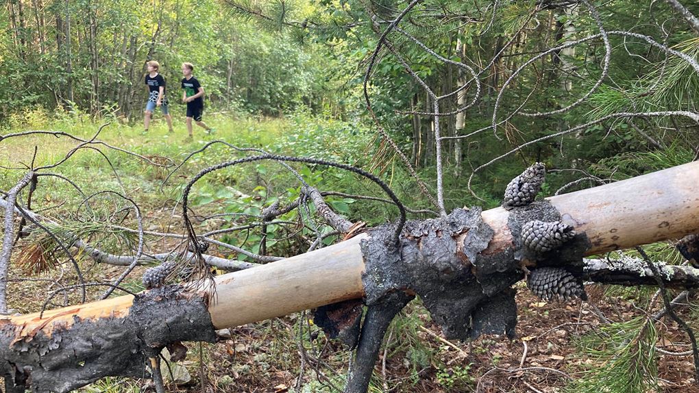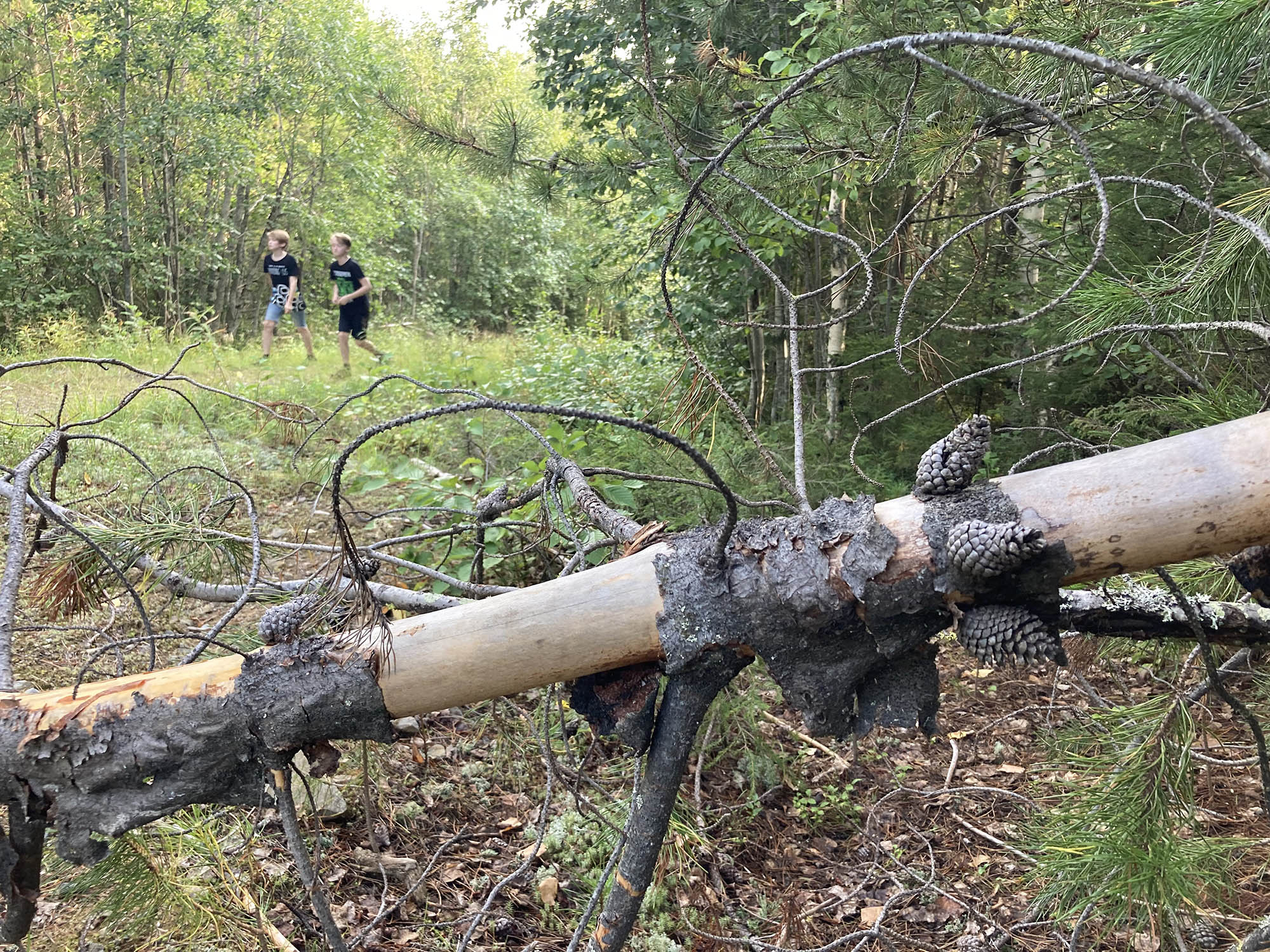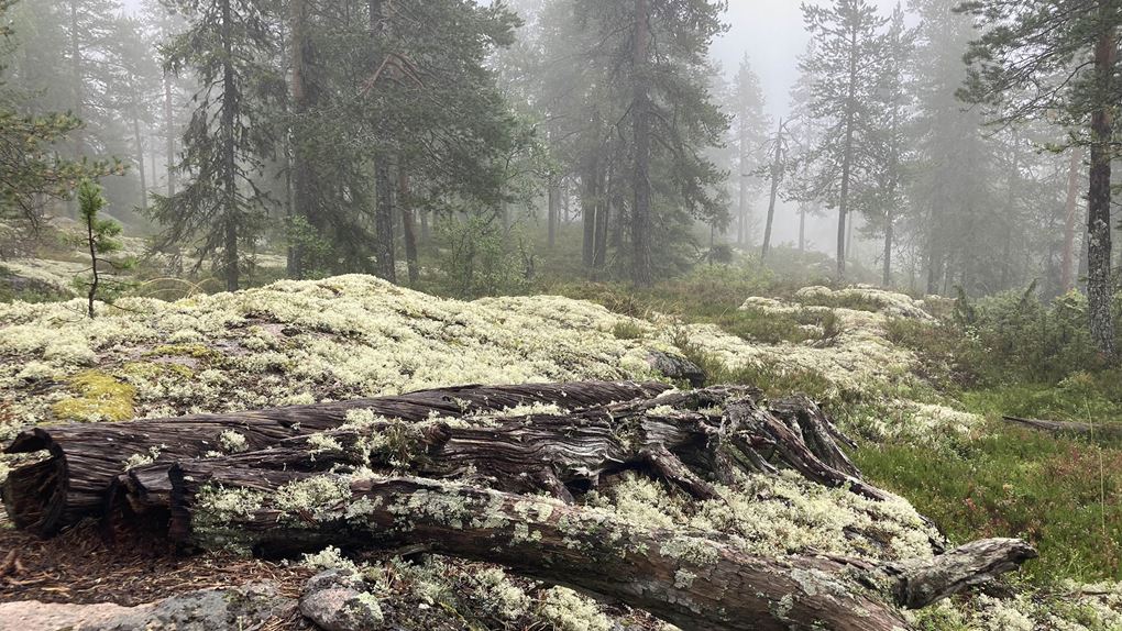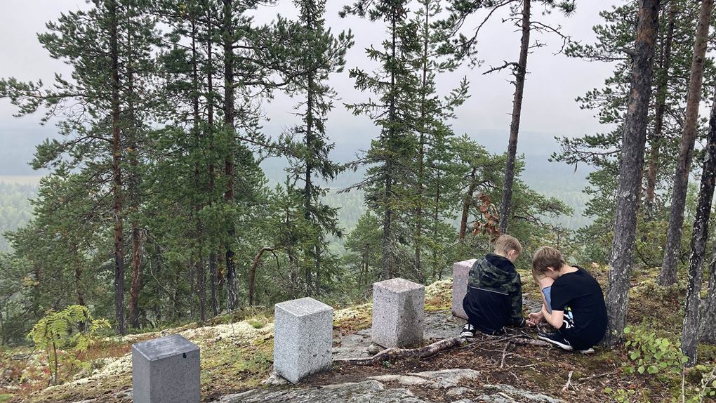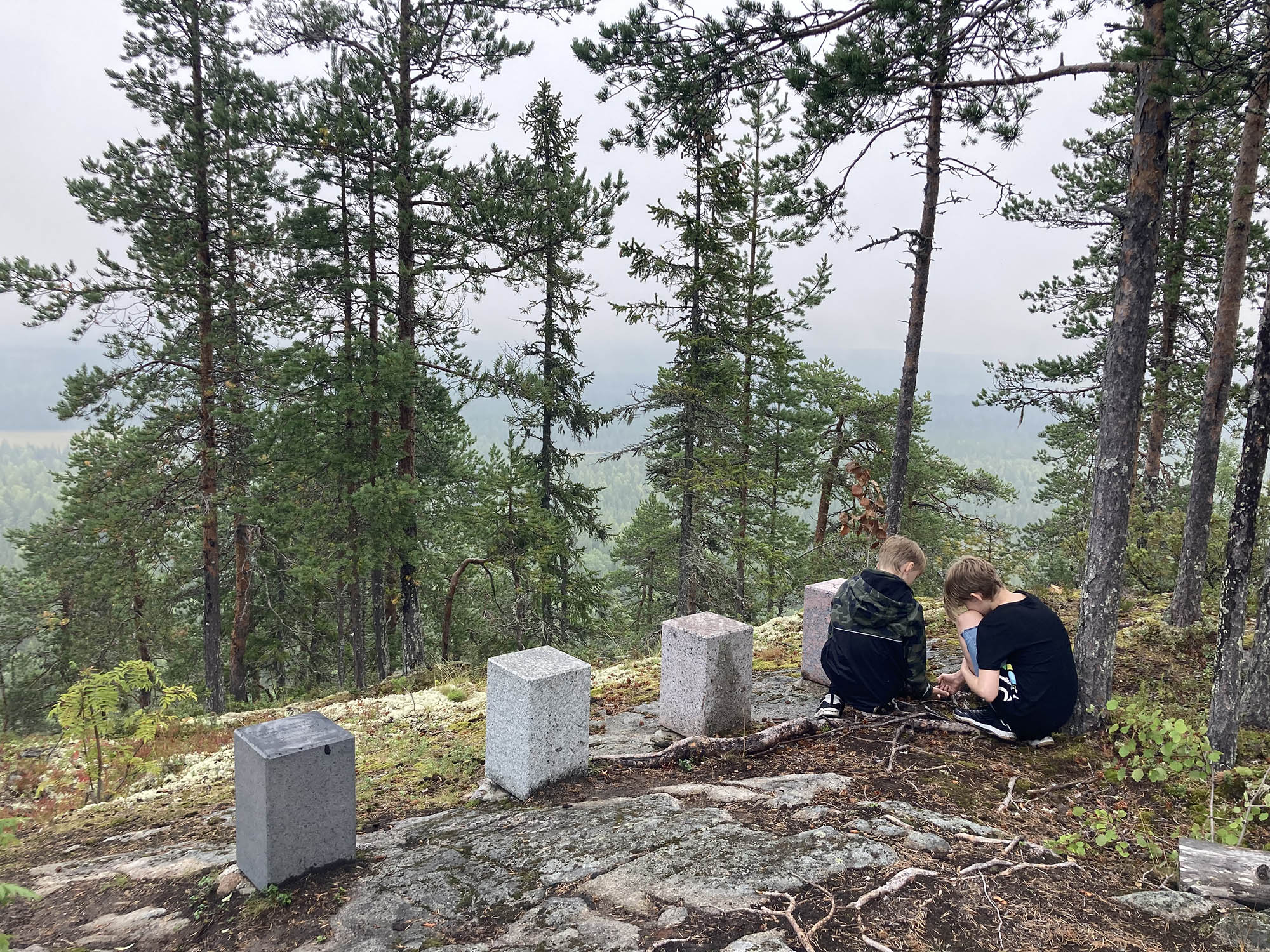 Vi knatar vidare längs leden på upp till Bergtjärnsflygget där ekoparksstenarna finns utplacerade. Tyvärr hänger sig dimman kvar, även om det ibland lättar och den vackra utsikten kan skymtas genom dimslöjorna. Vi åter lunch och barnen börjar, efter en förmiddag utan skärm, hitta tillbaka till fantasin och leken.