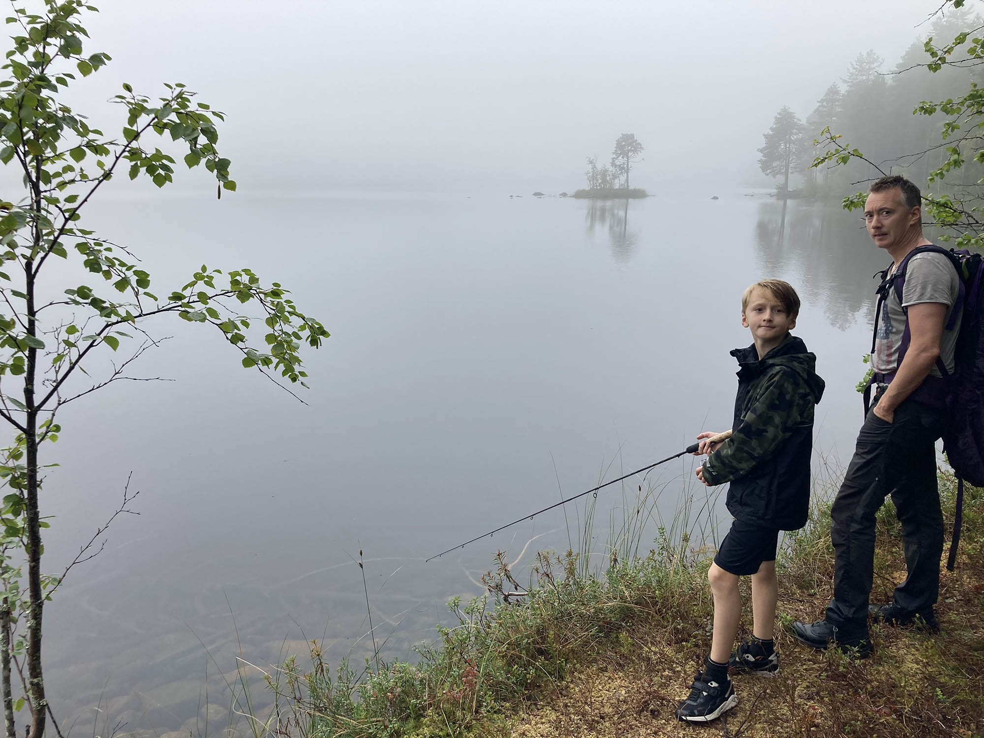 Vi vaknar till dimma och regn i luften, men det är riktigt varmt. Laddar med ett skönt morgondopp från bryggan, lite fiske och rejäl frukost innan avfärd. Precis när vi ska börja vandra kommer dock regnet och vi drar på oss alla regnkläder och börjar gå. Det blir en svettig stigning längs Solanderleden upp till Södra Abbortjärnsberget.