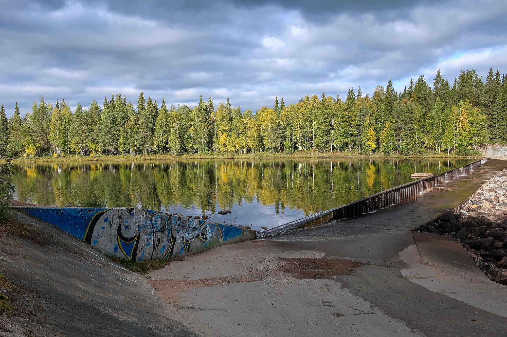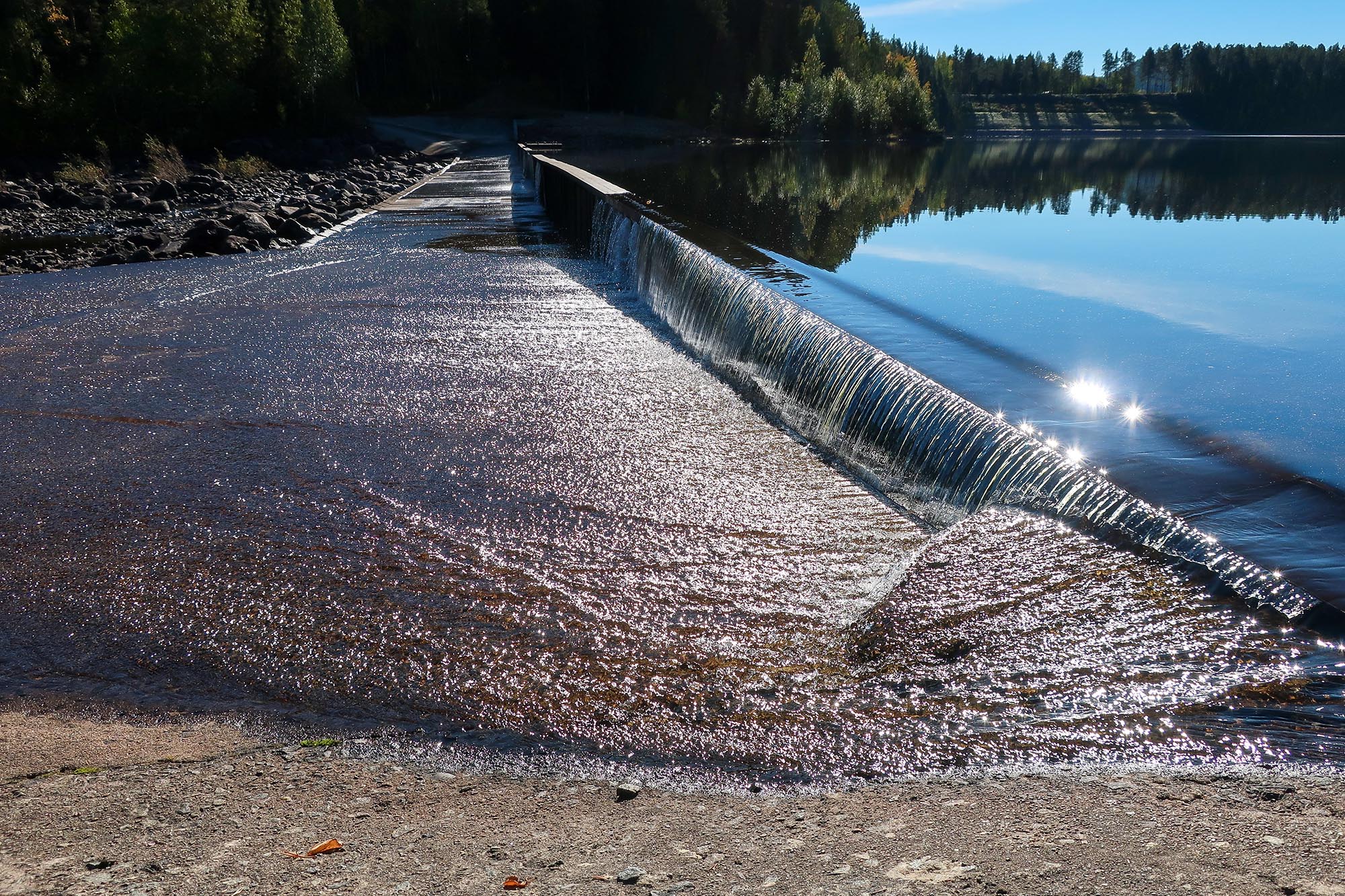 Vi känner oss klara med vårt äventyr och går tillbaka och möts av bilarna som är täckta med knott så det gäller att vara snabb och undvika att få med dem in i bilen. Solen skiner även idag och höstfärgerna har börjat komma så vi stannar till vid spegeldammen för att ta lite fler foton. Det är en vacker plats och här hade det varit roligt att ha med systemkameran och tar mera bilder men det kanske får bli en annan gång.