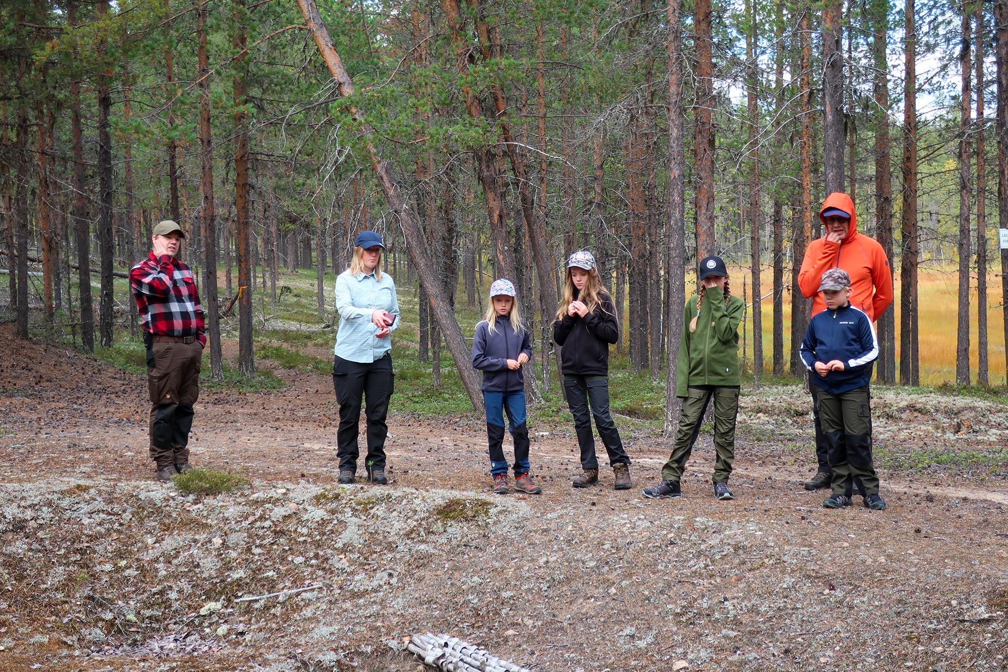 Vi kunde se några tydliga lämningar av husgrunder och vi försökte leta efter fler men utan resultat. Barnen tyckte däremot att laven som hängde från trädens grenar var intressant och platsen där boplatslämningen fanns låg vackert vid en myr i höstfärger. Vi hittade en uppmärkt stig och flöjde den en bit när vi gick tillbaka till bilarna.