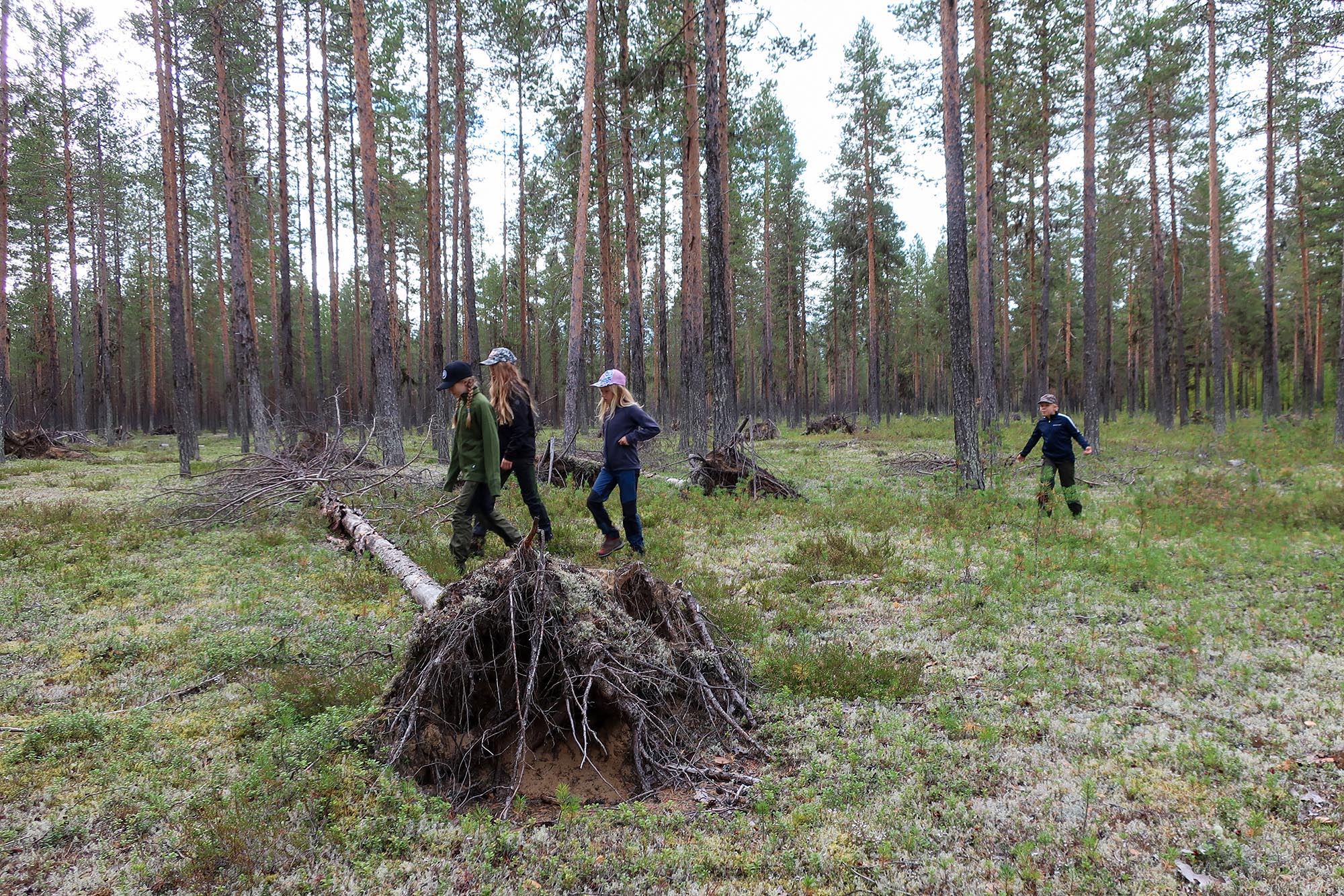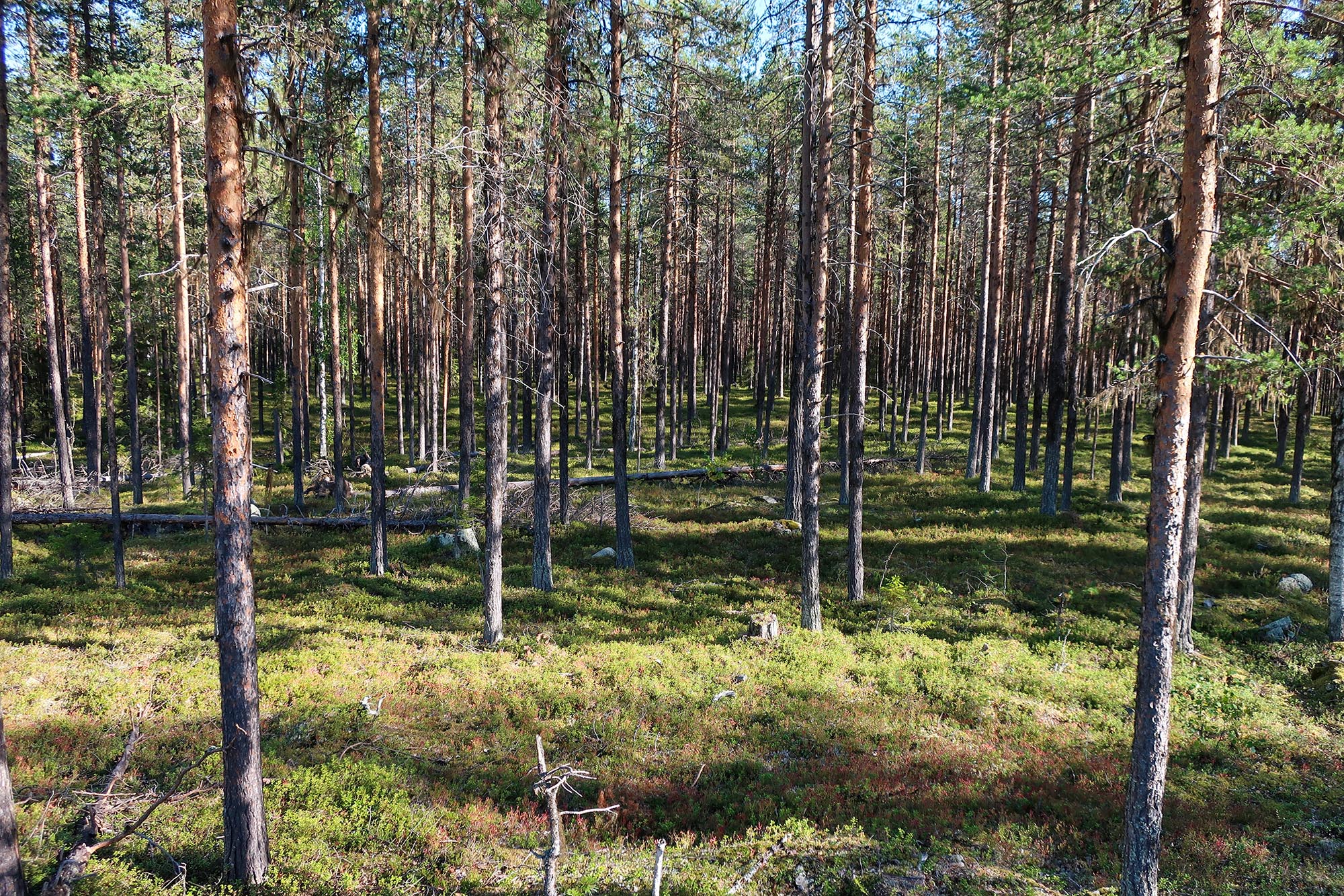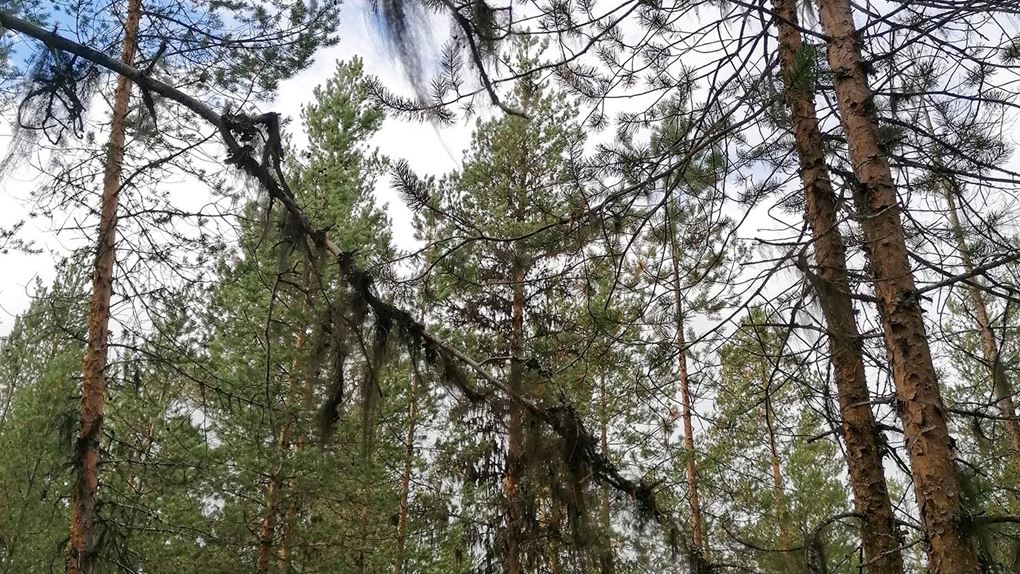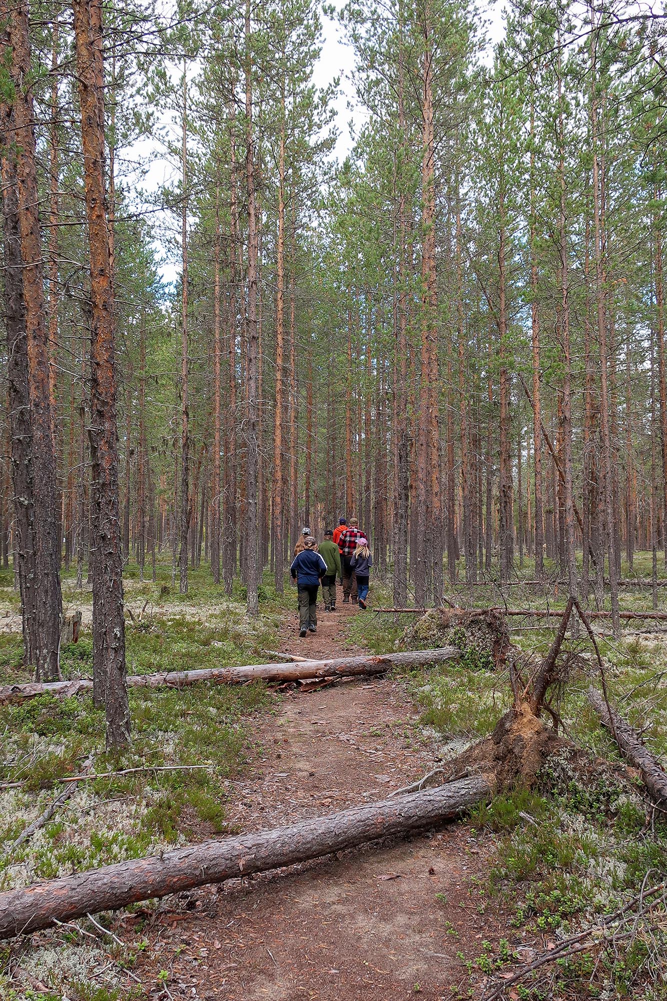 Det började närma sig lunchtid och vi behövde hitta vatten för att kunna göra lunch. Så vi ändrade vår rutt för att gå till den bäck som såg ut att ligga relativt nära. Därför gick vi inte ut mot älven som vi hade planerat ut in mot skogen i stället. Först följde vi en skogsväg och på båda sidorna kantrades den av gles gammal tallskog. Snart blev det snårigare och terrängen mer oländig och vattnet lyste med sin frånvaro.