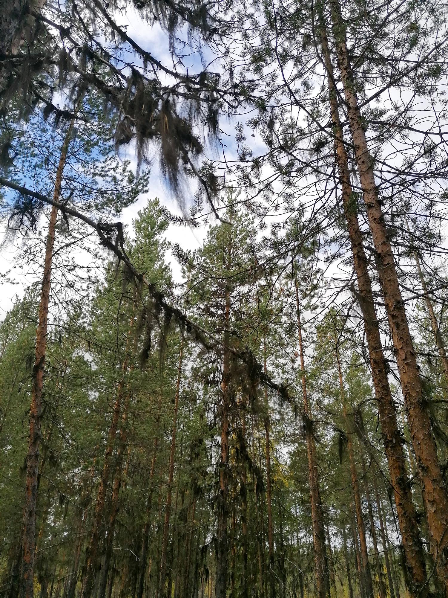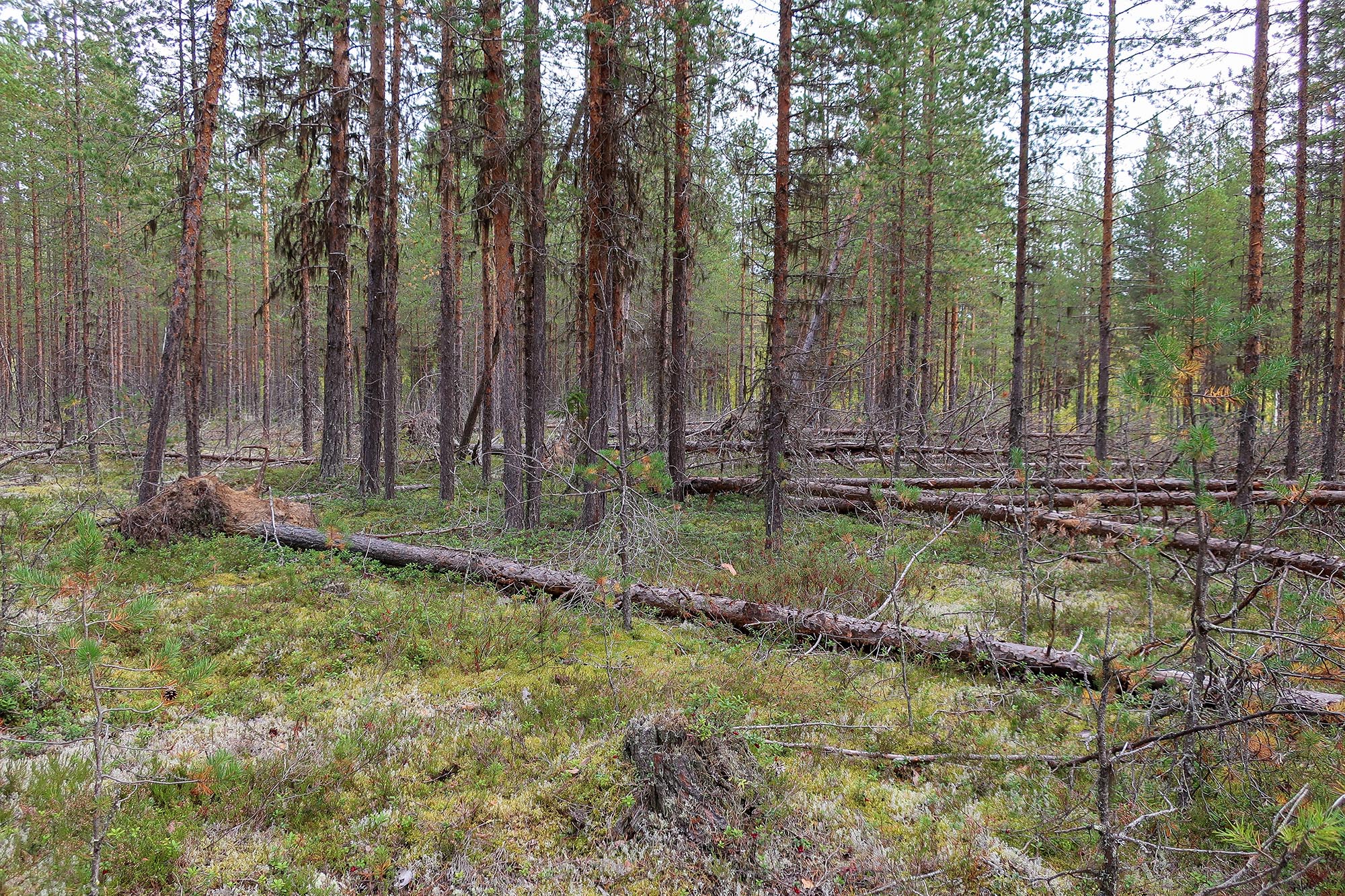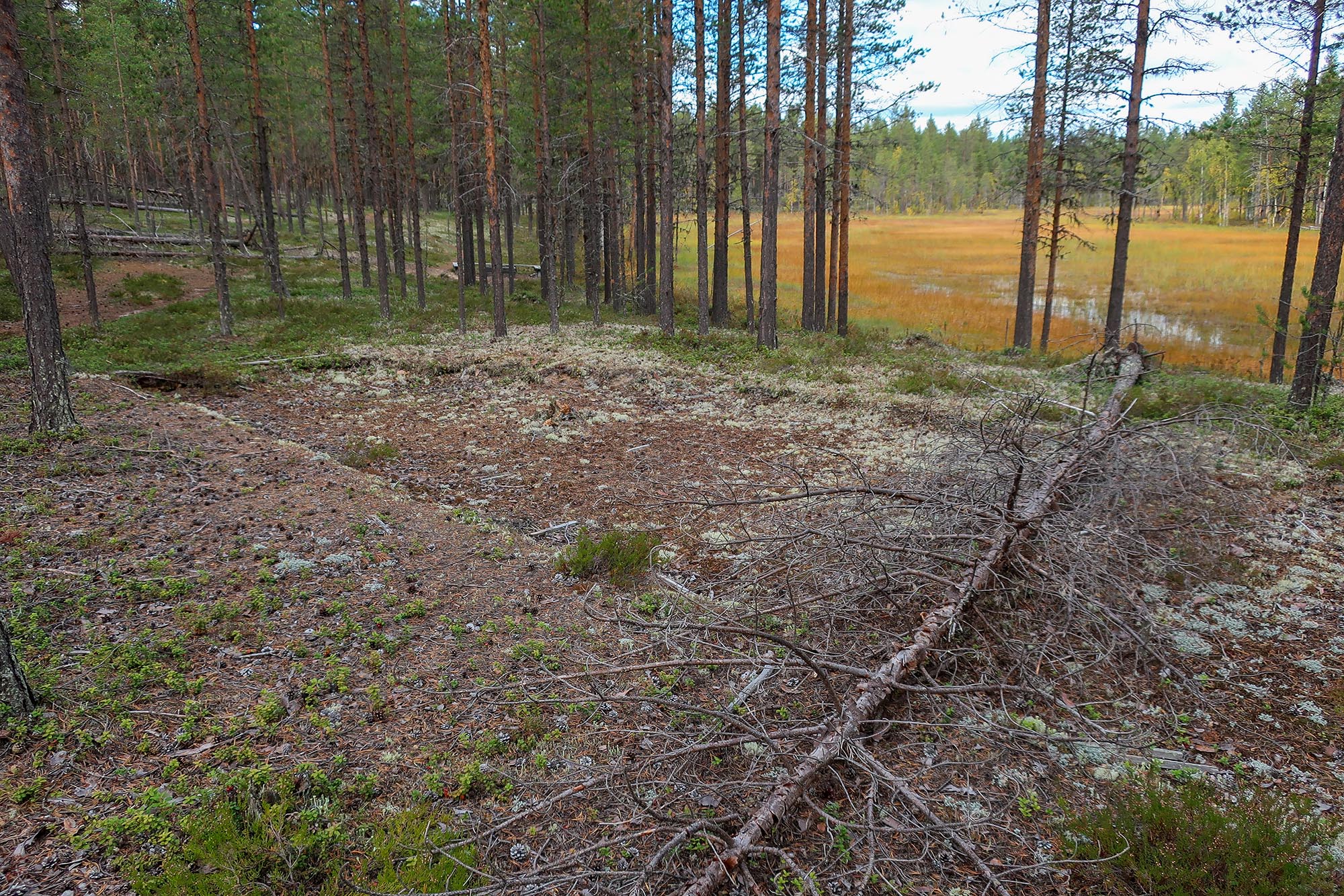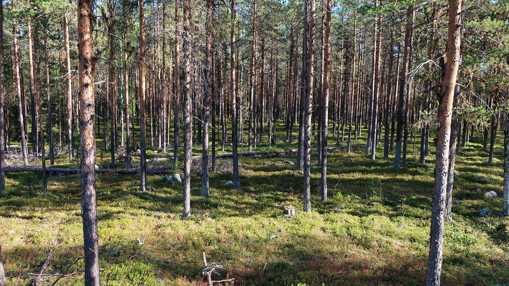 Det började närma sig lunchtid och vi behövde hitta vatten för att kunna göra lunch. Så vi ändrade vår rutt för att gå till den bäck som såg ut att ligga relativt nära. Därför gick vi inte ut mot älven som vi hade planerat ut in mot skogen i stället. Först följde vi en skogsväg och på båda sidorna kantrades den av gles gammal tallskog. Snart blev det snårigare och terrängen mer oländig och vattnet lyste med sin frånvaro.