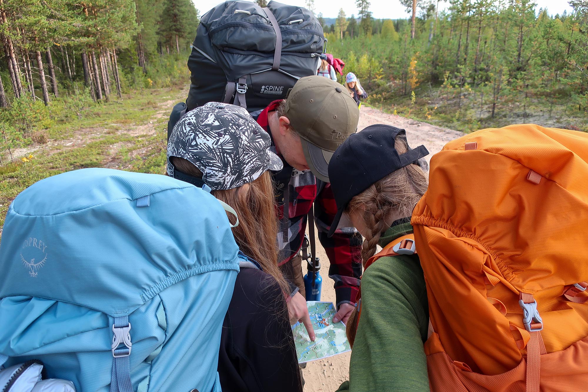 Efter en stund meddelade Isabel att de hittat vatten och en ny skogsväg där det var betydligt mindre knott. Nu började vi bli trötta och vi vuxna skulle helst av allt satt oss ner med en kopp kaffe. Och barnen började bli trötta på att bära sina väskor. Så vi plockade fram bars, choklad, nötter för att peppa oss, tog på oss väskorna än en gång och gick mot vägen där de lämnat vattenpåsen de fyllt med vatten från bäcken.