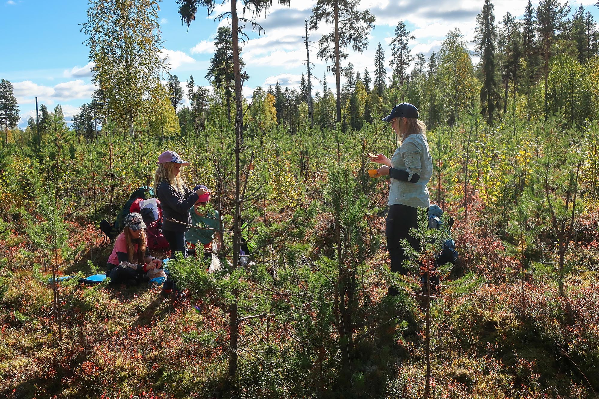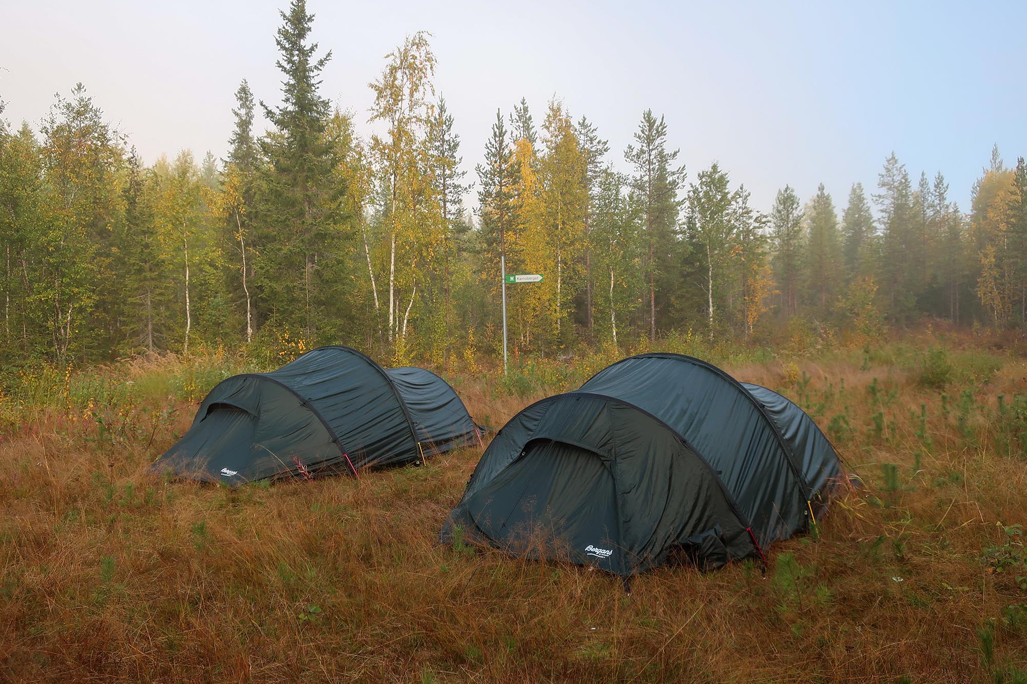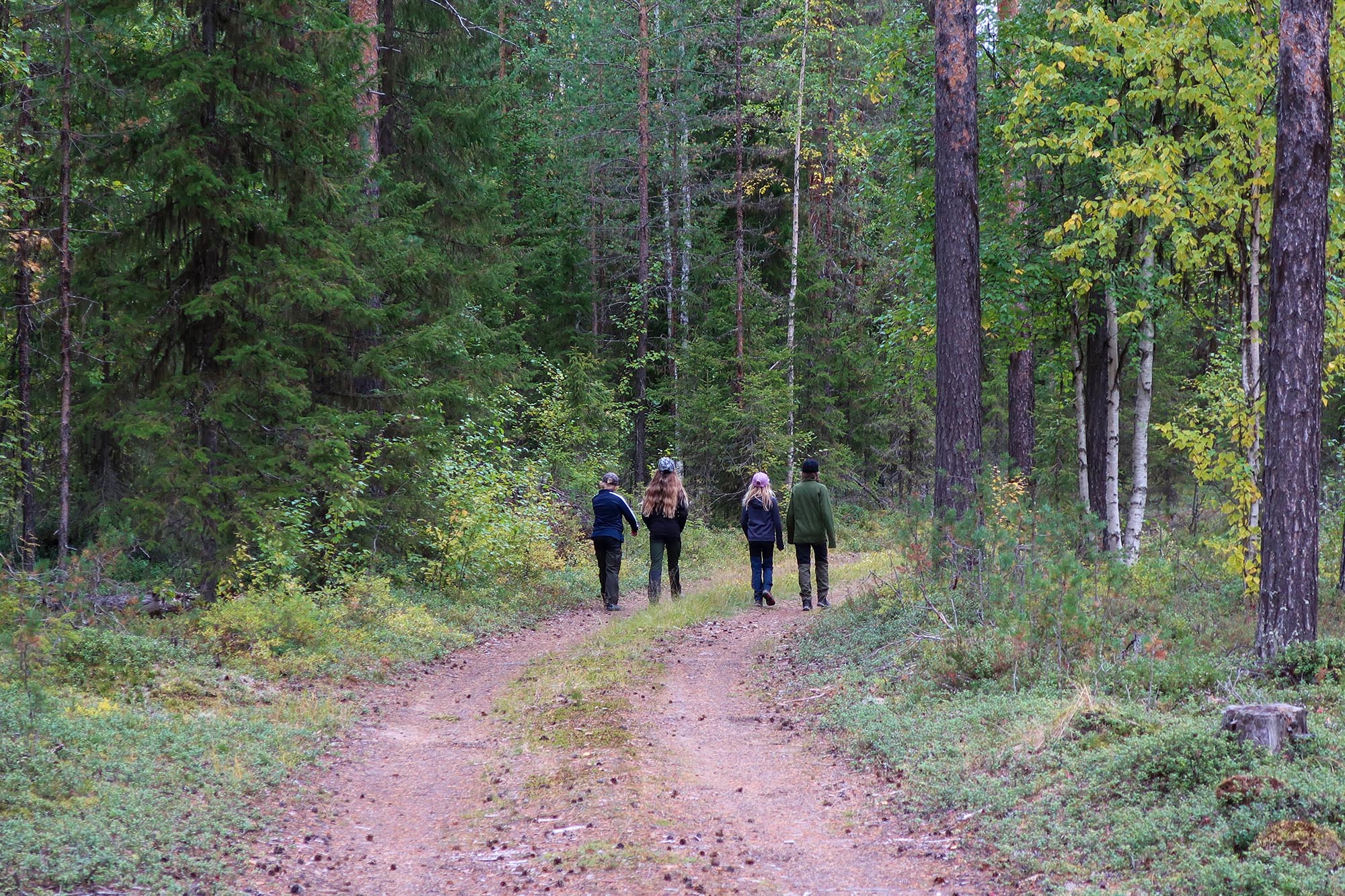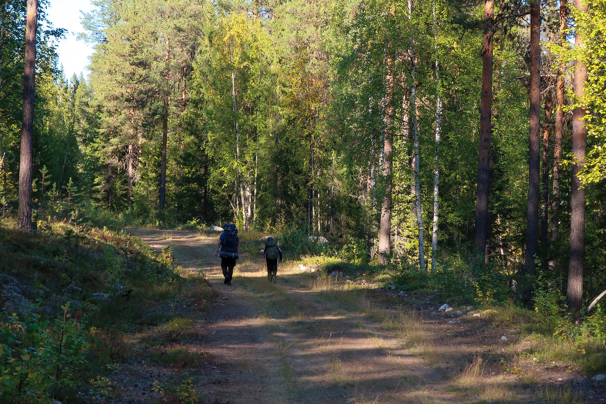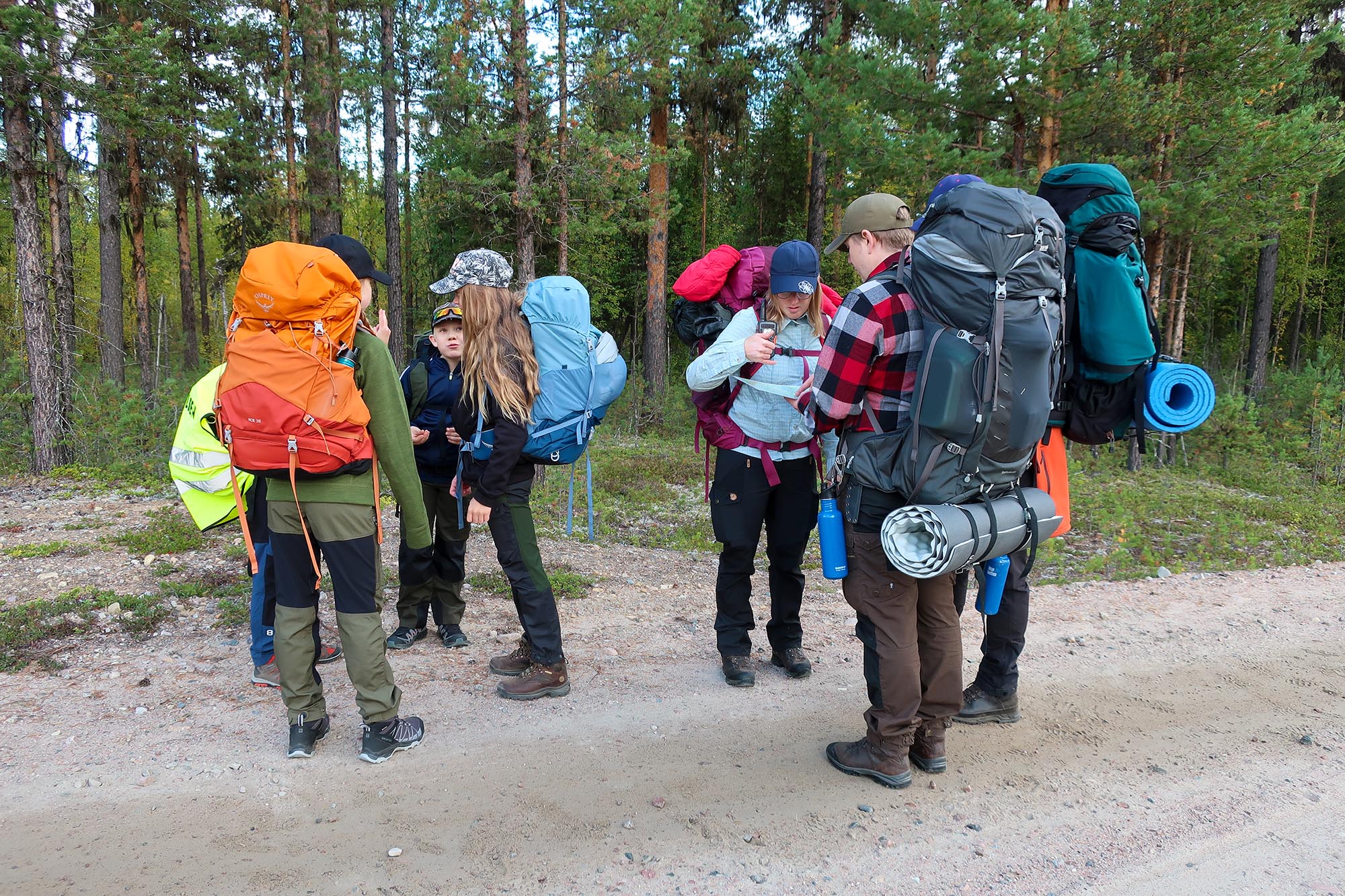 Väskorna var packade med tält, sovsäckar, mat, gaskök, ombyten och andra förnödenheter. Tunga väskor åt oss vuxna och lättare packning åt barnen. Vattenflaskorna fylldes och vi gjorde smörgåsar att ha som med lunch och mellanmål den första dagen. Väderprognosen såg mycket lovande ut, soligt och omkring +15 grader. Det kändes nästan lite för lovande med tanke på att hösten i Norrbotten kan bjuda på såväl regn och storm som soliga vackra dagar. Vi hoppades att väderleken skulle stämma. Vis av erfarenhet vet vi att det är svårt att hålla humöret upp på hela gänget om regnet öser ner och naturligtvis var skalkläderna nerpackade.