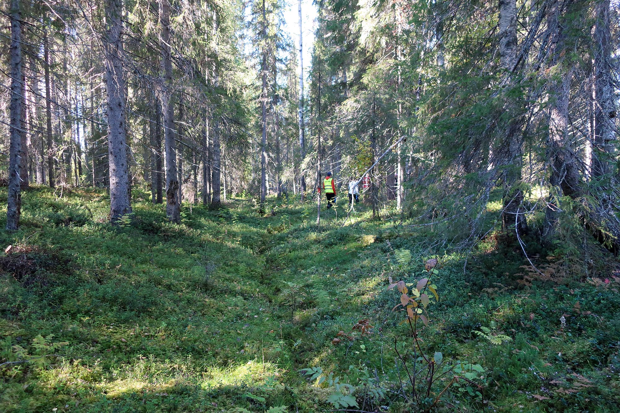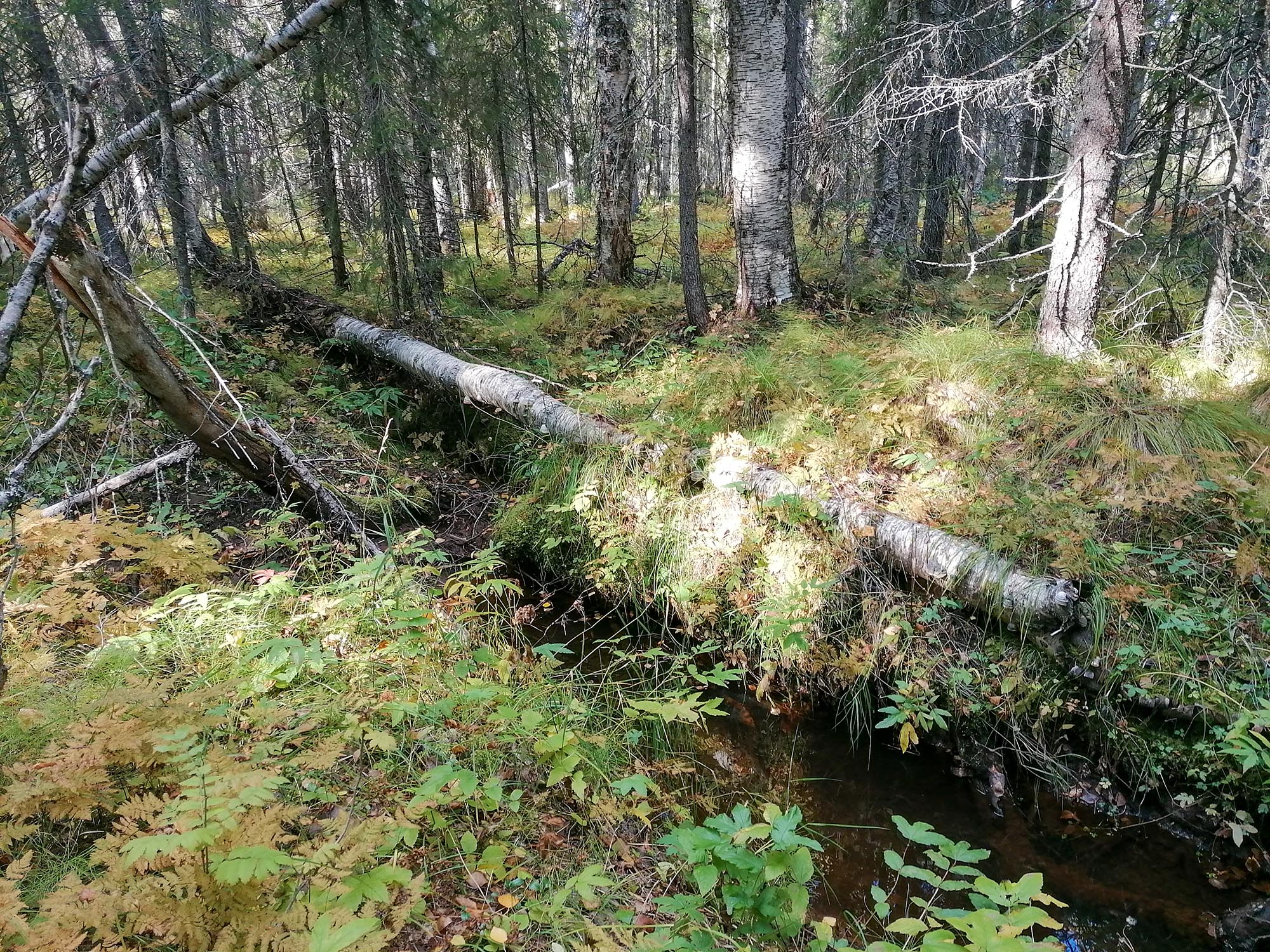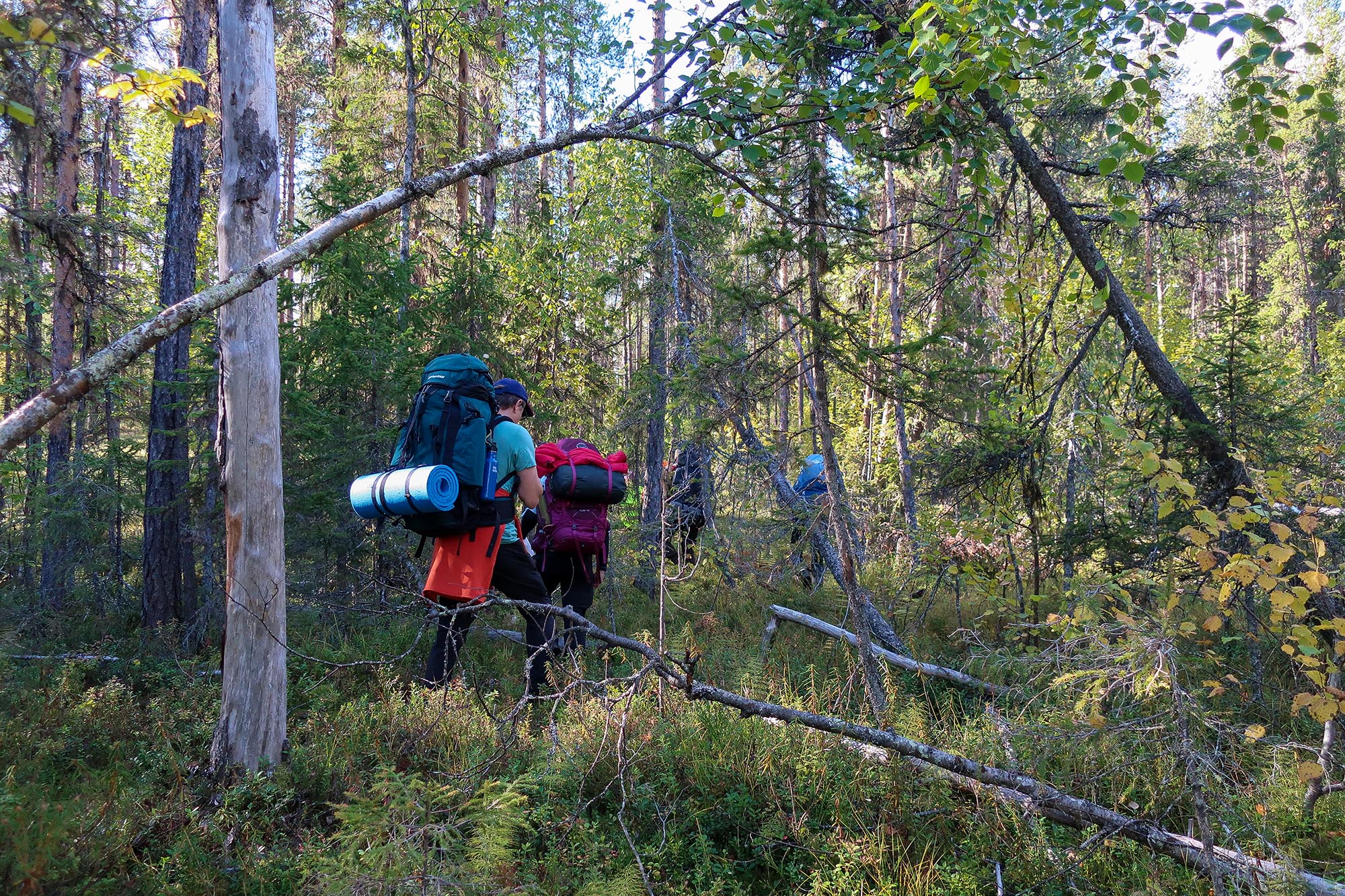 Vi hade alltså avvikit från vår planerade rutt och hade nu två val, att gå tillbaka samma väg vi kom och återgå till den planerade rutten eller försöka gena för att ansluta till den lite längre fram. Optimistiskt tänkte vi att det kan väl inte vara så svårt att gena och vi bestämde oss för att följa bäcken en bit, i alla fram till vägen vi såg fanns längre fram. Med facit i hand var det kanske inte rätt beslut eller i alla fall blev det en upplevelse och utmaning vi inte hade räknat med. Det var snårigt och svårframkomligt på grund av att området utgjordes av gamla kalhyggen som hade börjat att växa igen. Till vår fördel var att det i alla fall var torrt i skogen och det var få partier som var blöta. Det visade sig också att det var längre att ta denna genväg än vi trott eller kanske var det vår packning som gjorde att tempot blev lägre och därför tog det lång tid. Vi korsade även ett sumpskogsparti där vegetationen var hög vilket var det tuffaste partiet för dagen.