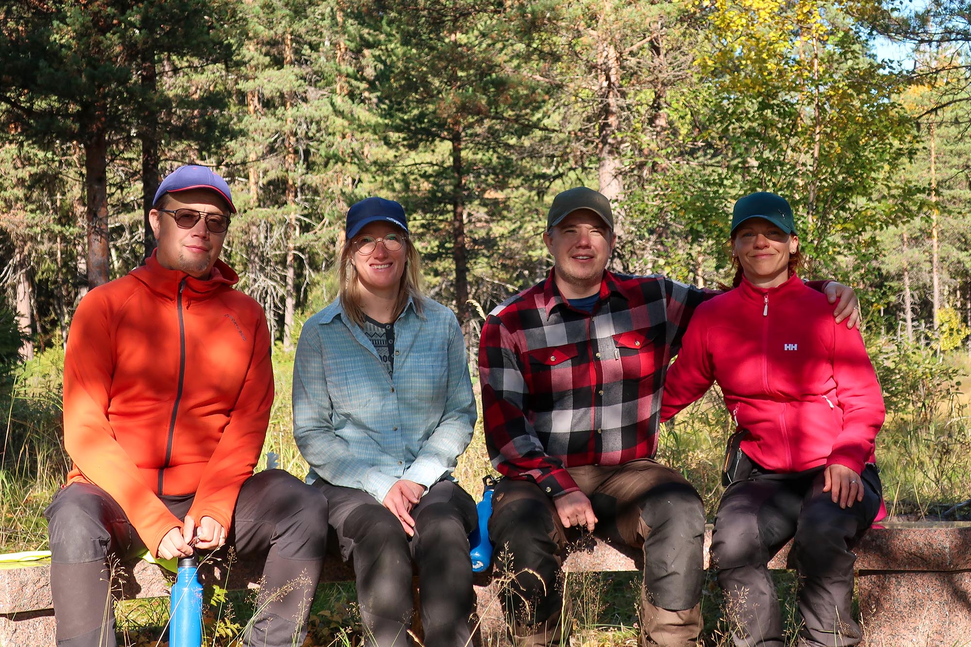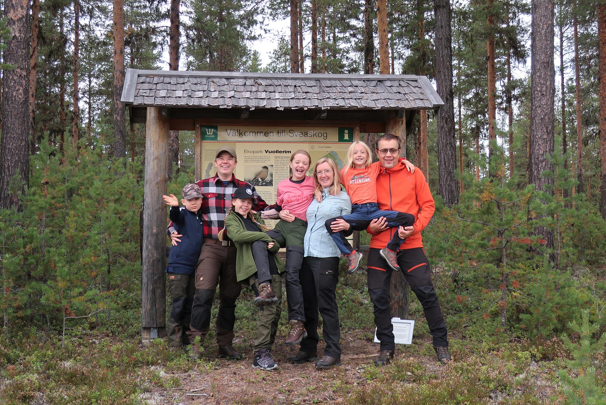 Vi enas om att det här är en bra plats att avsluta vårt äventyr i Vuollerims ekopark och försöker ta en gruppbild med hjälp av kamerans tidsfunktion. Det gick väl si så där då det var svårt att stå stilla så länge och barnens tålamod räcker till två tagningar. Det har överhuvudtaget varit svårt att fotografera ordentligt dessa dagar, de bilder som har tagits har liksom tagits i farten på gående fot och det har mest blivit bilder på naturen.