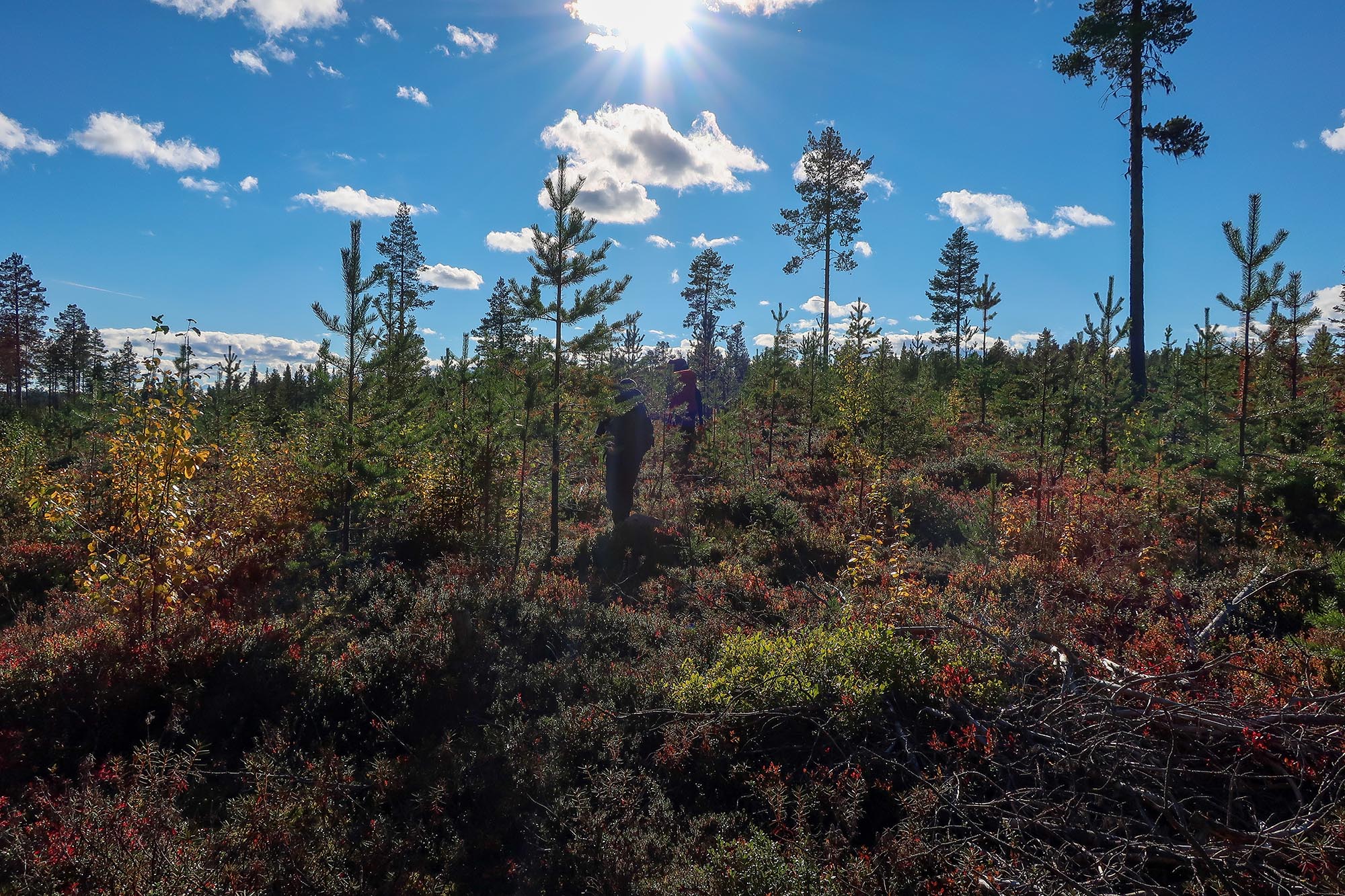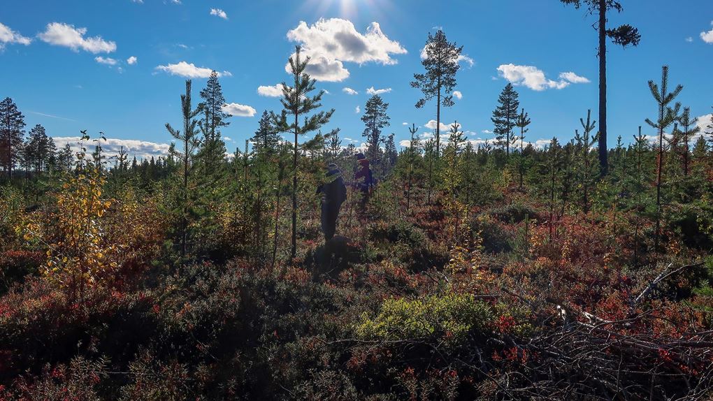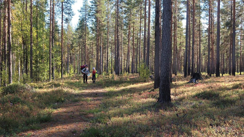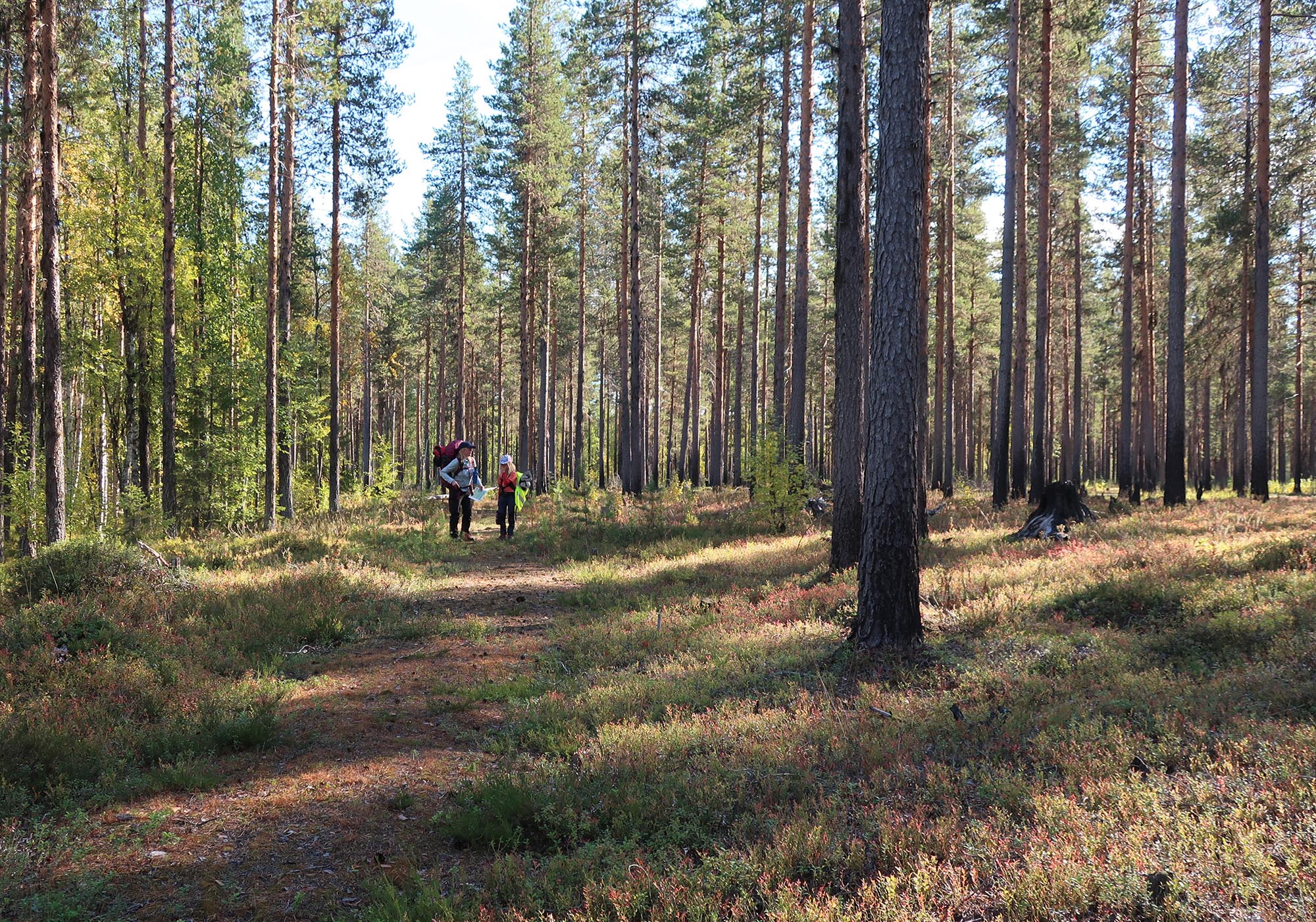 Att hitta en lämplig helg var lättare sagt än gjort och vi ville undvika sommaren och myggsäsongen. Därför gjorde vi vår vandring i början av september och planen var att gå två dagar och övernatta i tält. Vi tittade på kartorna och skissade upp en rutt, pratade sedan med Lars-Göran på Sveaskog för att få lite tips om var det fanns vatten, var det var bäst att tälta och så vidare. Vi reviderade vår planering efter samtalet så det var bra att ha någon att bolla idéer med. Vi tänkte utgå från spegeldammen och först följa parkens södra sida, sedan snedda igenom och nå Padjerimberget, som egentligen inte ligger i ekoparken, och tälta någonstans däromkring. Den andra dagen skulle vi gå tillbaka och börja med Kainoberget och därefter gå genom den nordöstliga delen av parken för att komma tillbaka till spegeldammen. Det var vår plan.