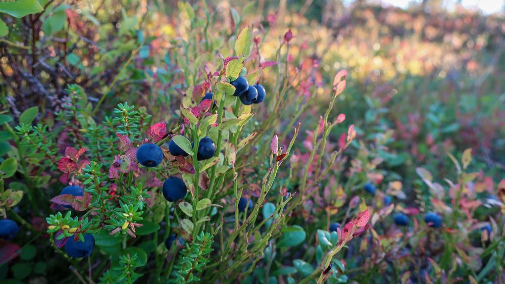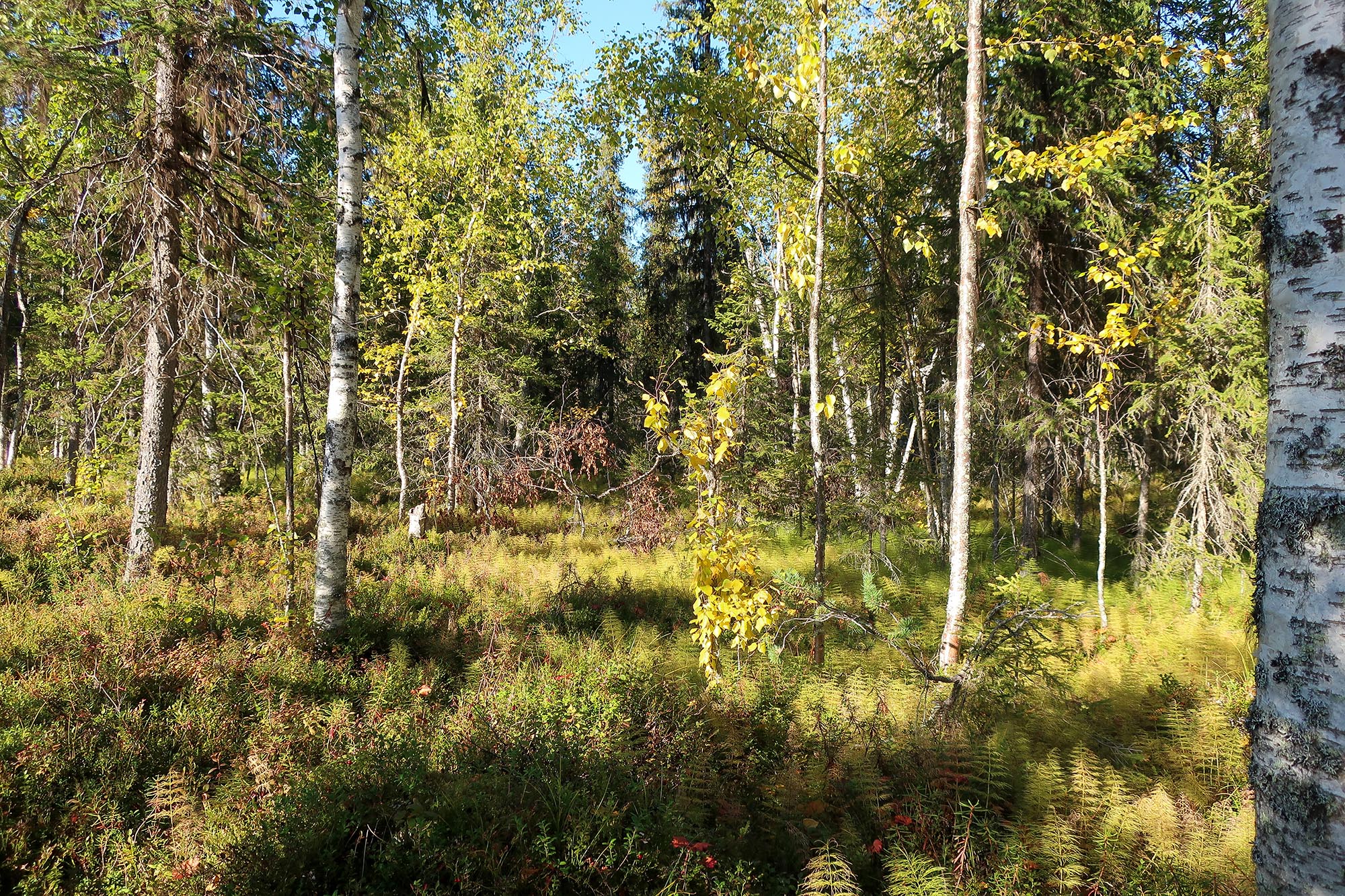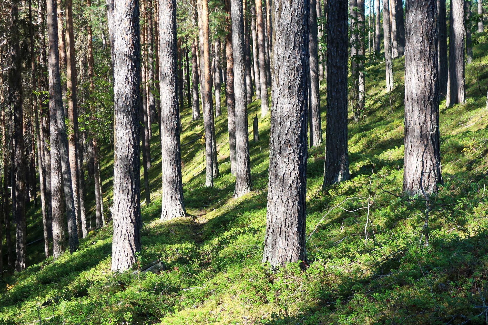 Gamla granar och tallar, asp, björk och sly. Trollska gammelskogar, tallheden och myrmarker. Blommorna hade sedan länge vissnat men ersatts av bär; stora saftiga blåbär och klarröda lingon. Vi såg nog det mesta som platsen har att erbjuda i den del av parken vi vistades. Nu gick vi aldrig direkt igenom tallheden som vi tänkt men vid sidan av den. De platser som erbjöd starkast känsla av orörd skog var områdena kring bäcken och nere längs stigen till stenbänken. Där var det lummigt och kändes som att naturen höll på att ta över, växterna höll på att utplåna stigar och andra tecken på mänsklig närvaro.