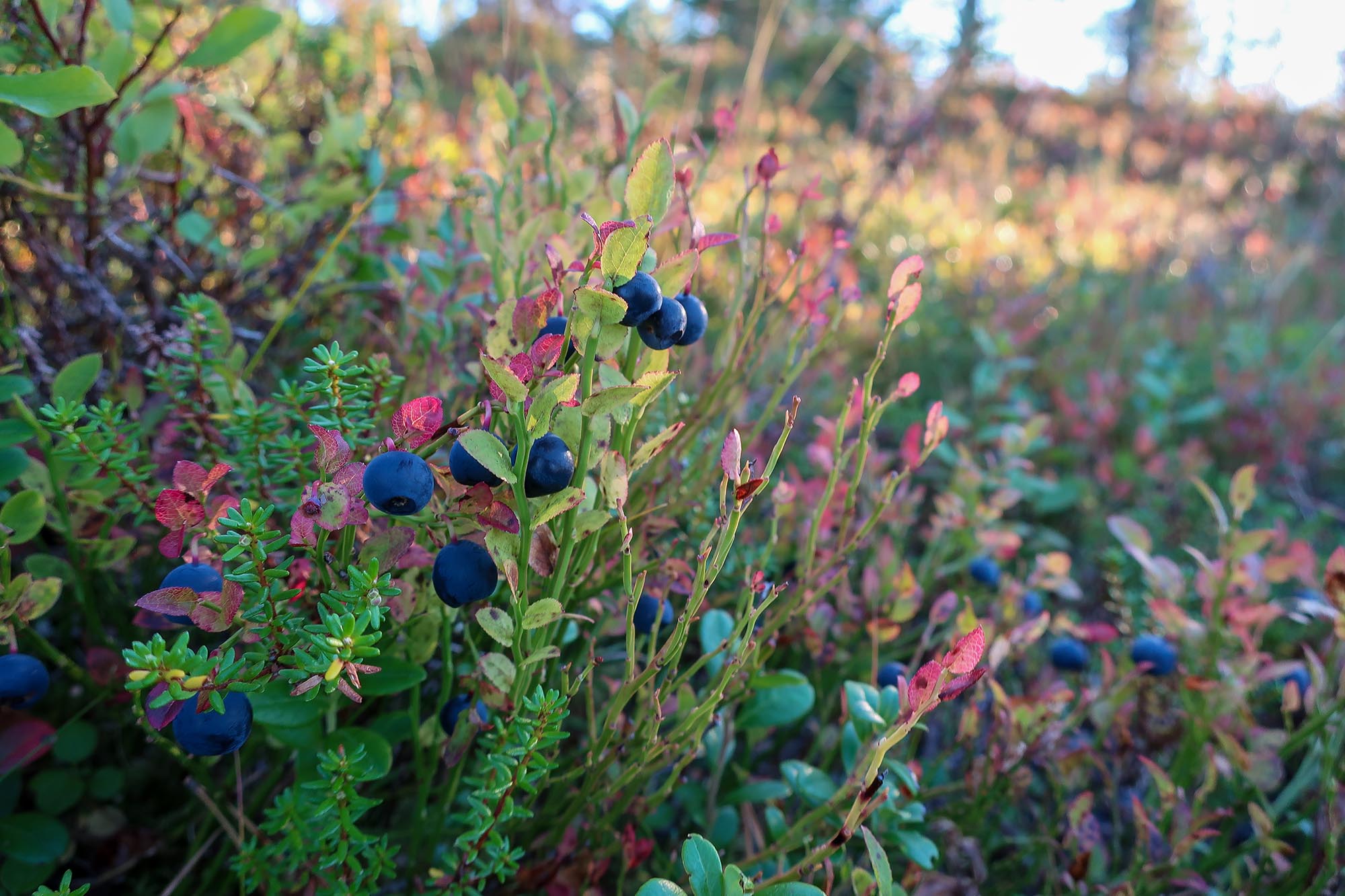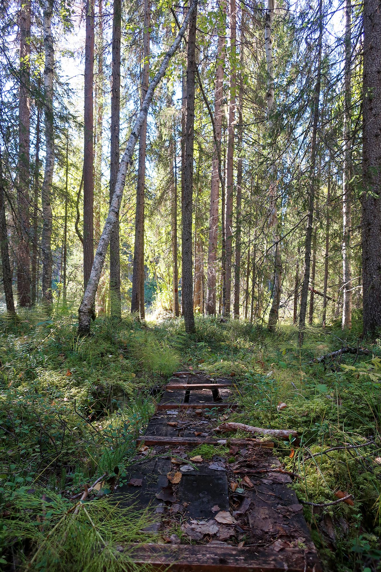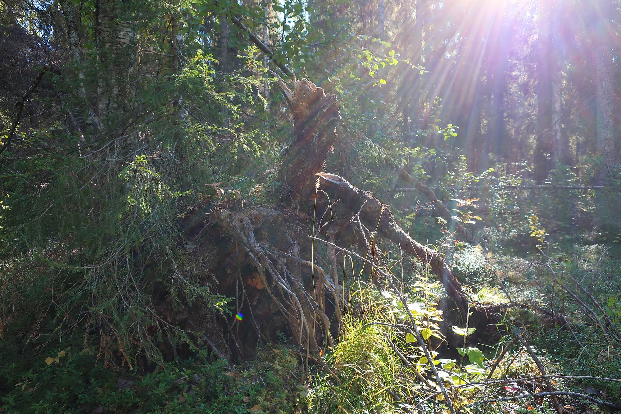 Gamla granar och tallar, asp, björk och sly. Trollska gammelskogar, tallheden och myrmarker. Blommorna hade sedan länge vissnat men ersatts av bär; stora saftiga blåbär och klarröda lingon. Vi såg nog det mesta som platsen har att erbjuda i den del av parken vi vistades. Nu gick vi aldrig direkt igenom tallheden som vi tänkt men vid sidan av den. De platser som erbjöd starkast känsla av orörd skog var områdena kring bäcken och nere längs stigen till stenbänken. Där var det lummigt och kändes som att naturen höll på att ta över, växterna höll på att utplåna stigar och andra tecken på mänsklig närvaro.