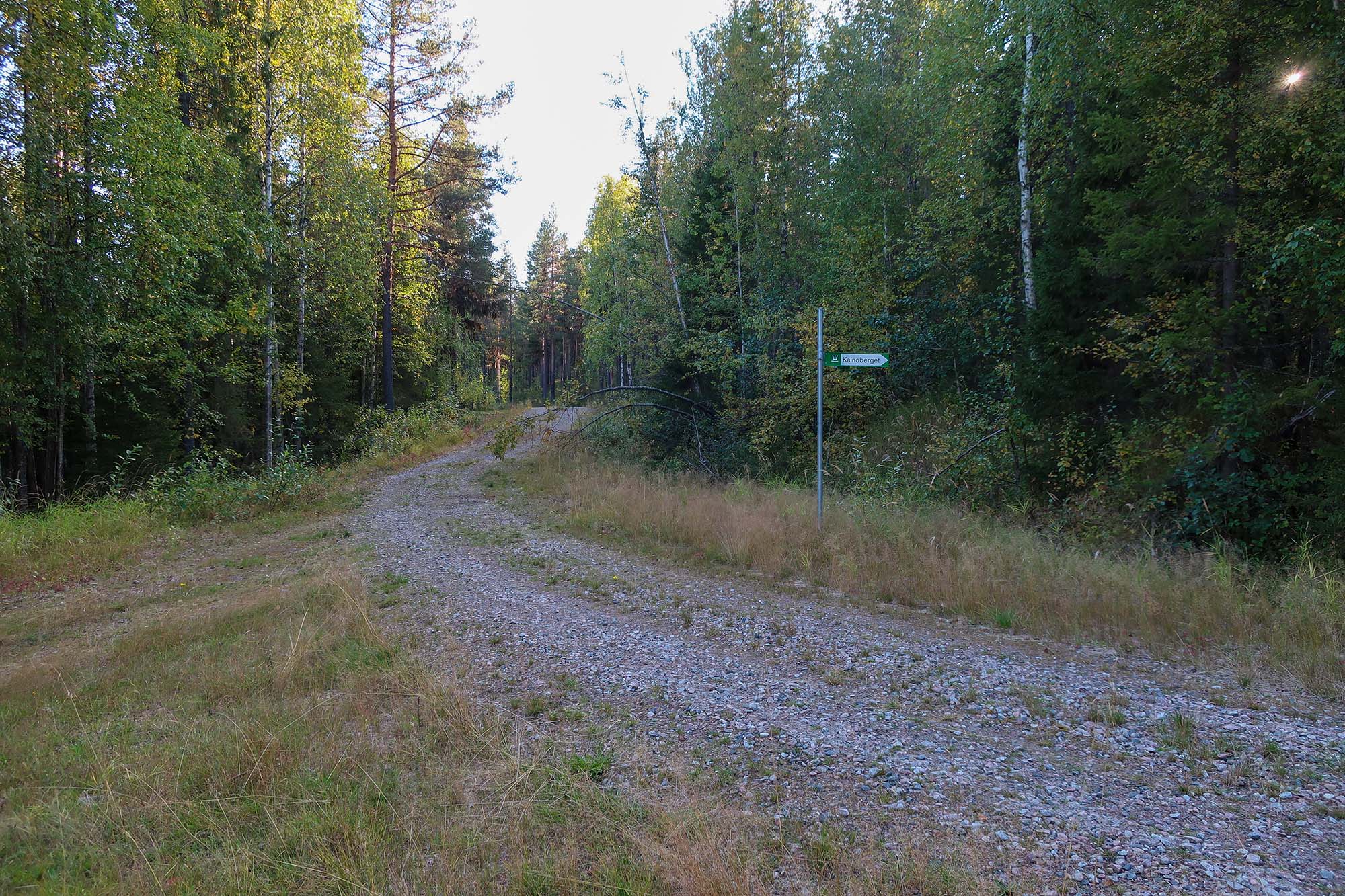 Nere vid korsningen åt vi mackor och kex, fyllde helt enkelt på med lite energi, för att sedan gå längs den andra vägen, vägen som faktiskt gick till Kainoberget. Vi kom fram till vändzon som idag har vuxit igen med gräs. I änden på det öppna området som har skapats fanns en ny skylt som pekade mot berget. Det fanns inte någon utmärkt stig men vi hittade en öppning mellan träden som skulle kunna ha varit en stig tidigare och följde den. Snart såg vi berget framför oss. Joel och Glenn hade inte kommit tillbaka ännu och vi bestämde oss för att gå upp nu eftersom barnen var peppade på det.