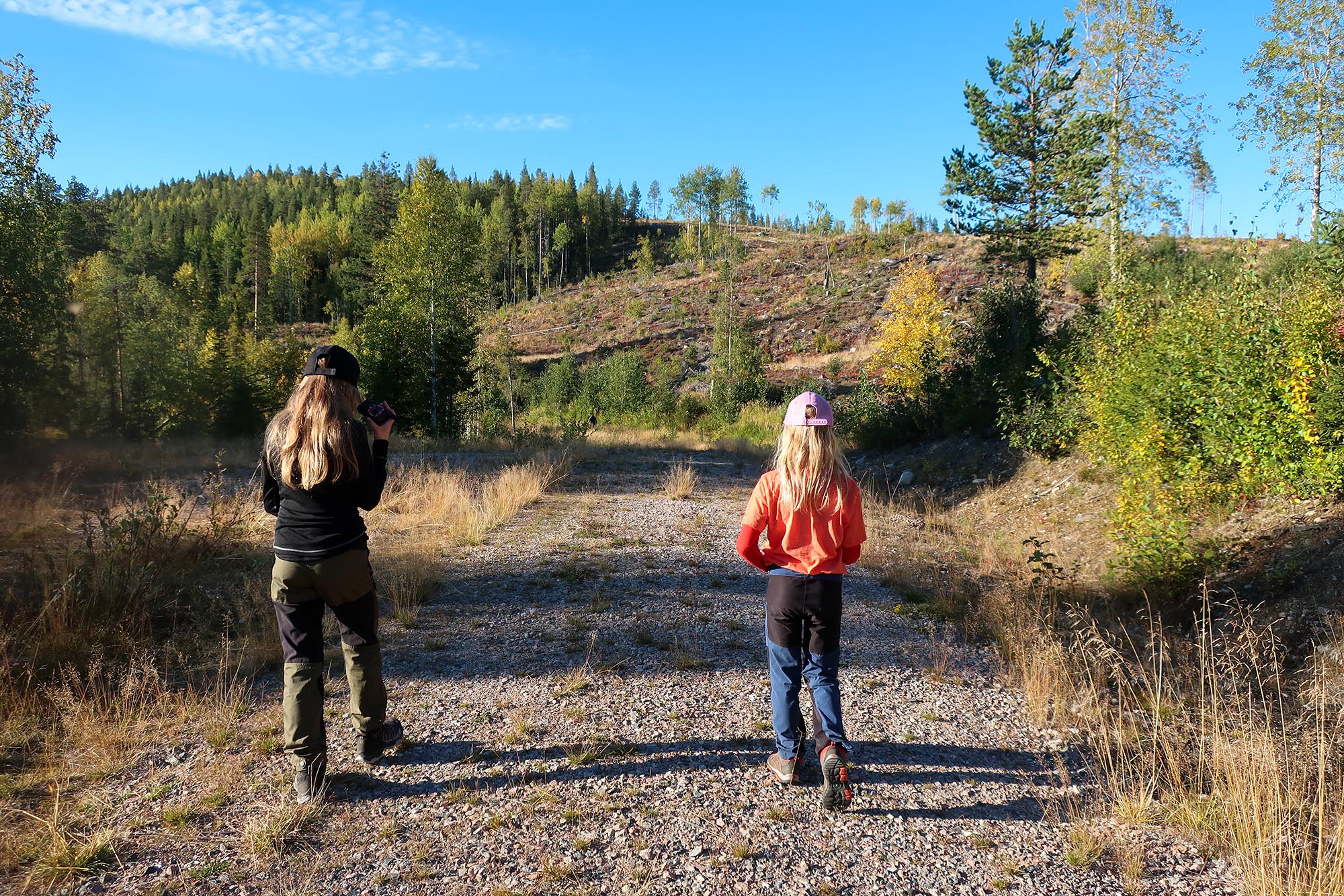 Till sist kom vi ut på en skogsväg och kunde pusta ut. Solen sken och höstdagen var varm men tyvärr kom även våra kompisar, knotten, till vår samlingsplats så det blev inte någon lång paus utan vi fick raskt sätta oss i rörelse igen. Vid det här laget började vi vuxna inse att insekterna var ett problem och fortsatte det så här skulle vi kanske få tänka om och kanske göra två dagsutflykter i stället för att övernatta. Vi vill att barnen ska tycka det är roligt att vara ute i skogen och sånt kan förstöras om det blir för mycket knott eller mygg. Men eftersom barnen ville övernatta pratade vi inte om det på allvar ännu utan vandrade vidare.