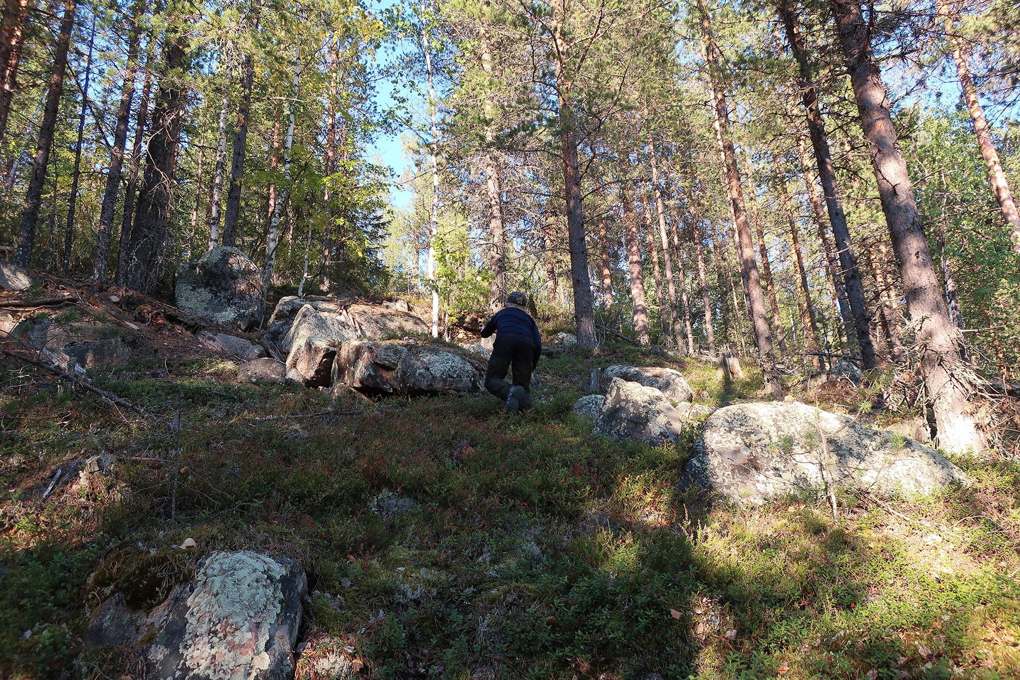 Innan vi hann börja klättra uppåt ringde Glenn och berättade att de packat in väskorna i bilarna. Maria berättade om den öppna ytan och vägen så de skulle försöka köra fram till vändplatsen. De får köra försiktigt då vägen inte är röjd och det skjuter upp sly här och var. Vi andra tar oss an branten uppåt på bästa möjliga sätt. Vi fick klättra lite och zick-zacka mellan stenar och klippblock, levande träd och liggande murkna trädstammar. Däremot blev det en viss besvikelse då vi kommer upp för det var igenvuxet och det var bara på vissa ställen vi kunde få glimtar av utsikten. Vi tog lite foton, åt mer av de saftiga blåbären och började sedan gå neråt med försiktiga steg.