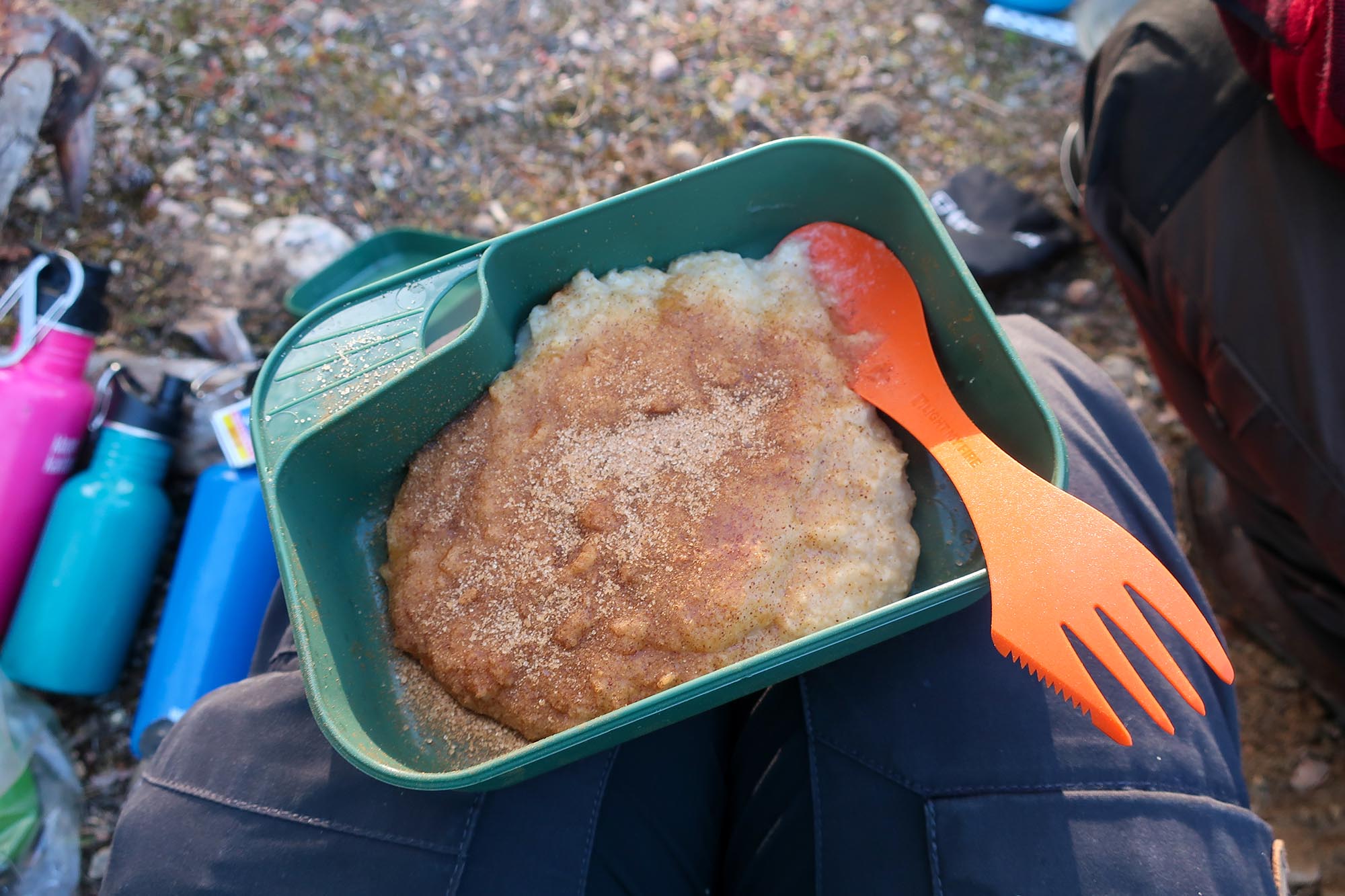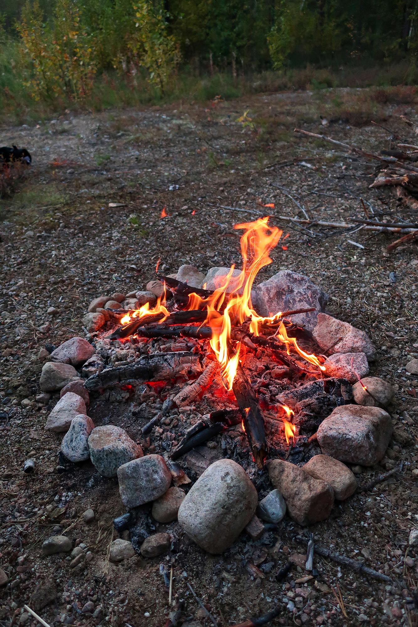 Glenn och Joel hade byggt en lägerplats av några plankor som de hittat och gjort upp en eld. Det var skönt att få sätta sig ner och pausa medan elden höll knotten på avstånd. Klockan närmade sig 18.00 och det började vara middagstid. Barnen samlade torra pinnar till elden och vi vuxna tog itu med matlagningen, plockade fram gasköken och kokade vatten till våra portioner med frystorkad spagetti bolognese.