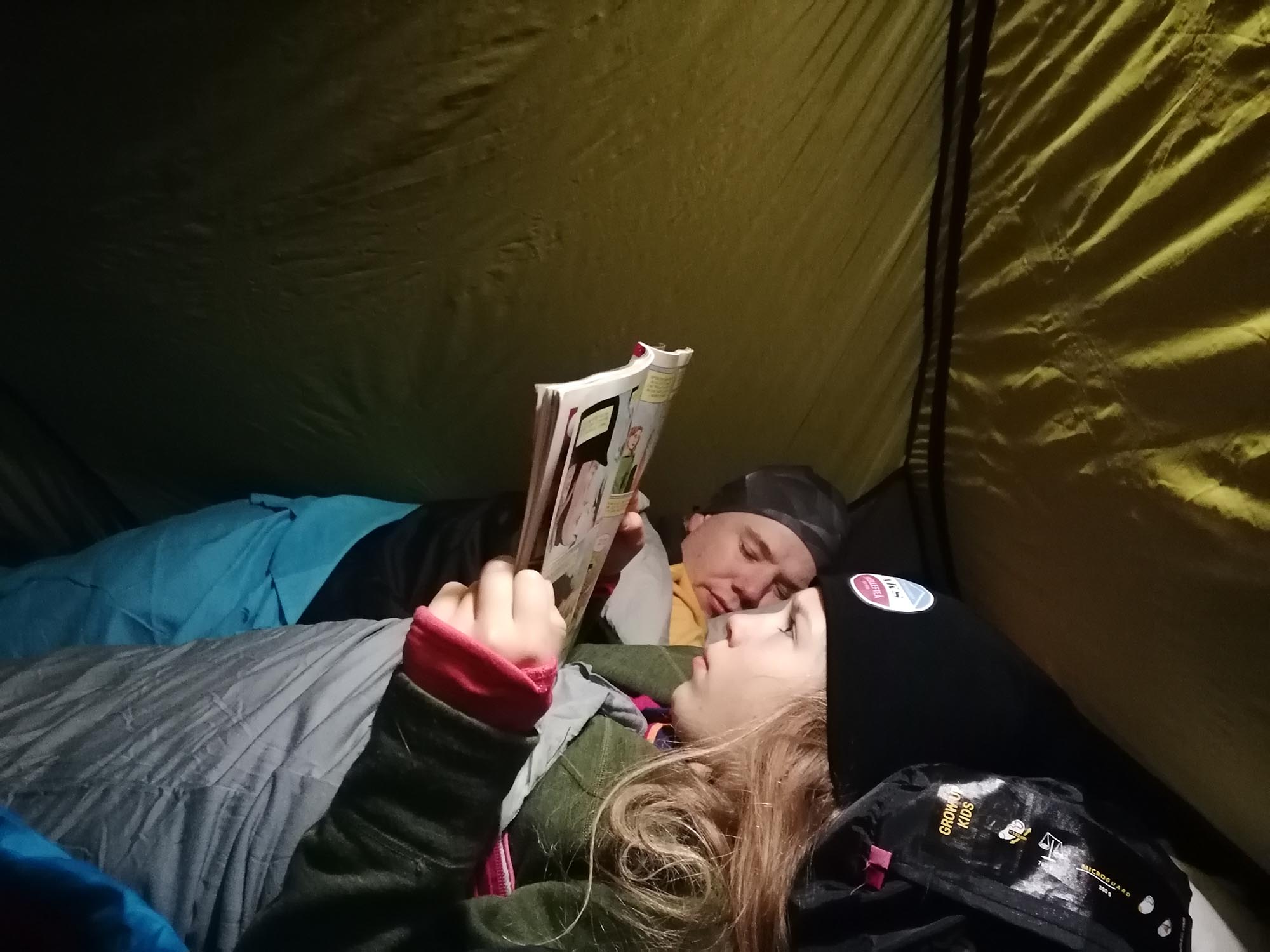 Vid 21.30 tiden är det dags att göra sig klara för natten. Vi bytte om till våra varma underställ, borstade tänderna och kröp in i tälten. Barnen hade tagit med tidningar och låg och läste en stund innan vi släckte för natten.